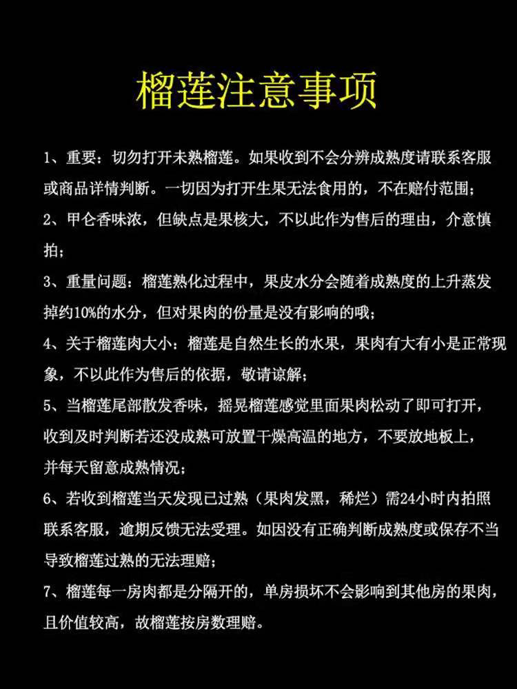 榴莲收到留好面单,属于后熟果,千万没熟不要生劈。生劈或自己放到熟过产地都是下包售后的!