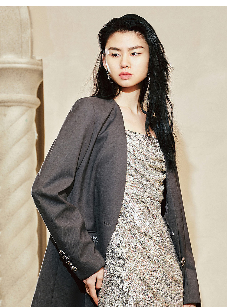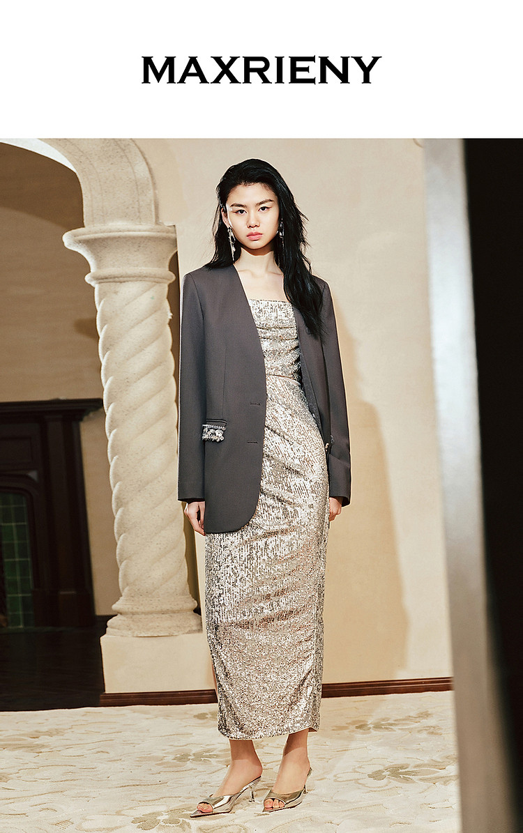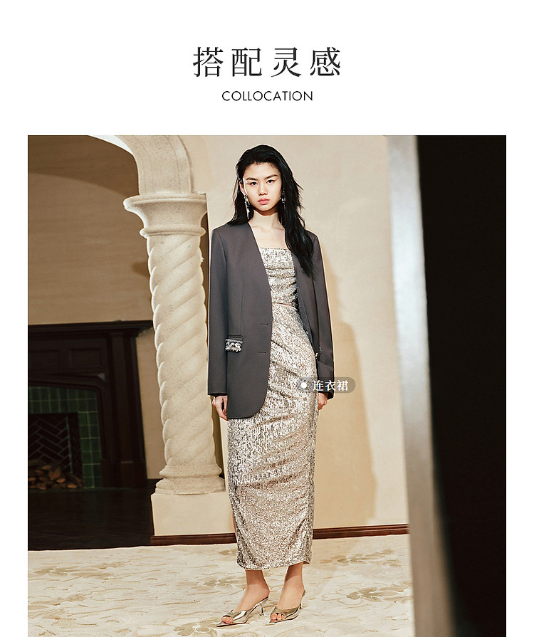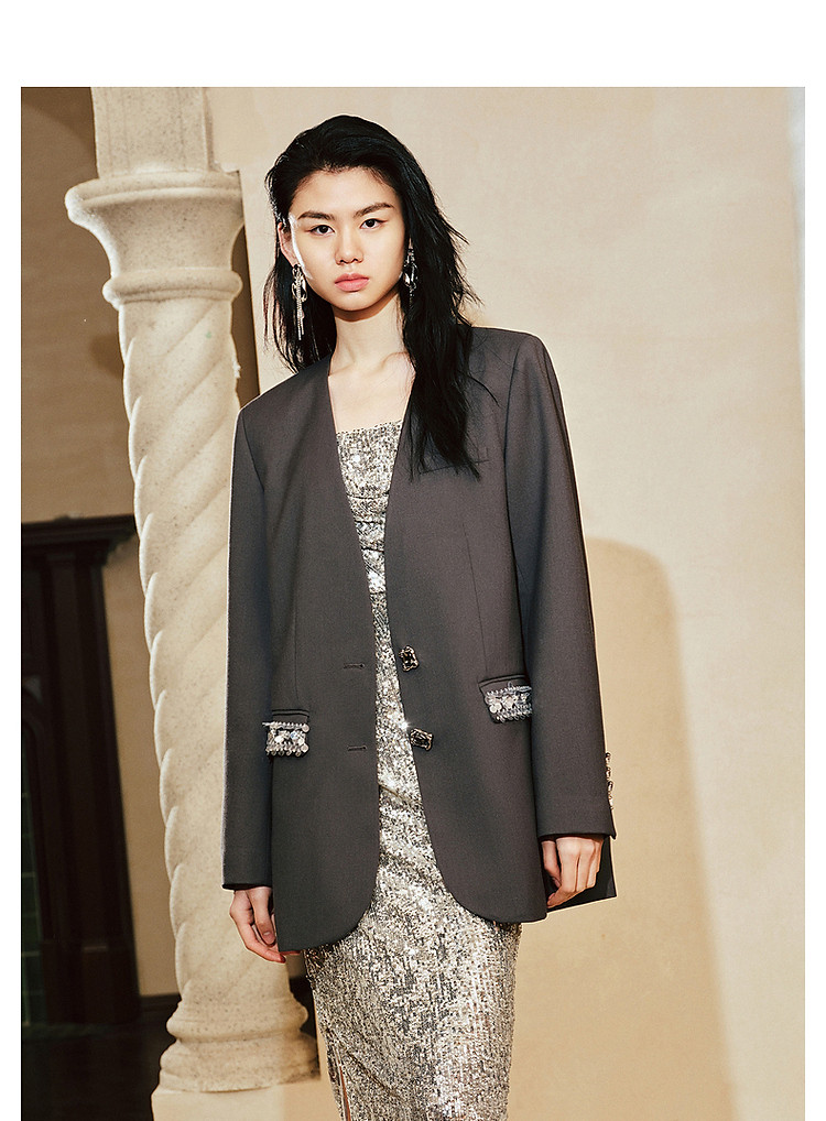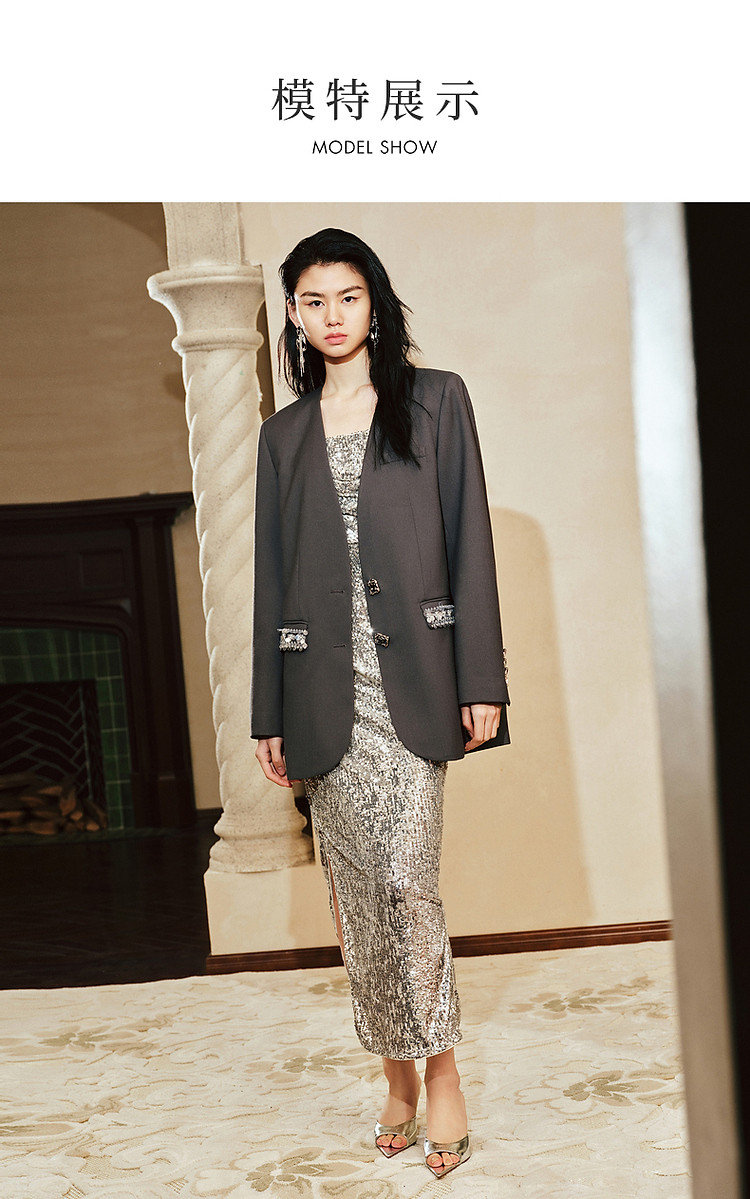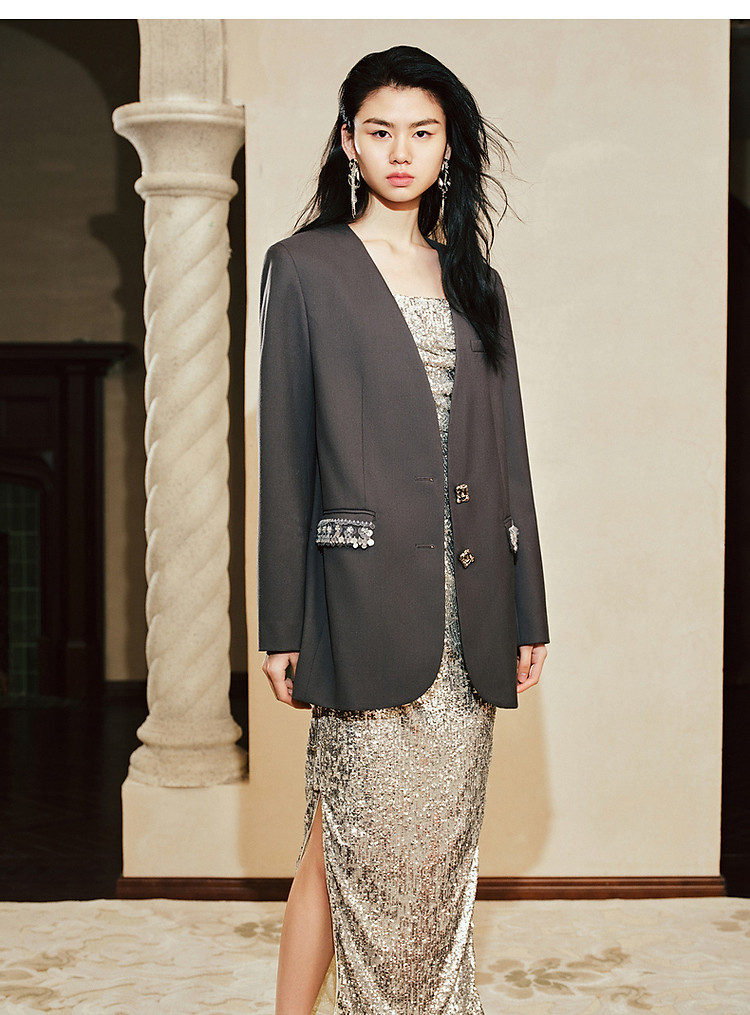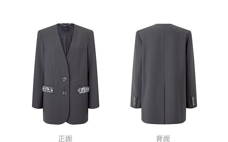 都市奢华感无领亮片装饰廓形西装外套(货号:MC85JA056A8002)