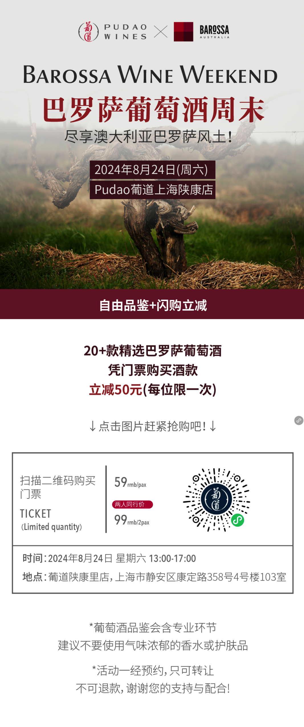 (20+款精选巴罗萨葡萄酒,凭门票购买酒款,立减50元,每位限一次)