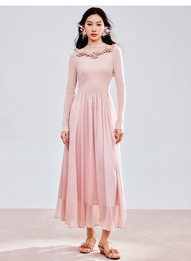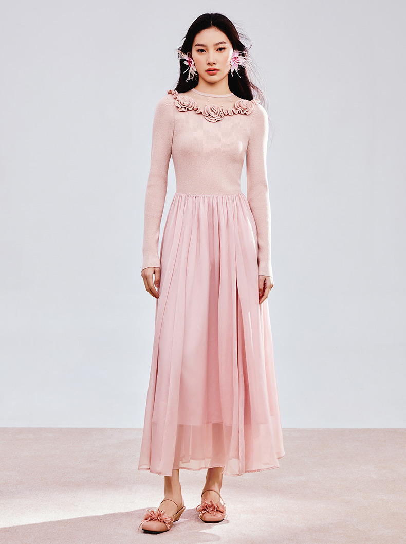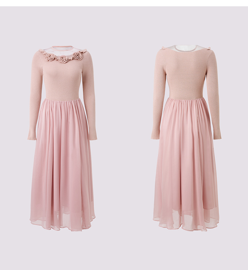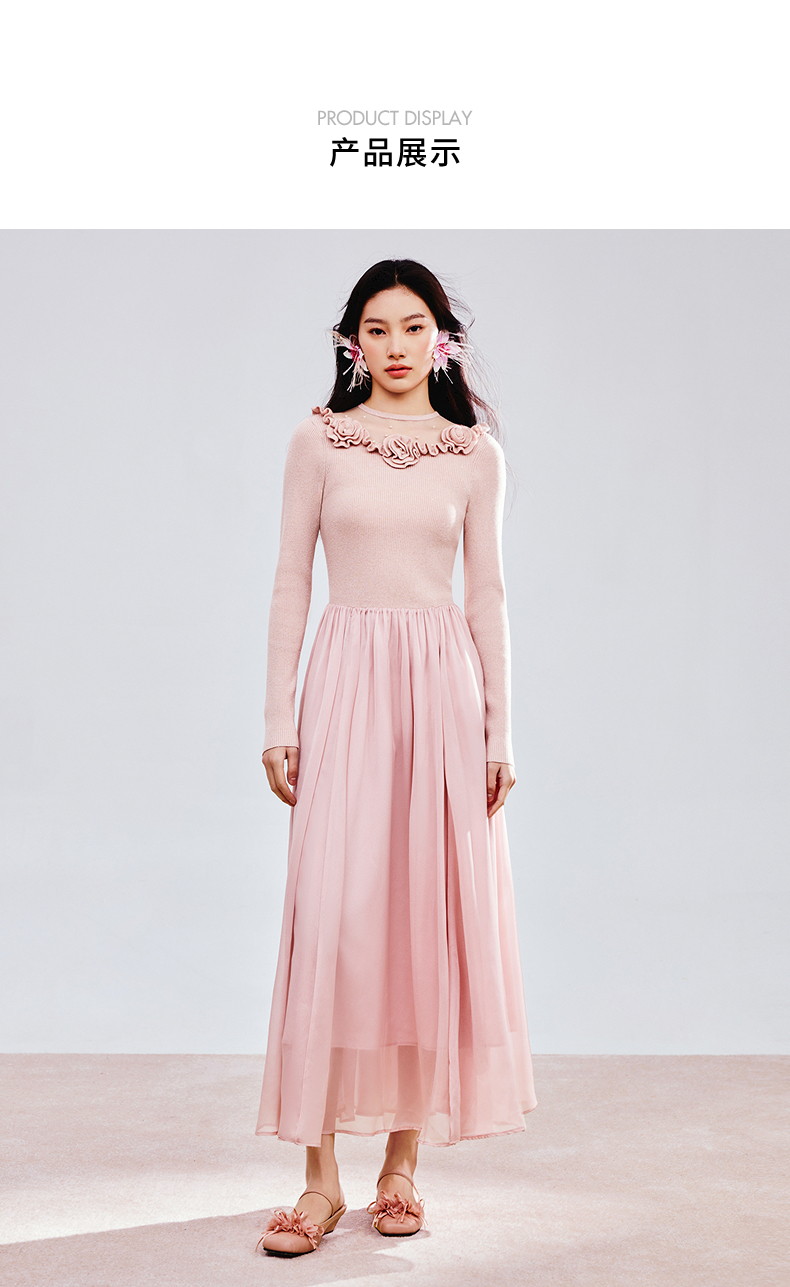 MAXRIENY春日复古优雅浪漫温柔风2025春季新款玫瑰网纱装饰连衣裙(货号:MS85DR774)