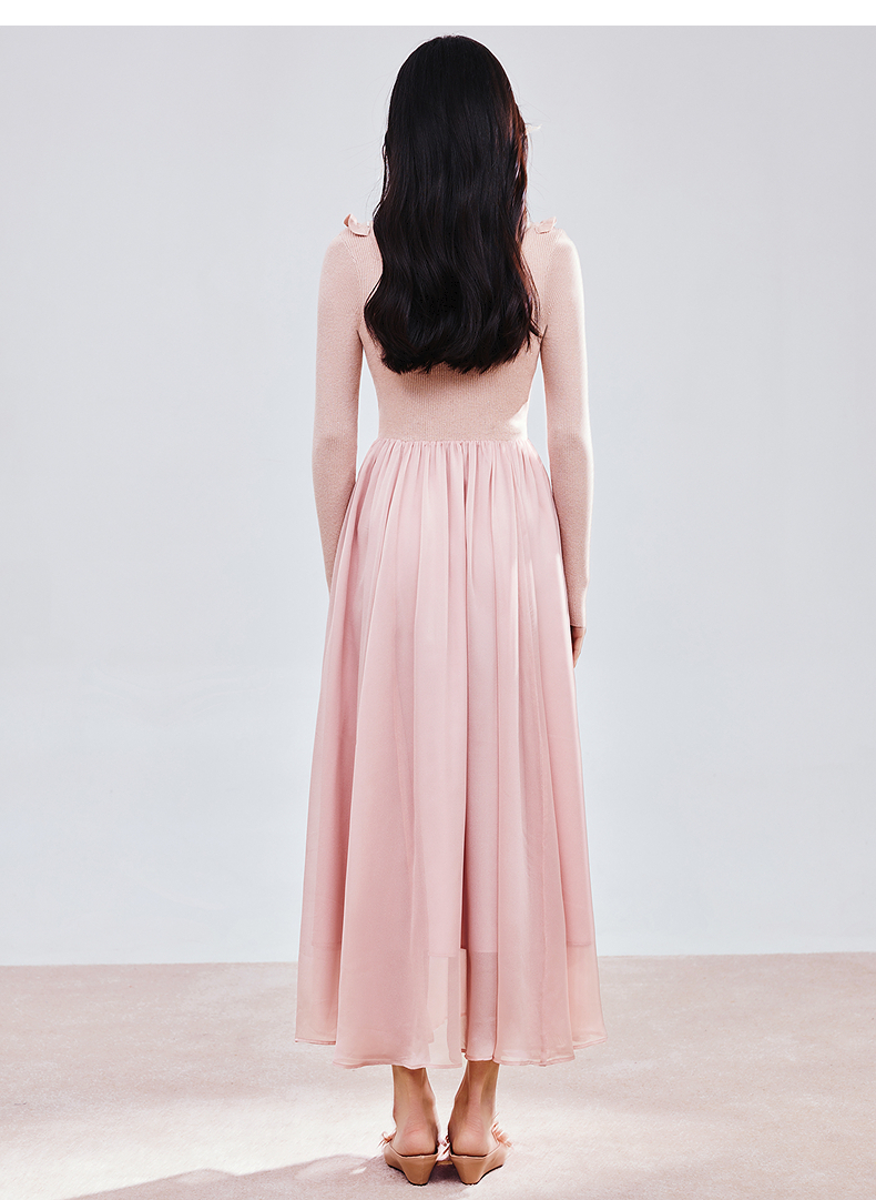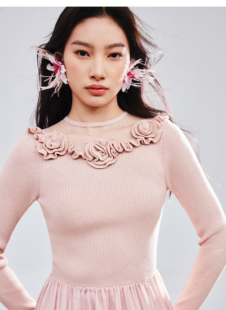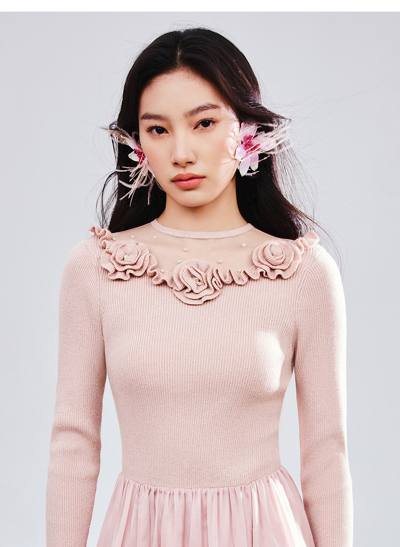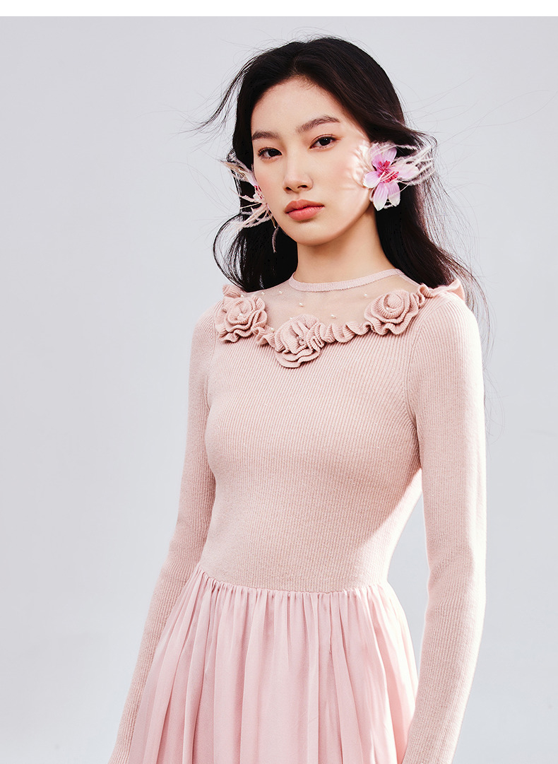 MAXRIENY春日复古优雅浪漫温柔风2025春季新款玫瑰网纱装饰连衣裙(货号:MS85DR774)