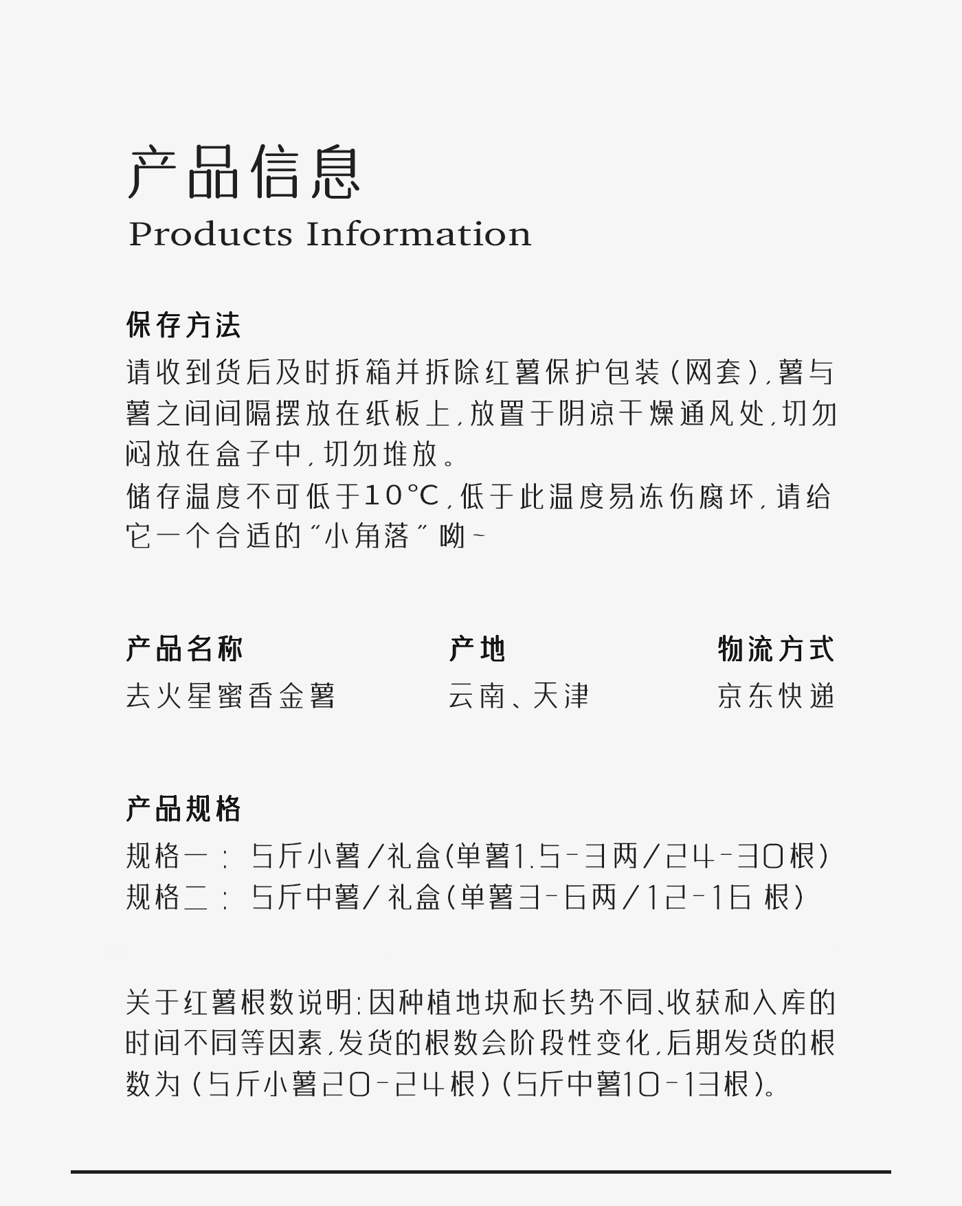 品名:河北蜜香金薯 规格1:3斤中小果彩箱装(约12~16根;以重量为准) 规格2:5斤小果礼盒装(约20~28根;以重量为准) 规格1:5斤中果礼盒装(约12~16根;以重量为准);拍几份发几个包裹,不一定能同时到达,请耐心等待 发货地/产地:河北 包装方式:彩箱装 物流信息:默认顺丰/京东快递,不支持指定快递 发货区域:新疆、西藏、内蒙、甘肃、宁夏、青海、海南、云南、黑龙江、吉林、辽宁不发; 物流详情:周六、周日及节假日除外,正常48小时内发货,到货时间约为2~5天,请耐心等待 售后说明:收到货后有质量问题,在24小时内都可以拍照(坏品+快递单面箱子一起拍)上传,申请按坏品比例理赔或联系客服,生鲜性质特殊,不支持7天无理由退换货;因地址错误,手机号联系不上,拒收等造成的损失无法售后,请理解; |