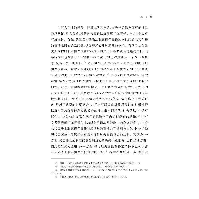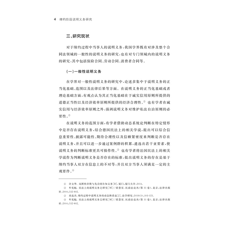 本书以缔约阶段说明义务为研究对象,首先在合同自由从形式自由转向实质自由的背景下讨论说明义务的理论基础;然后在私法自治的原则下明确说明义务的发生的例外性,并结合相关的学说及判例提出判断说明义务是否发生的一般性标准,并在合同标的物、合同当事人以及合同实现三个方面对说明义务的范围进行类型化。最后通过构建违反说明义务时的责任体系,来解决在违反缔约阶段说明义务情形缔约过失责任、瑕疵担保责任以及恶意欺诈等规则的适用关系问题。