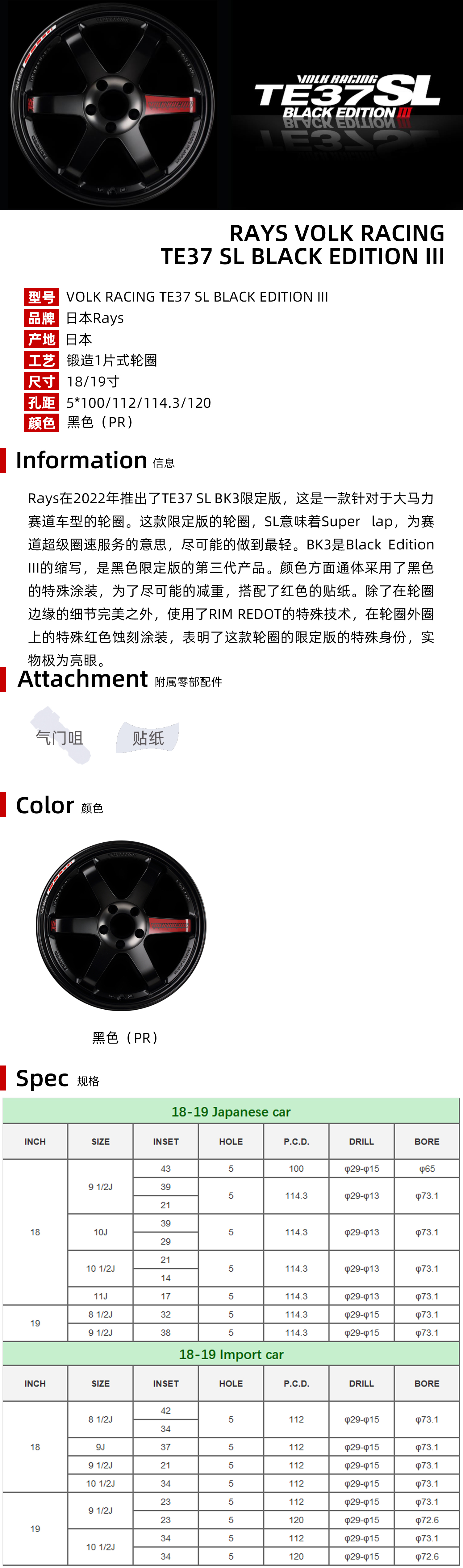RAYS VOLK系列 TE37 SL BK3 轮圈 18/19寸 5*100/112/114.3/120