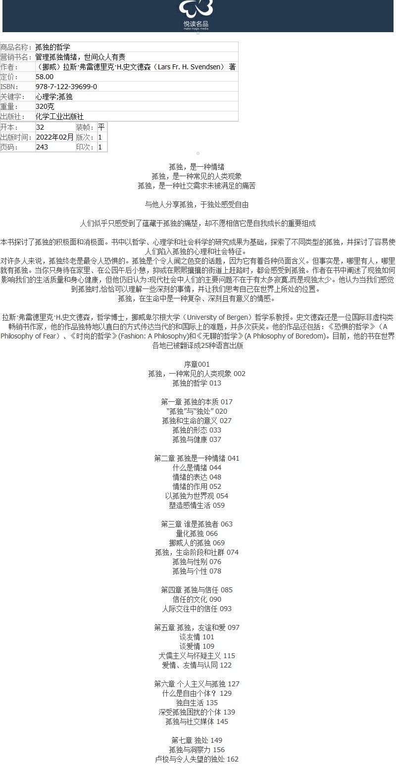 孤独的哲学 孤独心理学 社交力心理成长书籍 孤独的哲学社会学 个人自我价值体现成长励志书籍 孤独的积极面和消极面 孤独的本质 无 化学工业出版社 9787122396990