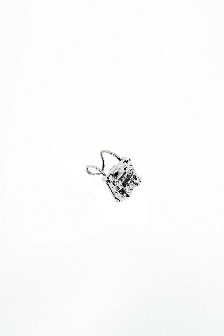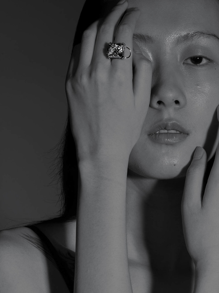 采用特殊工艺 ,于环保合金温度处于熔点液态时使其自体凝结;利用表面自然的 "呼吸纹路" 模拟宝石光泽。镶嵌于宝石底托,与开口纯银戒圈相结合;纯银戒托可微调尺寸。