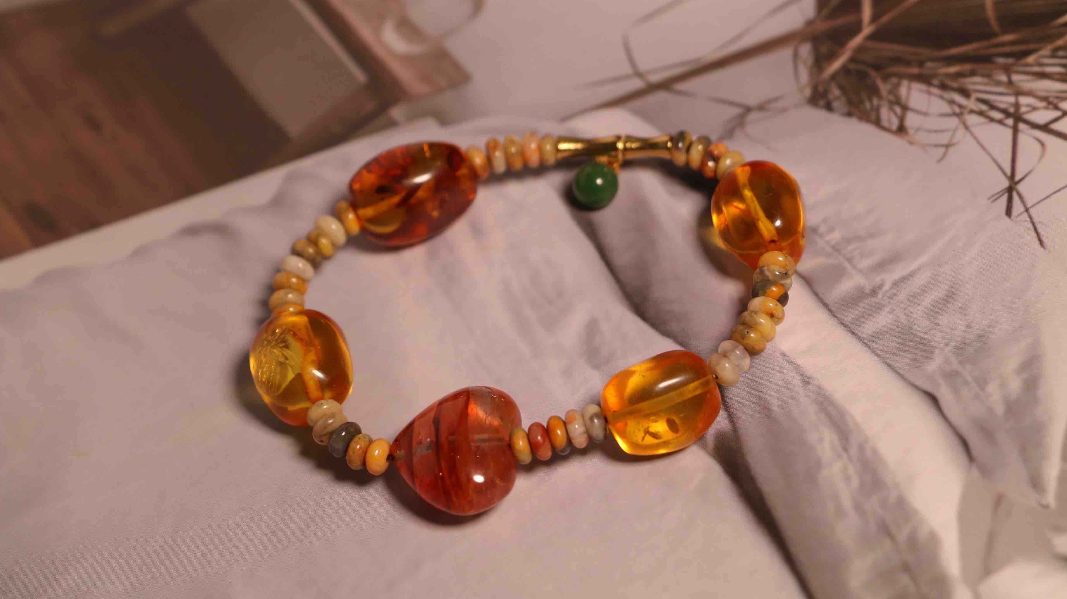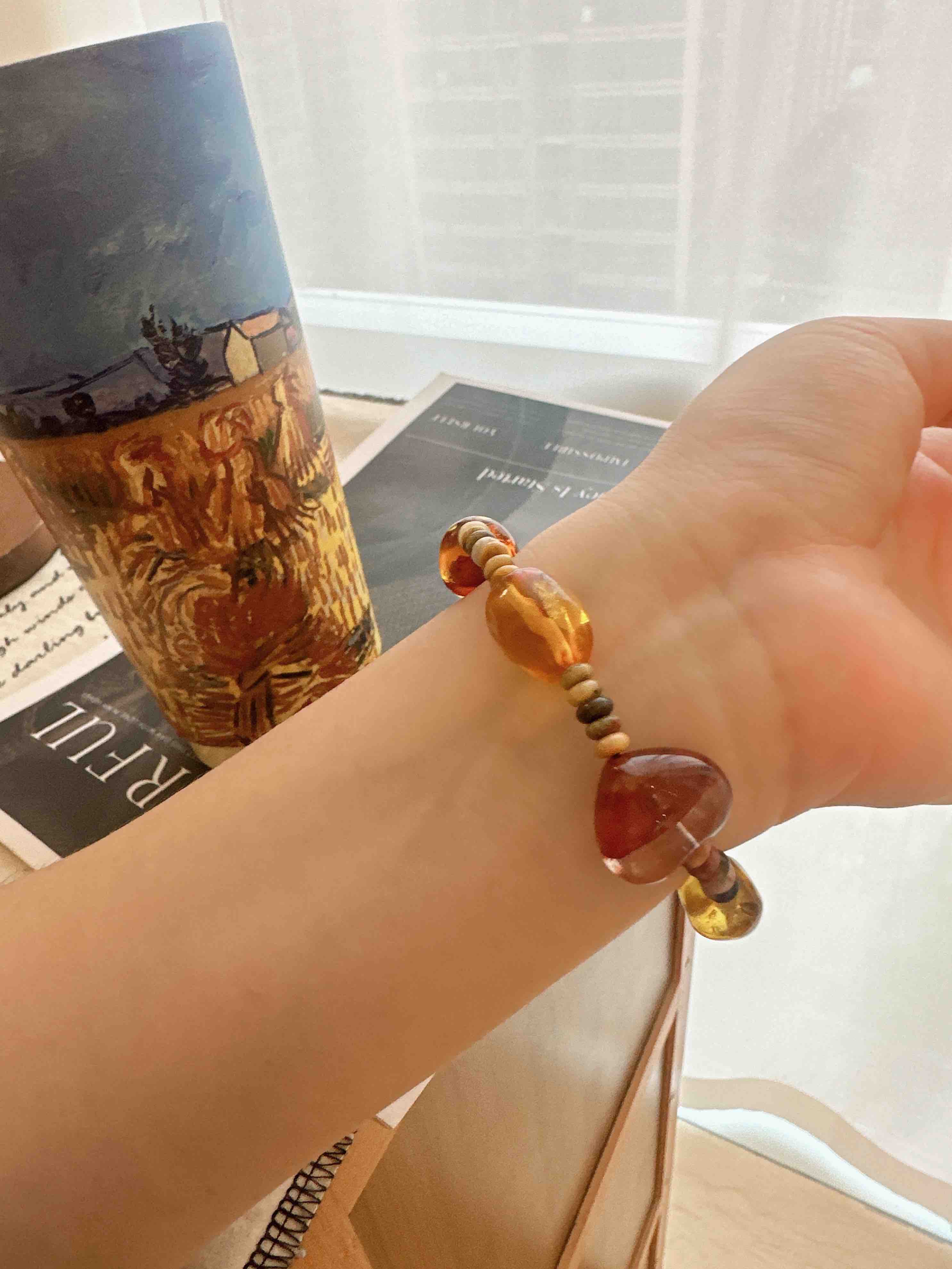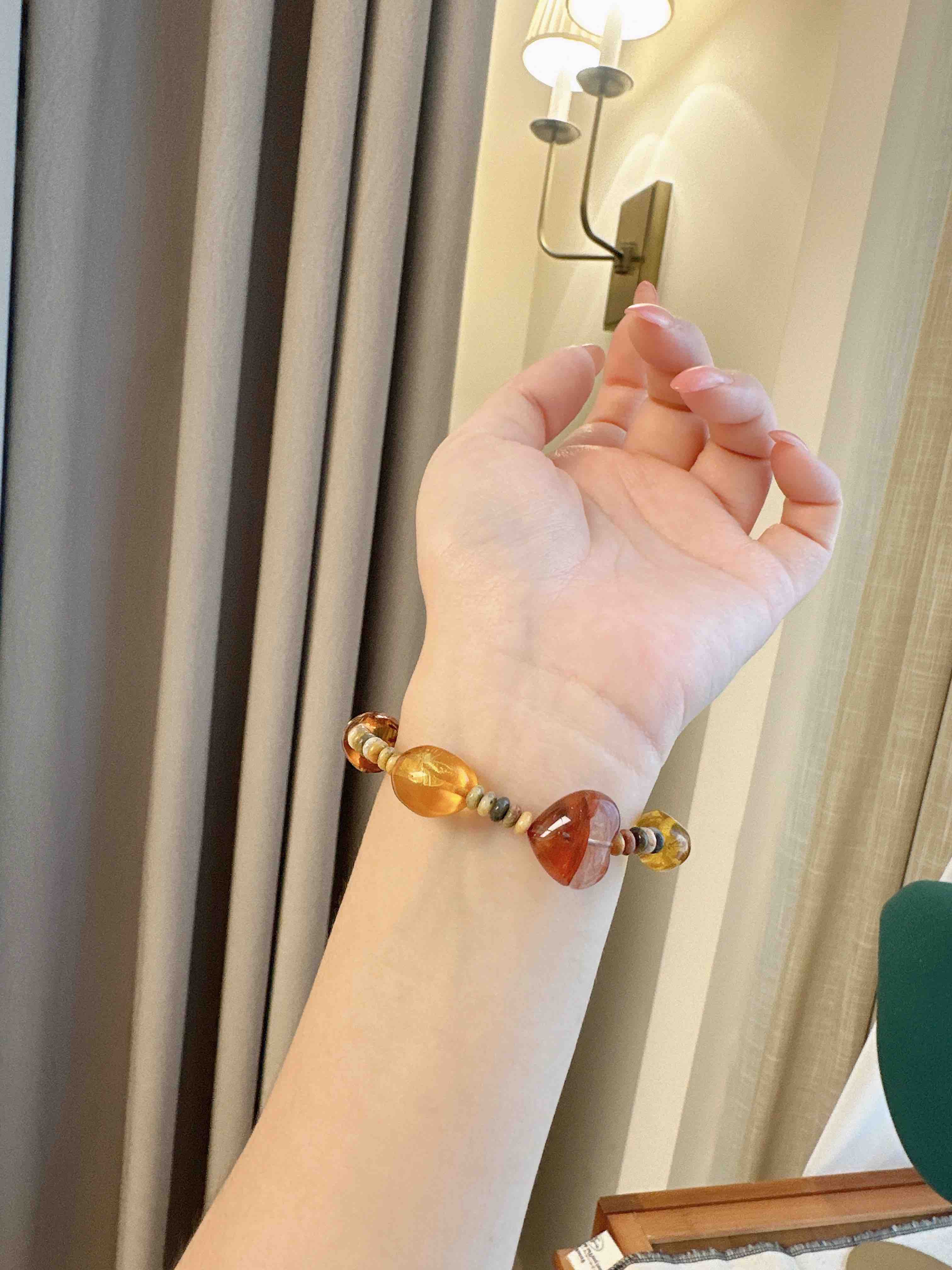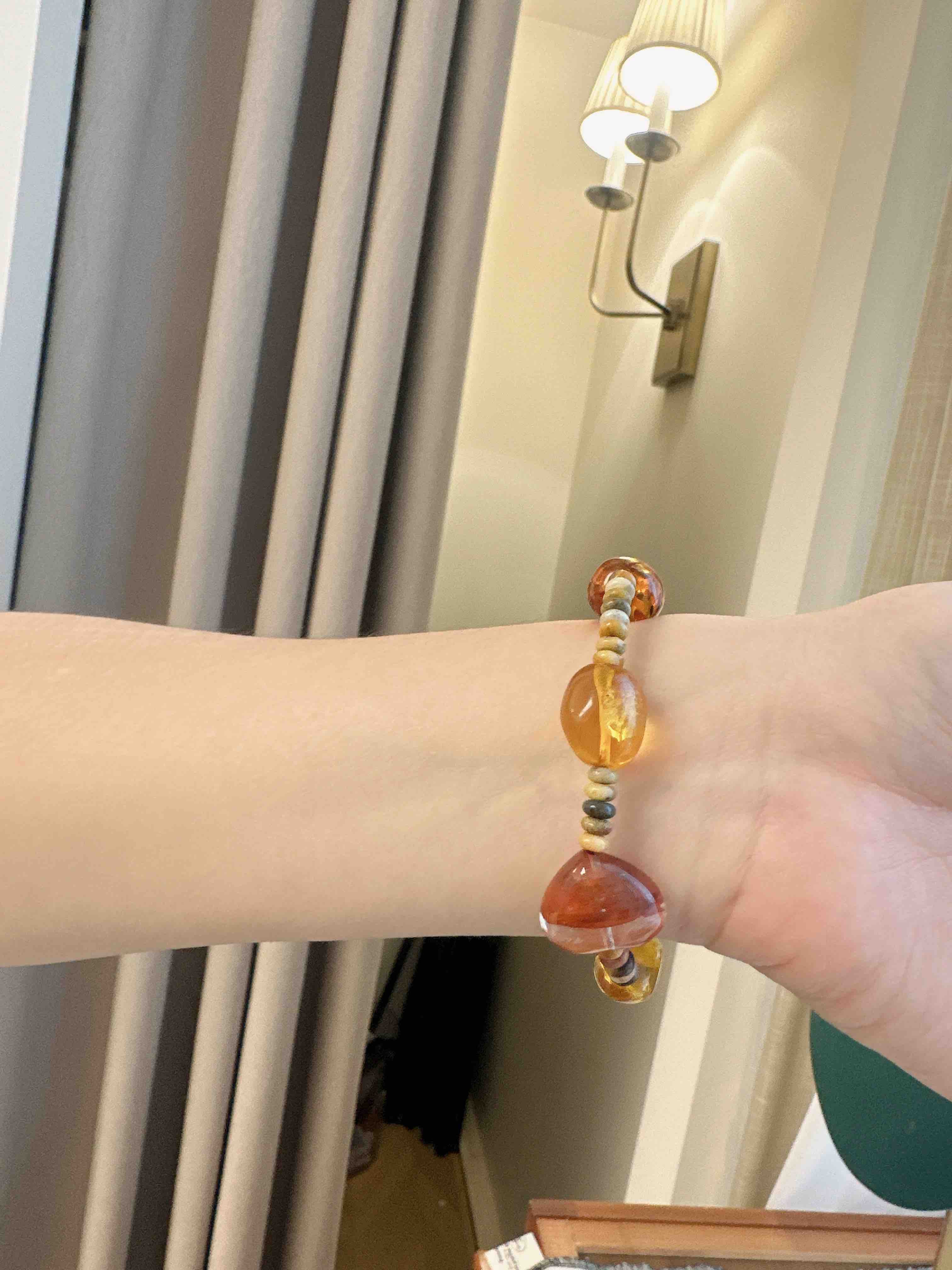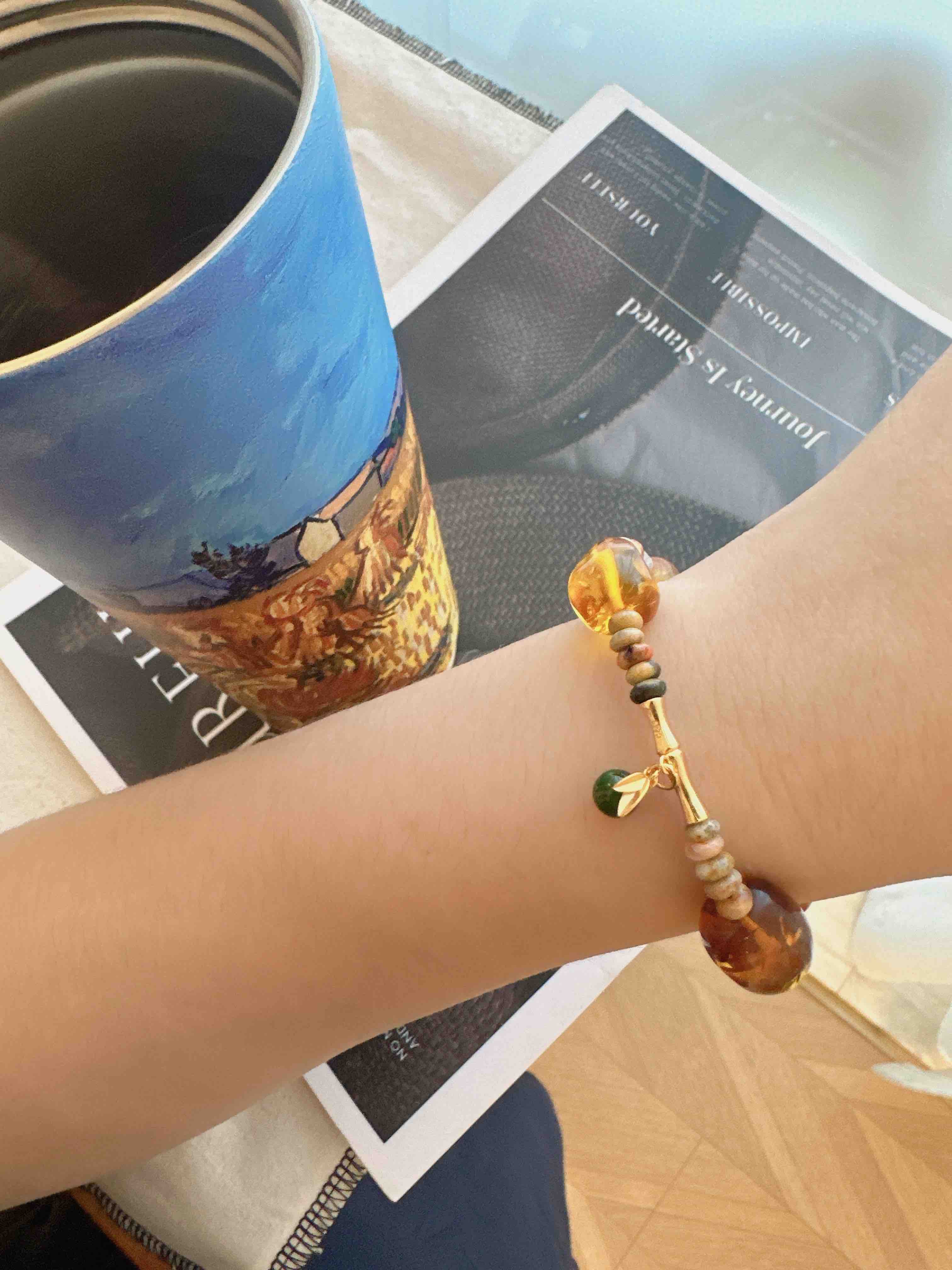 治愈系,大自然的宝贝。玛瑙(爱心)+琥珀+玛瑙(小的那些珠珠),还有竹节状S925纯银+碧玉。都是纯天然的材质,把大自然戴在手上的治愈力,约吗?