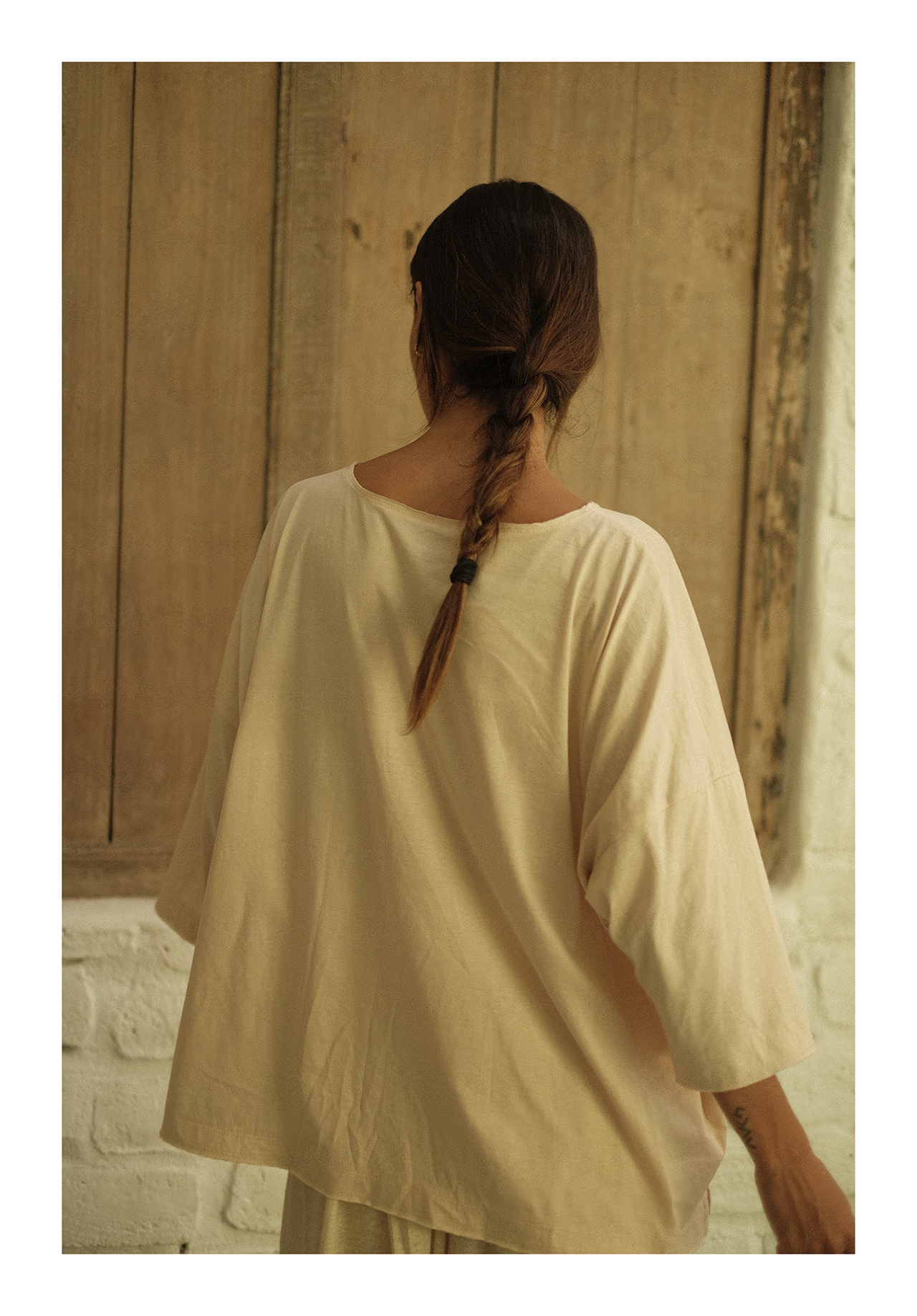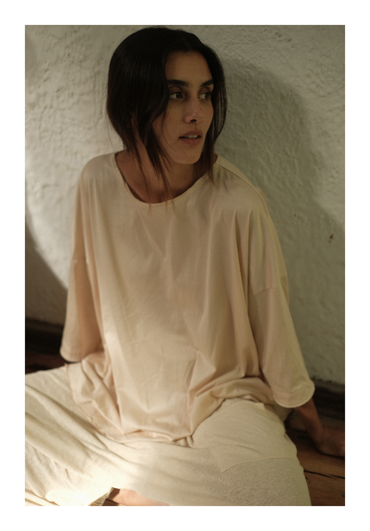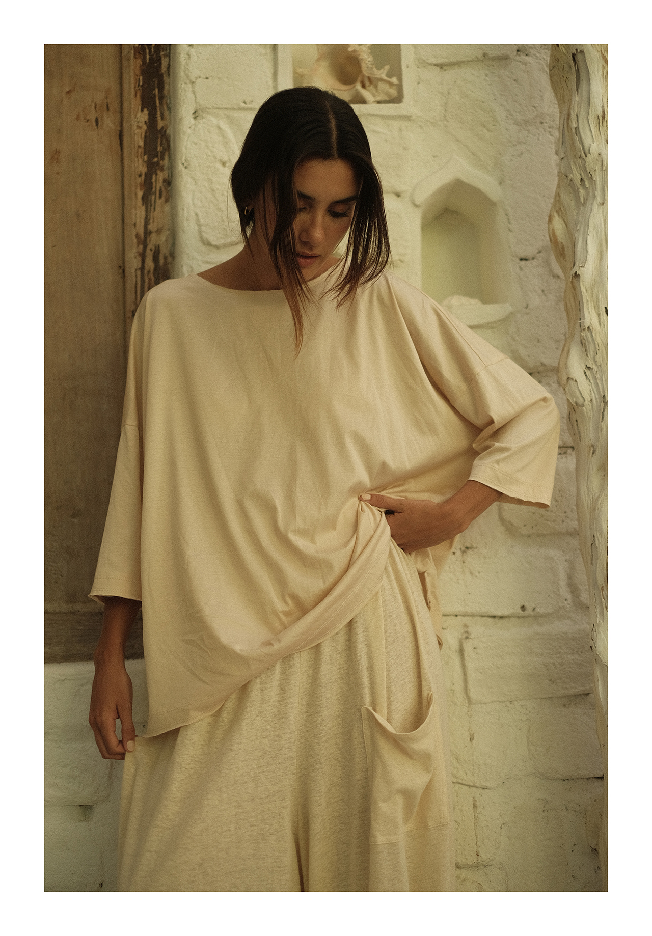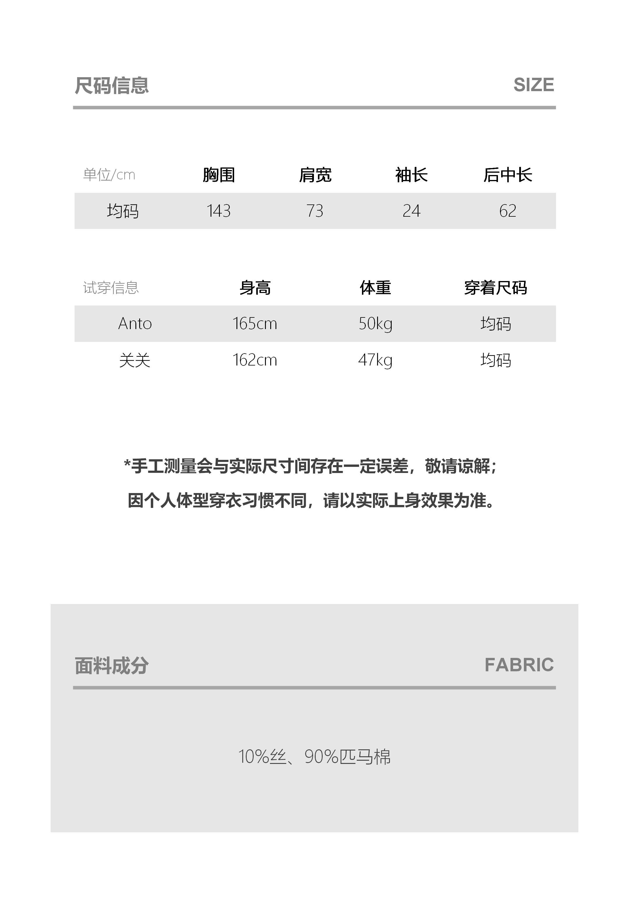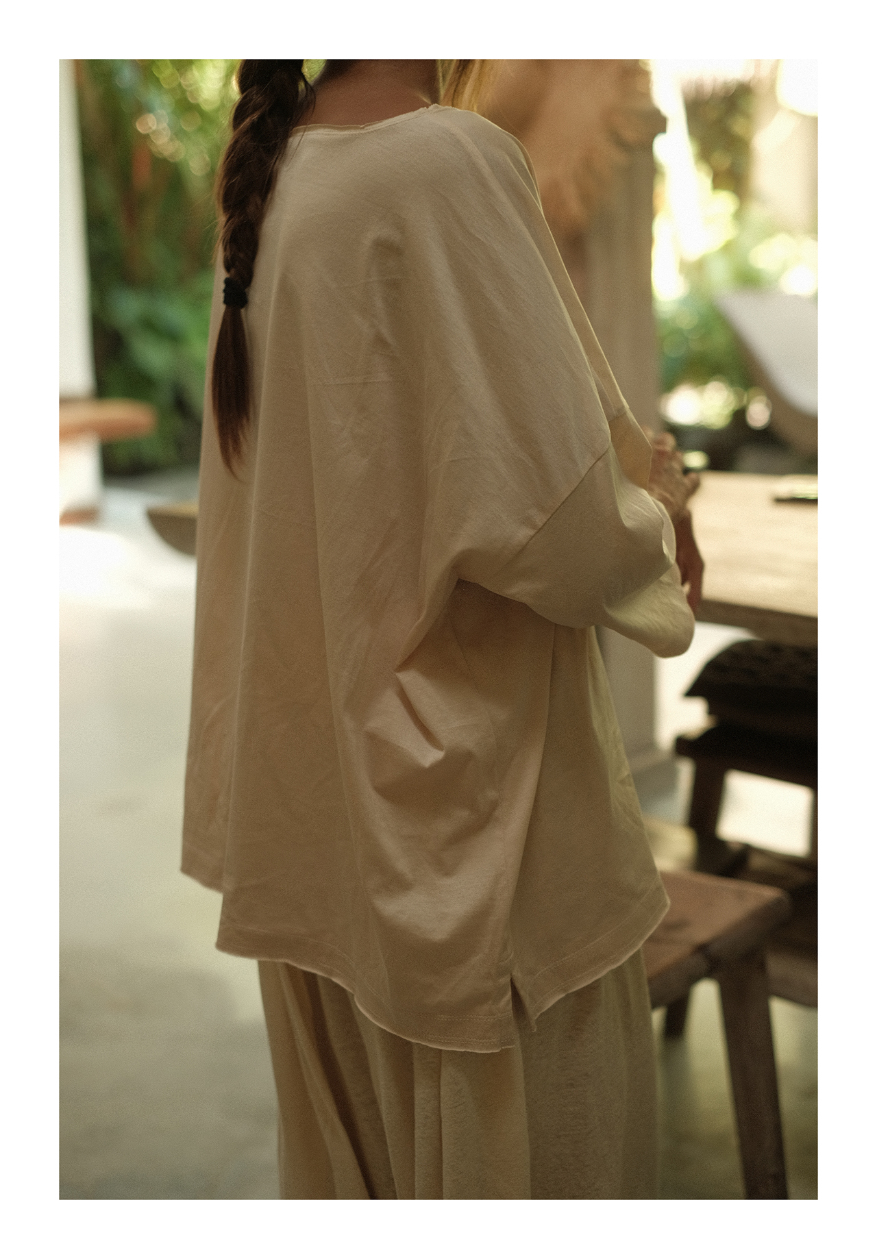 匹马棉桑蚕丝OVERSIZE自然边T恤衫