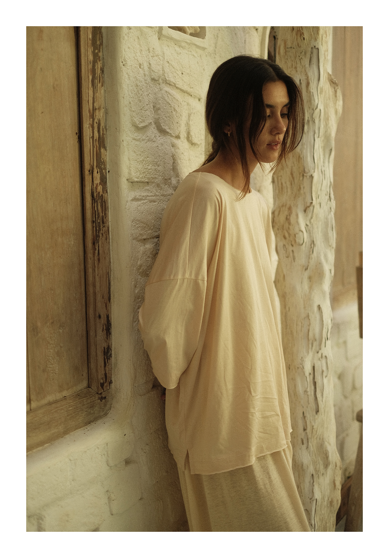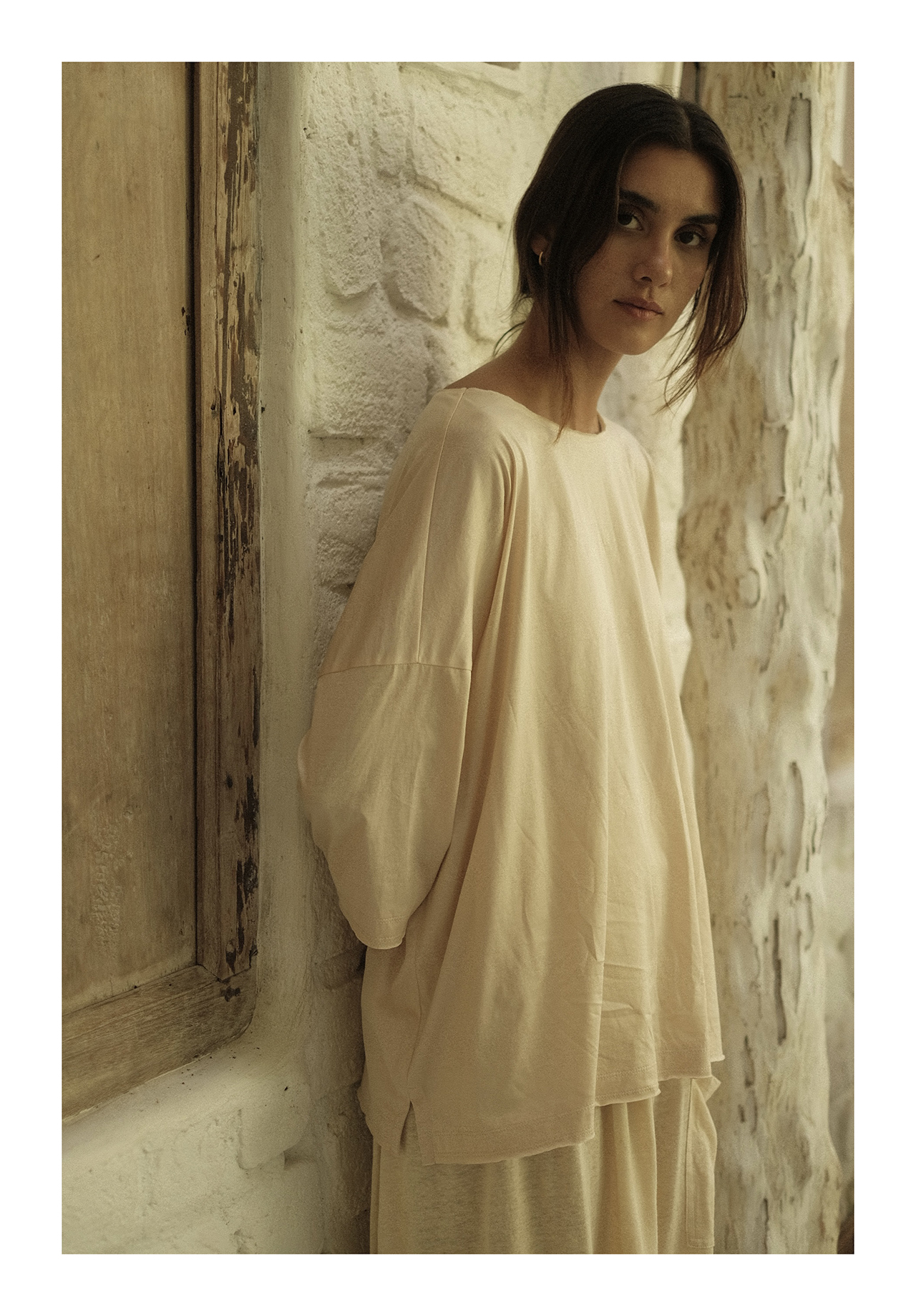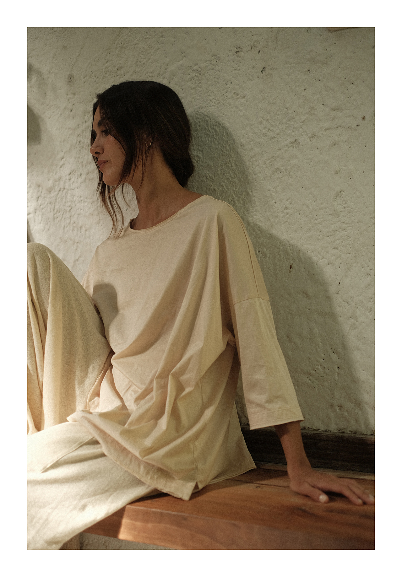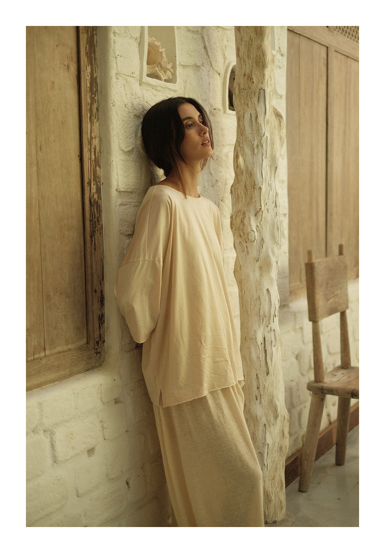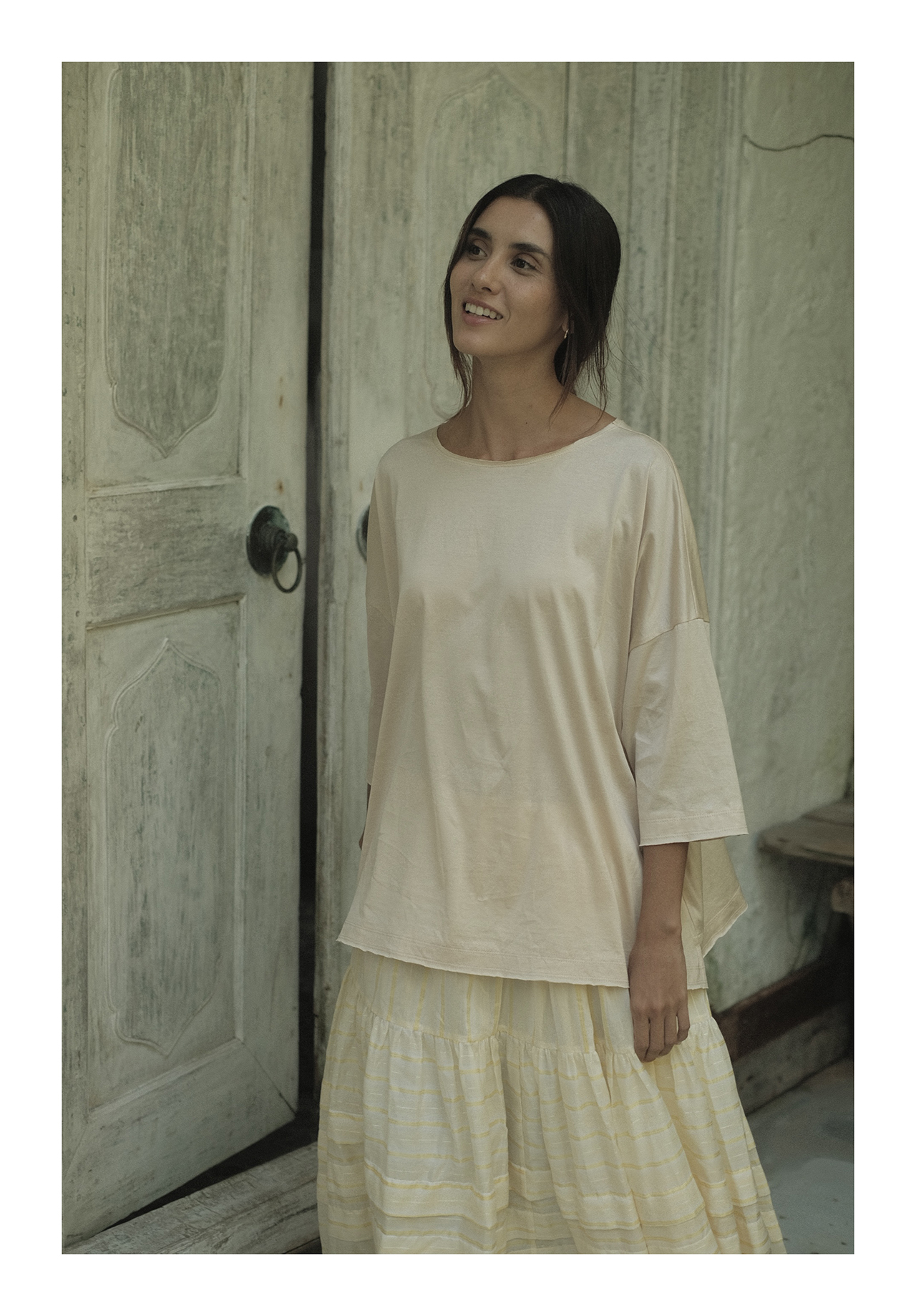匹马棉桑蚕丝OVERSIZE自然边T恤衫