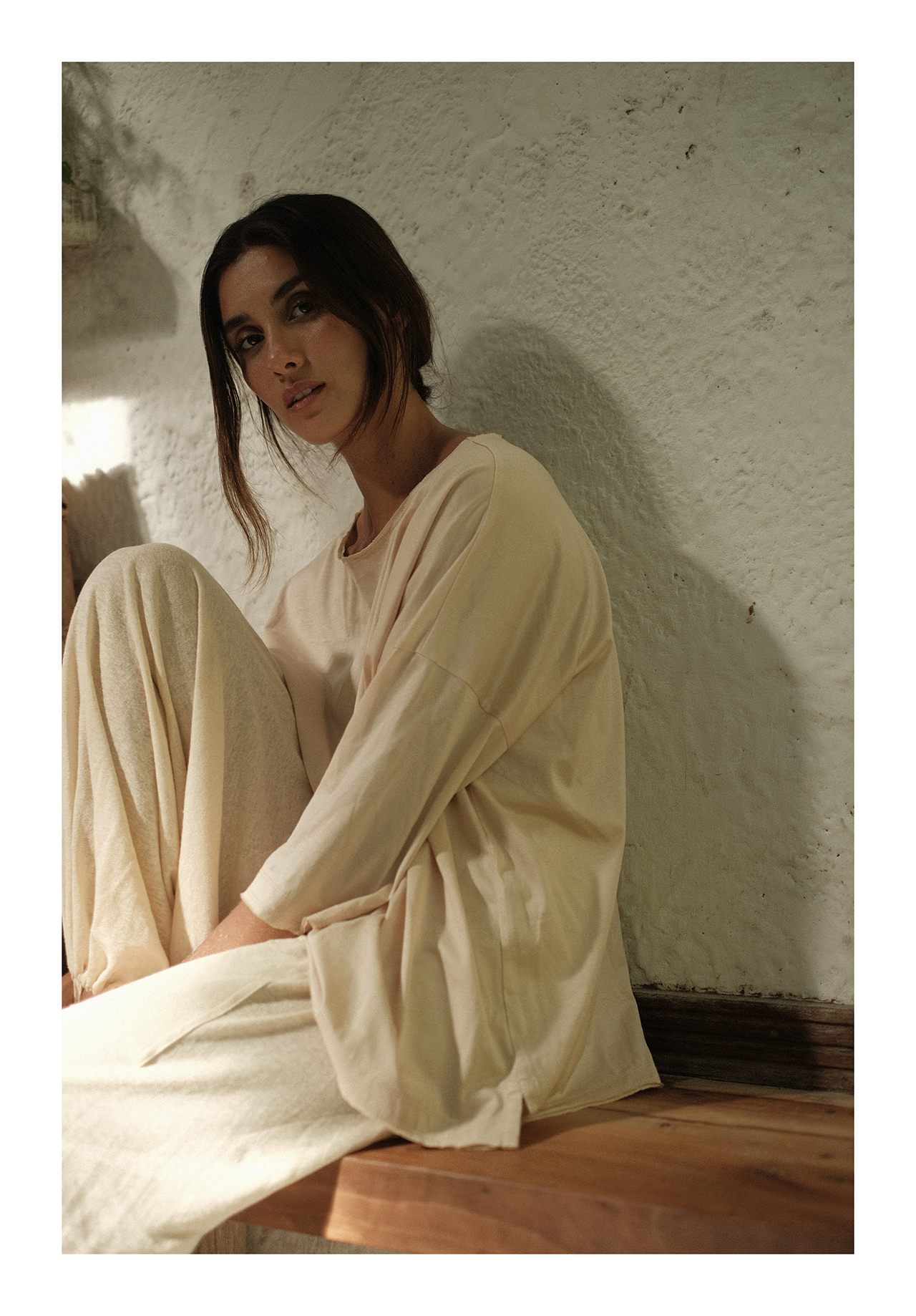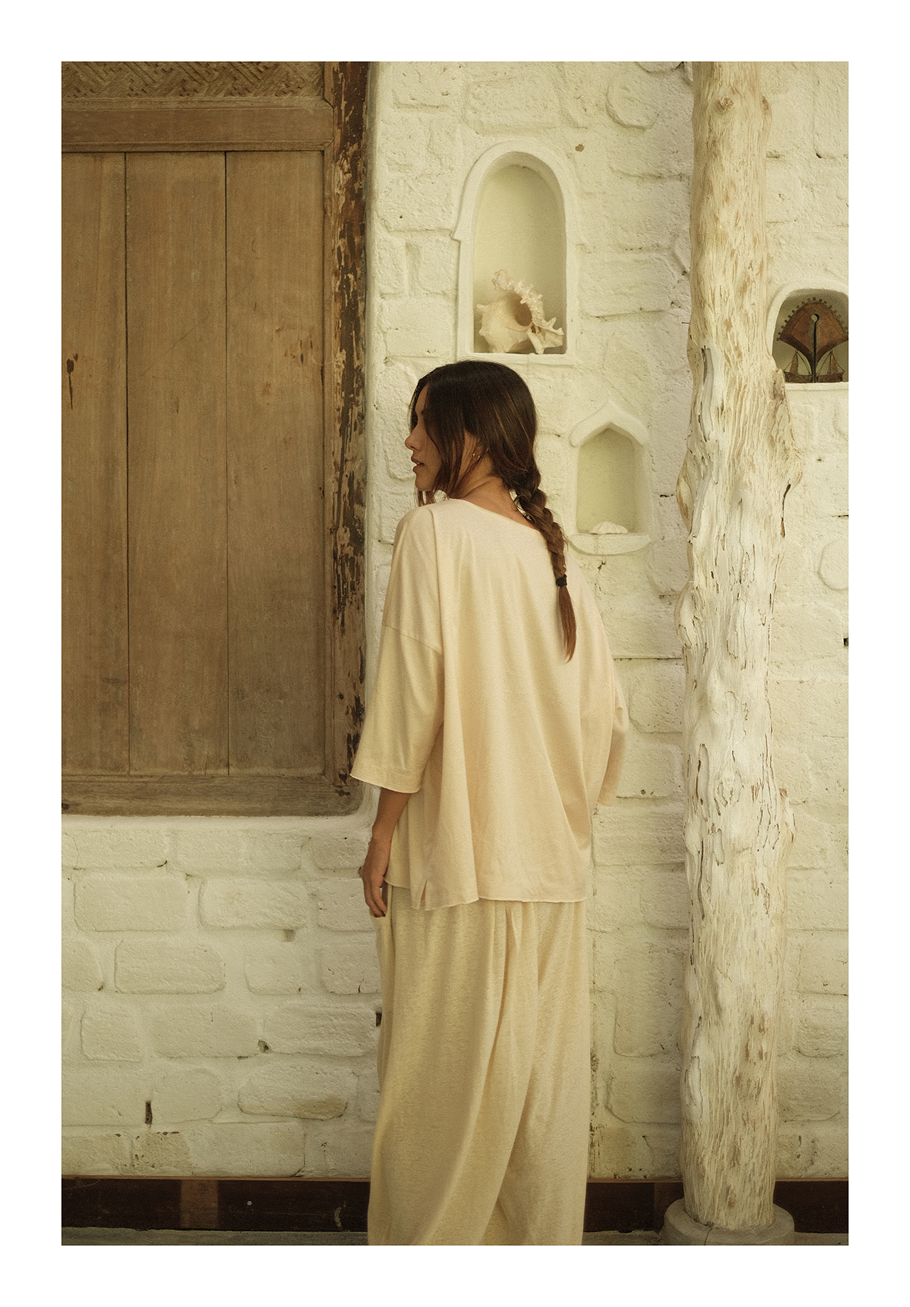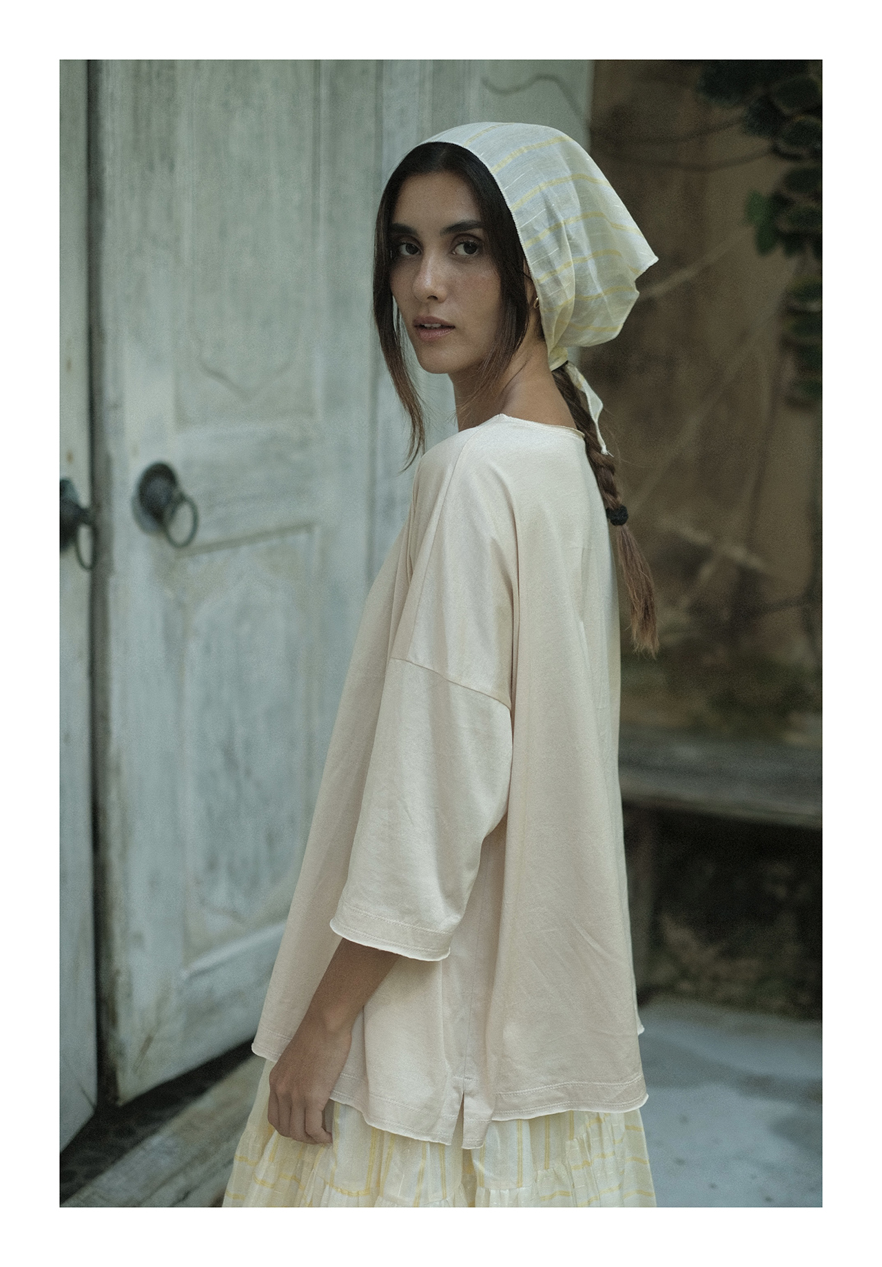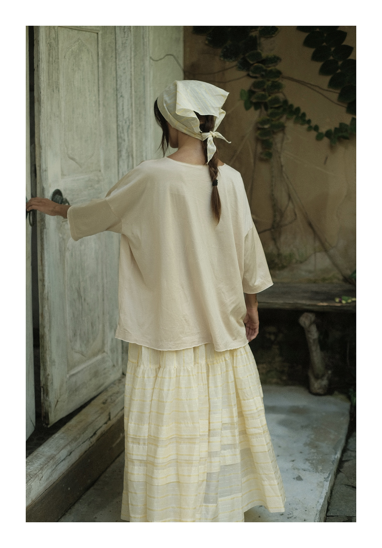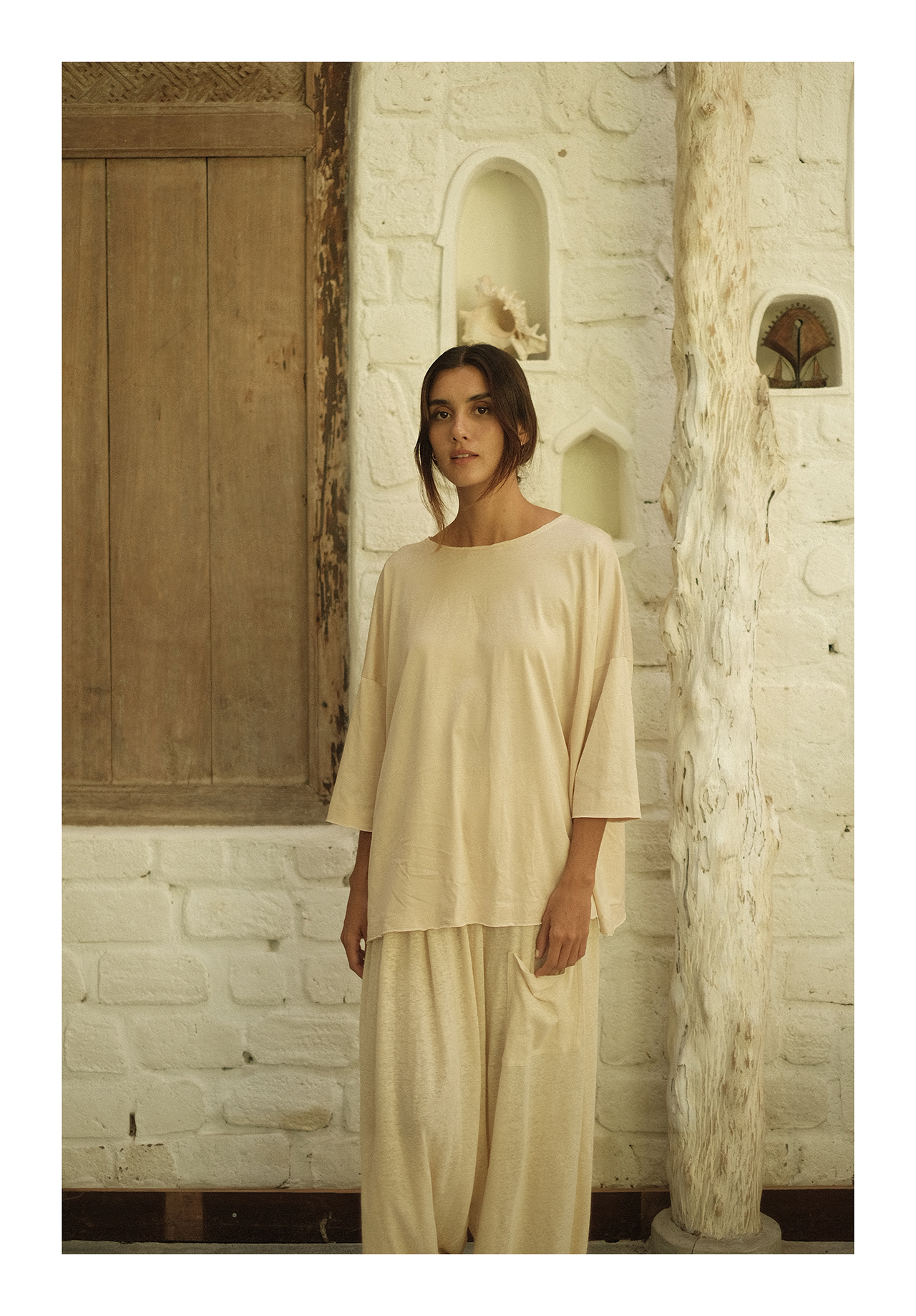 匹马棉桑蚕丝OVERSIZE自然边T恤衫