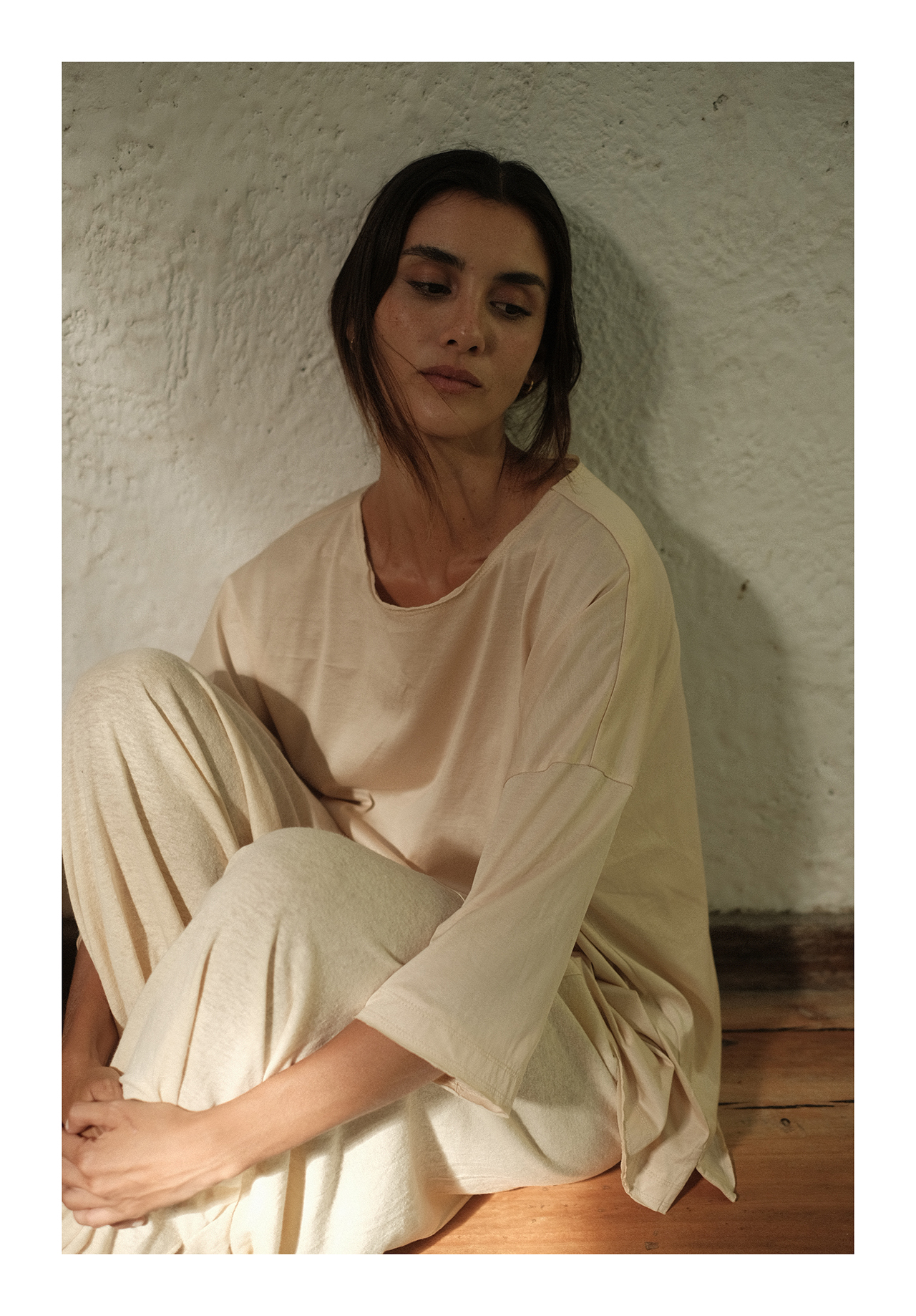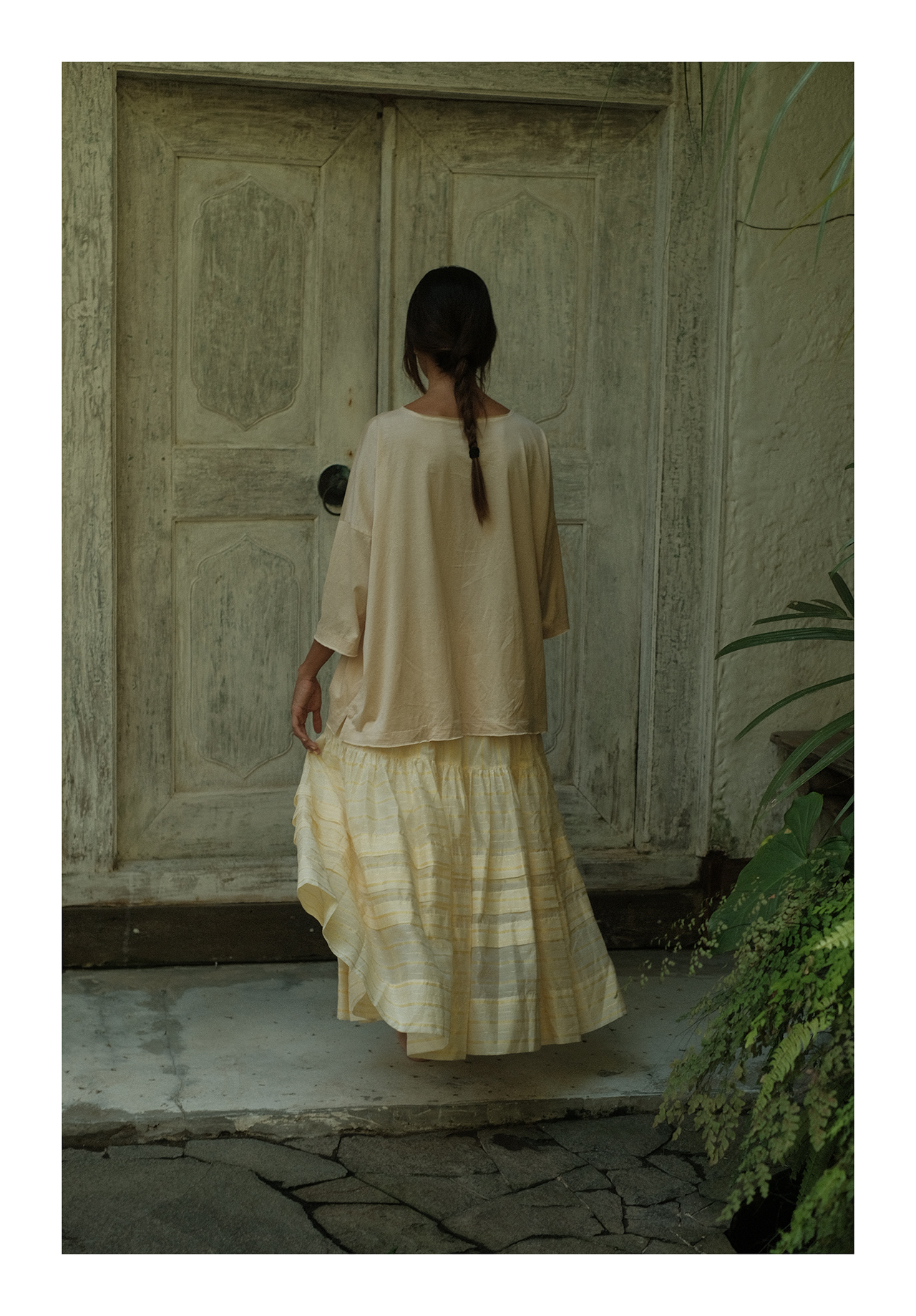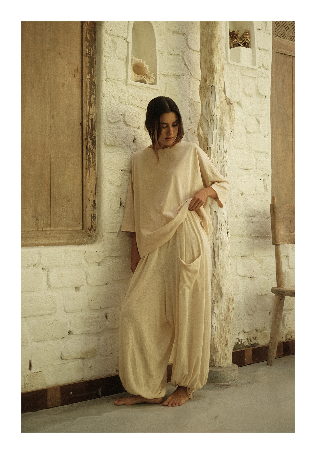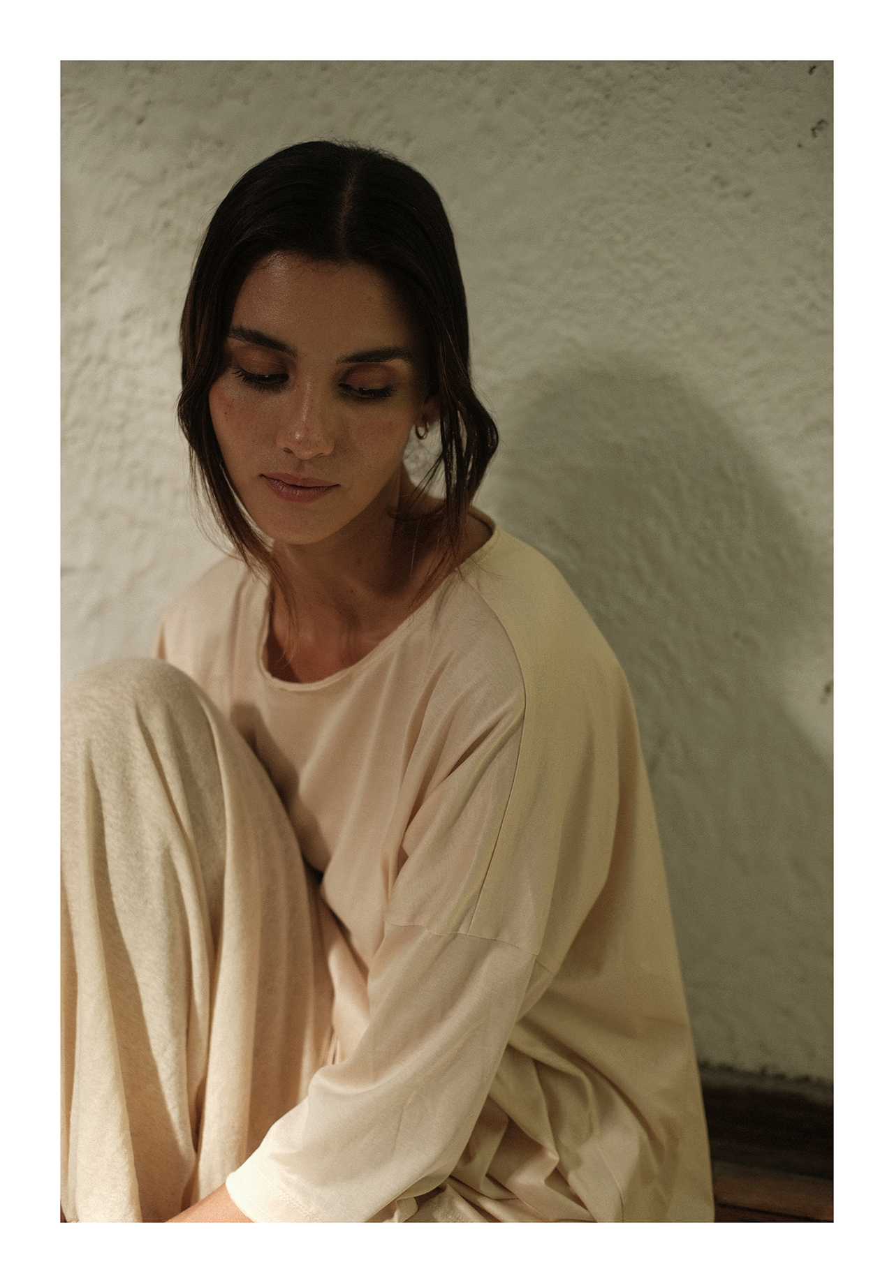 匹马棉桑蚕丝OVERSIZE自然边T恤衫