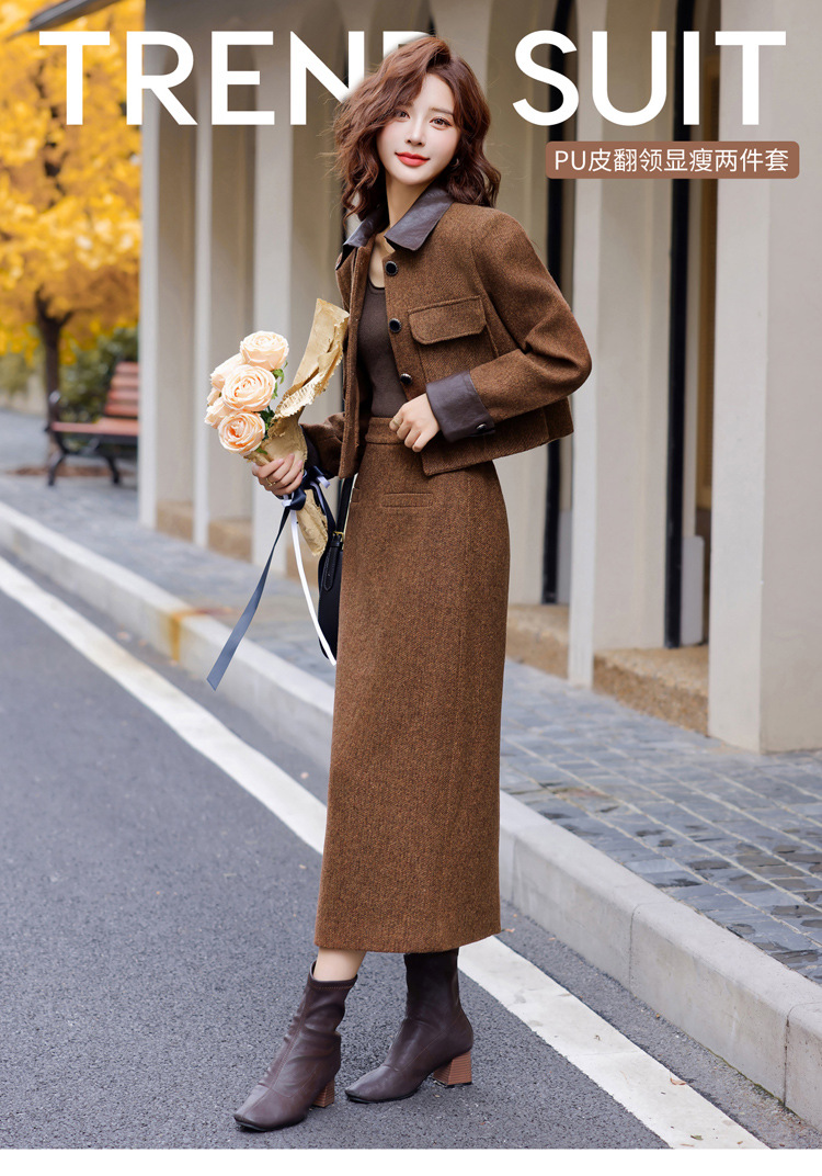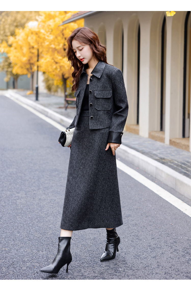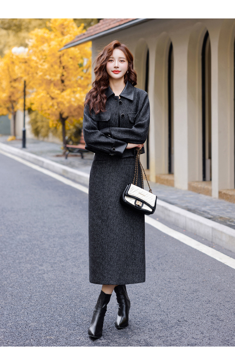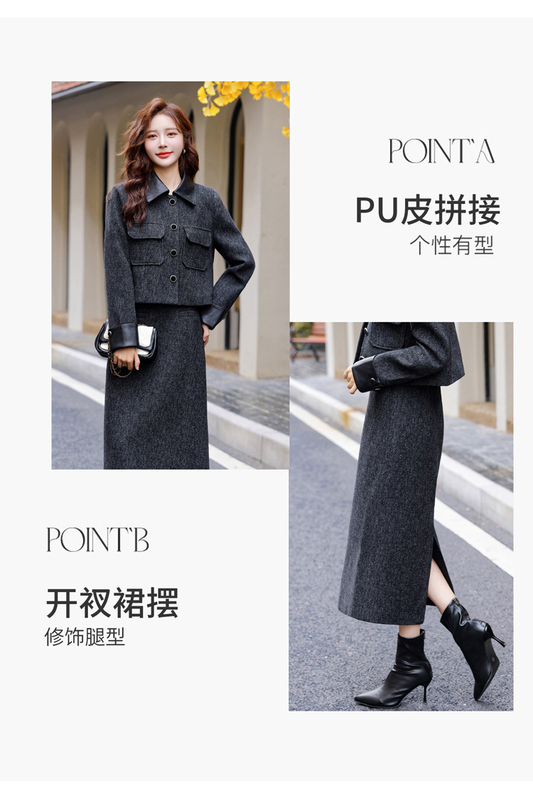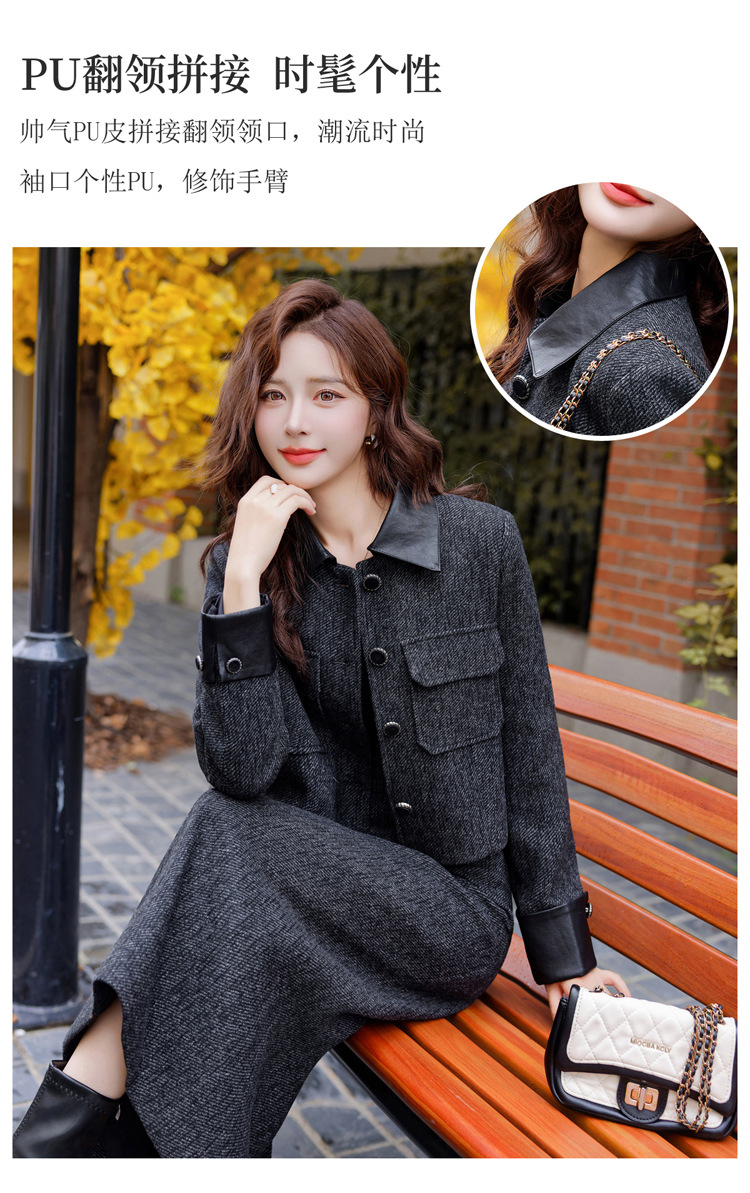 HR-YJLY1336A气质穿搭时尚套装裙新款秋季法式高级感女神范套装拼接pu皮两件套