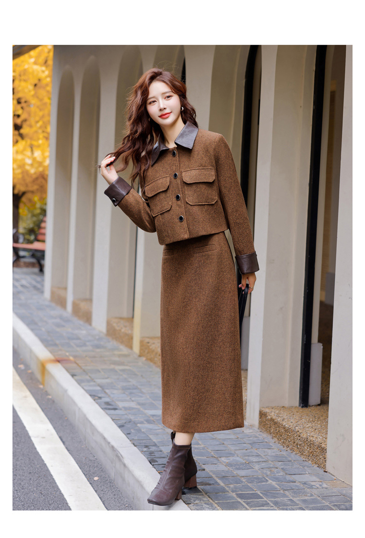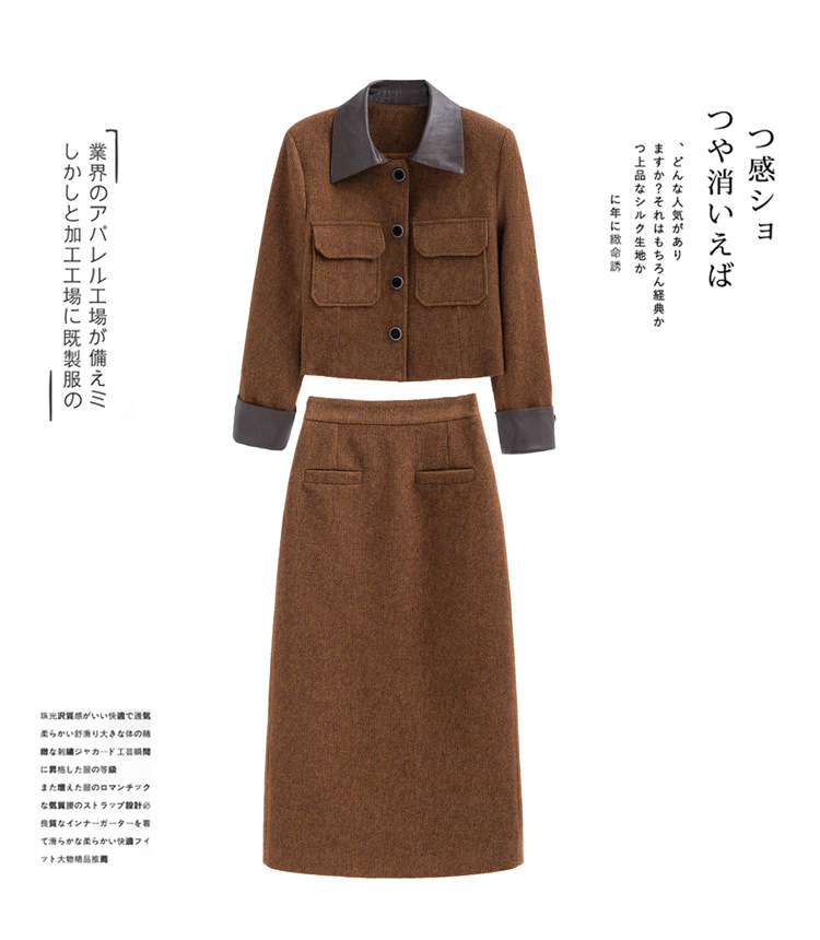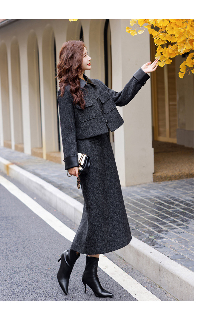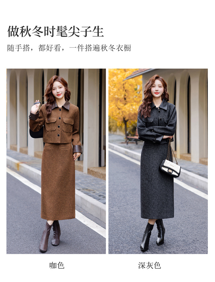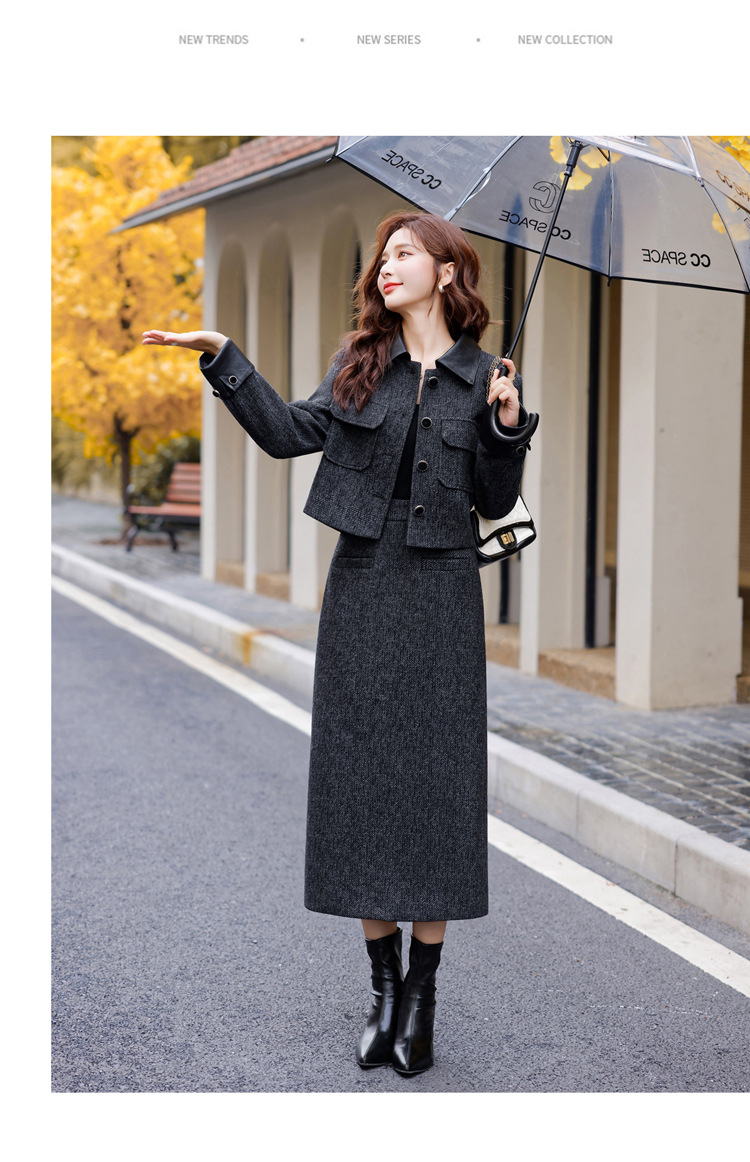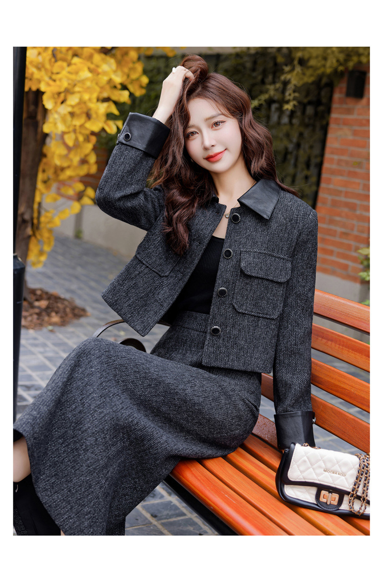 HR-YJLY1336A气质穿搭时尚套装裙新款秋季法式高级感女神范套装拼接pu皮两件套