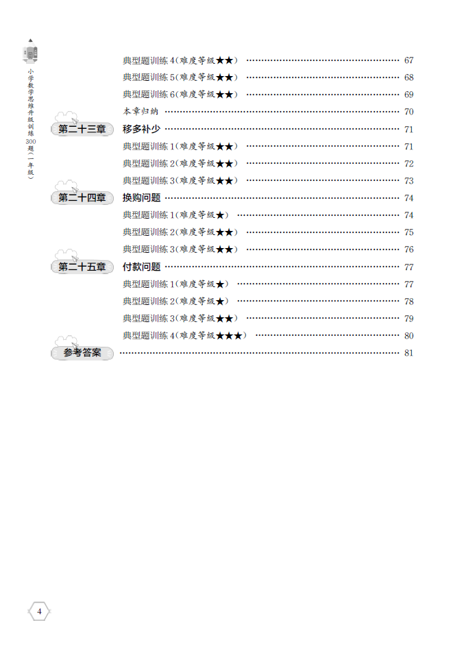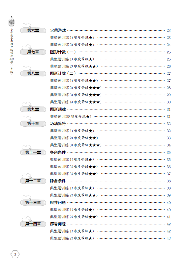《小学数学思维升级训练300题(一年级)》采用分章专题的编排,以例题+练习的形式,将所有常见小学数学思维题分门别类编入25章。全书不仅题型全面、场景丰富,且编排合理、难度由浅入深,避免了很多教辅书出现头重脚轻、编排混乱的问题,是中等以上学生学习数学思维题的好帮手。