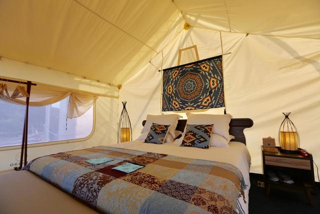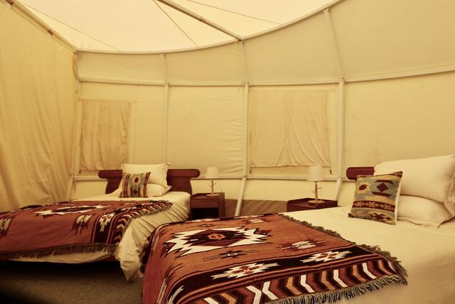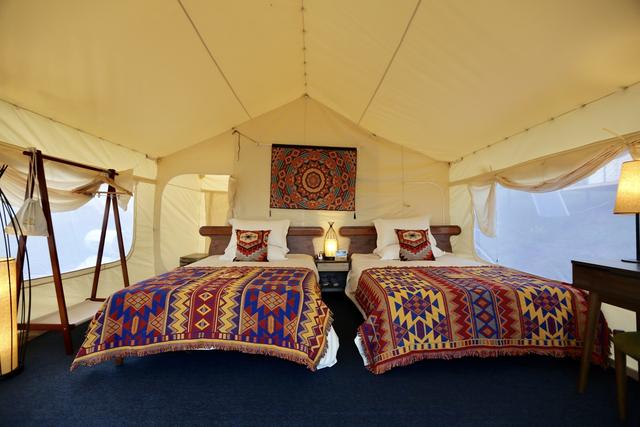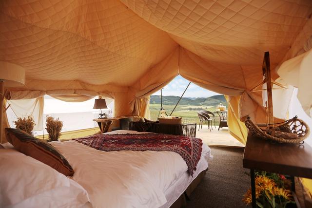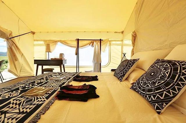 住进豪华大帐篷,在草原体验奢华住宿,独特野奢房型,配置齐全,温馨舒适。定制的家具和灯具的设计灵感来自草原的盐茶古道文化,自然淳朴,让人舒适安逸;床头的挂毯、枕套、靠包等装饰品上都融入了波西米亚元素,让人倍感自由与神秘。