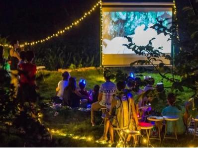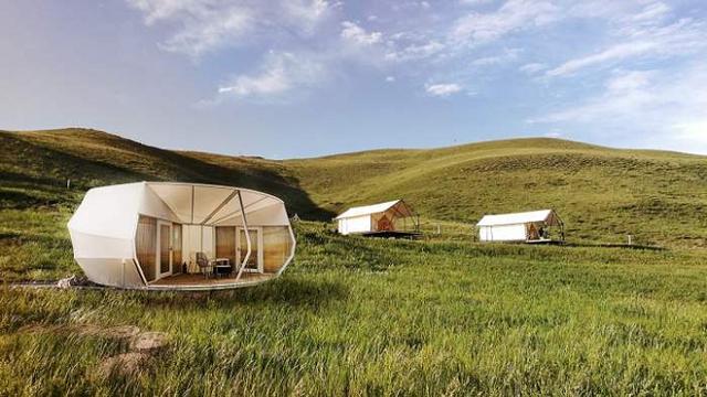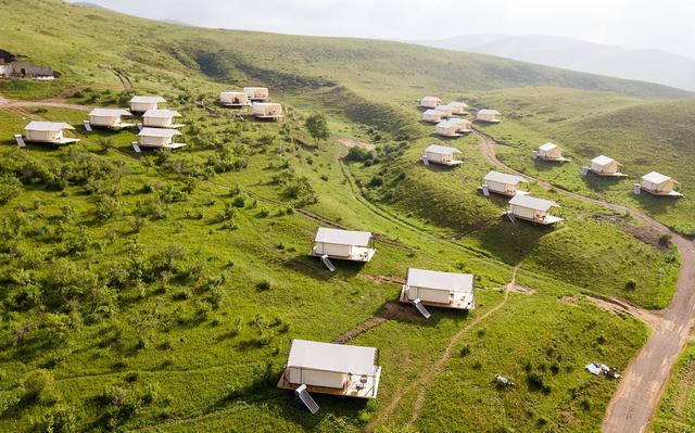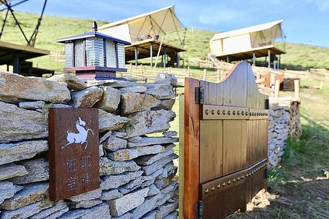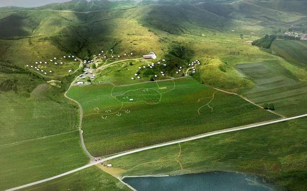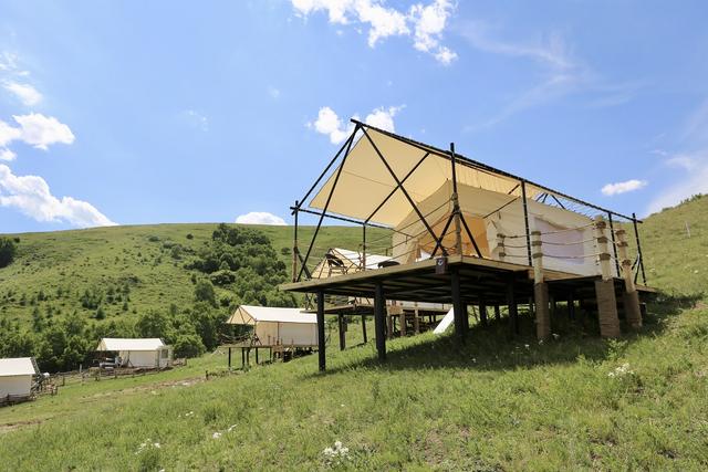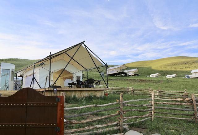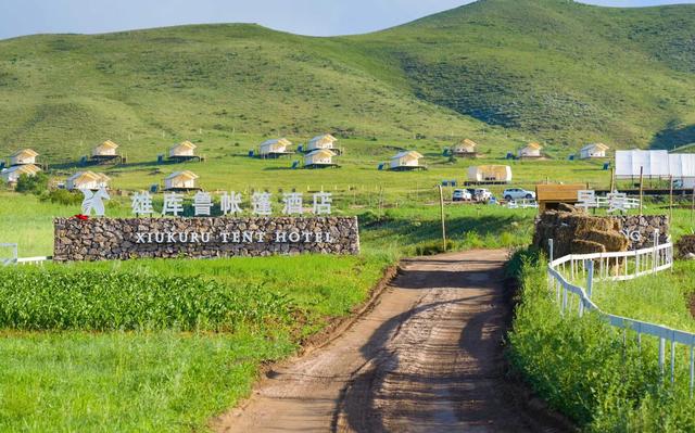 而在这片辽阔之地,早安雄库鲁圈起了依山望水的800亩草原美景,依山而建、种百亩花田,开自造星空泳池、设露天影院,搭起的星星点点白色帐篷,掩映在绿意汹涌的大草原,仿若筑起了一个梦幻草原童话世界。