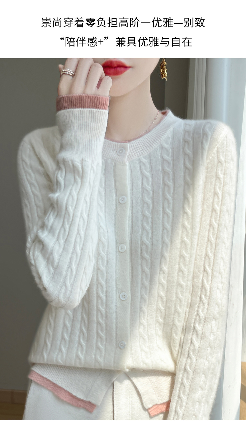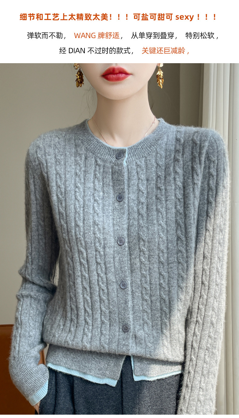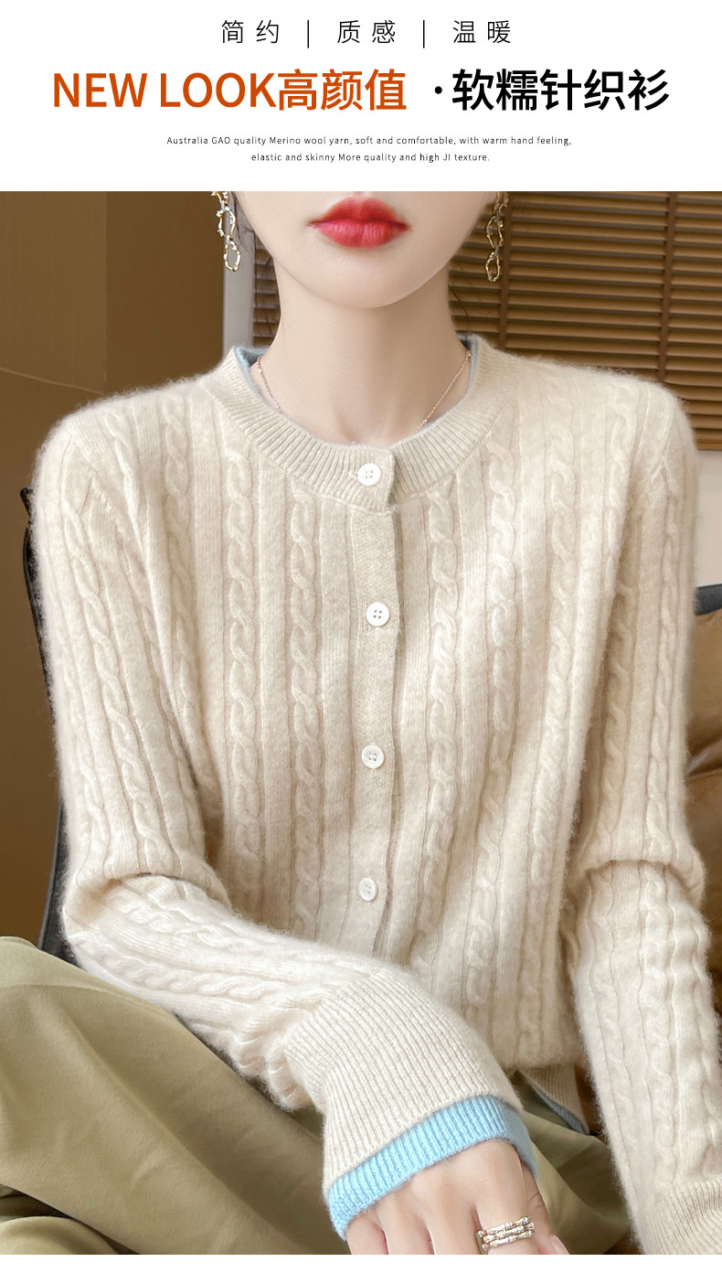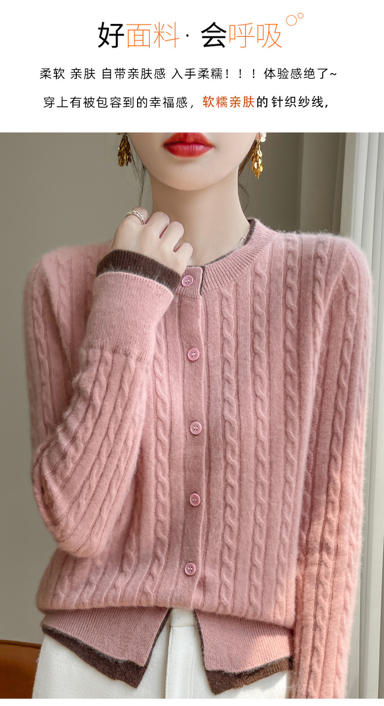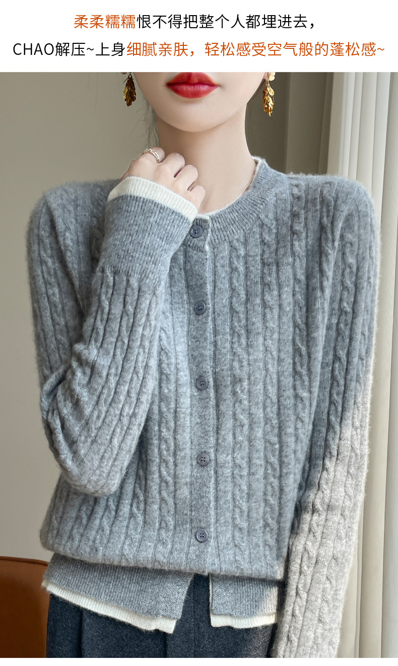 丁摩羊毛混纺秋冬新款女装圆领小麻花拼色时尚保暖短款针织开衫外套5ZF-551