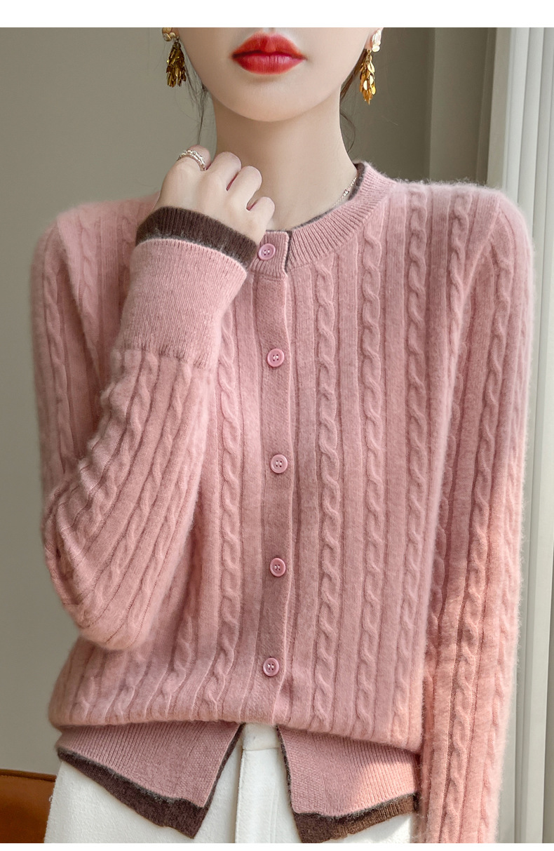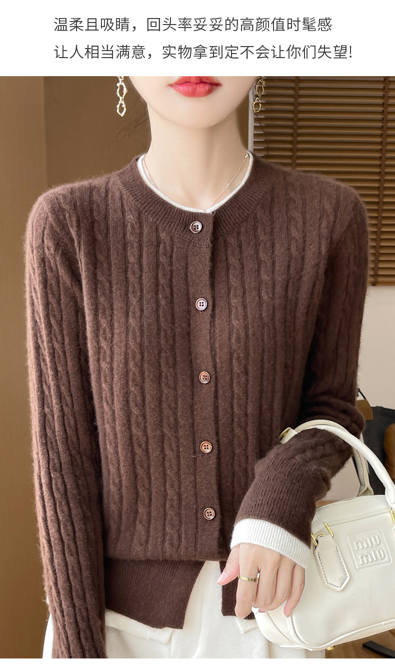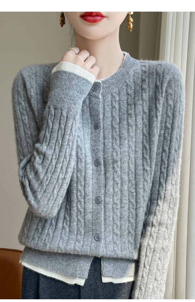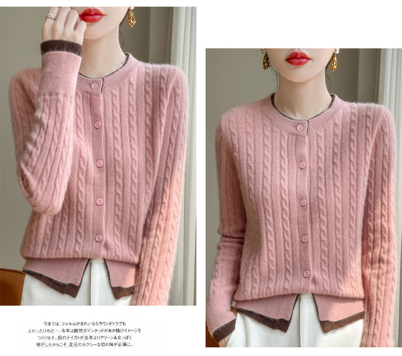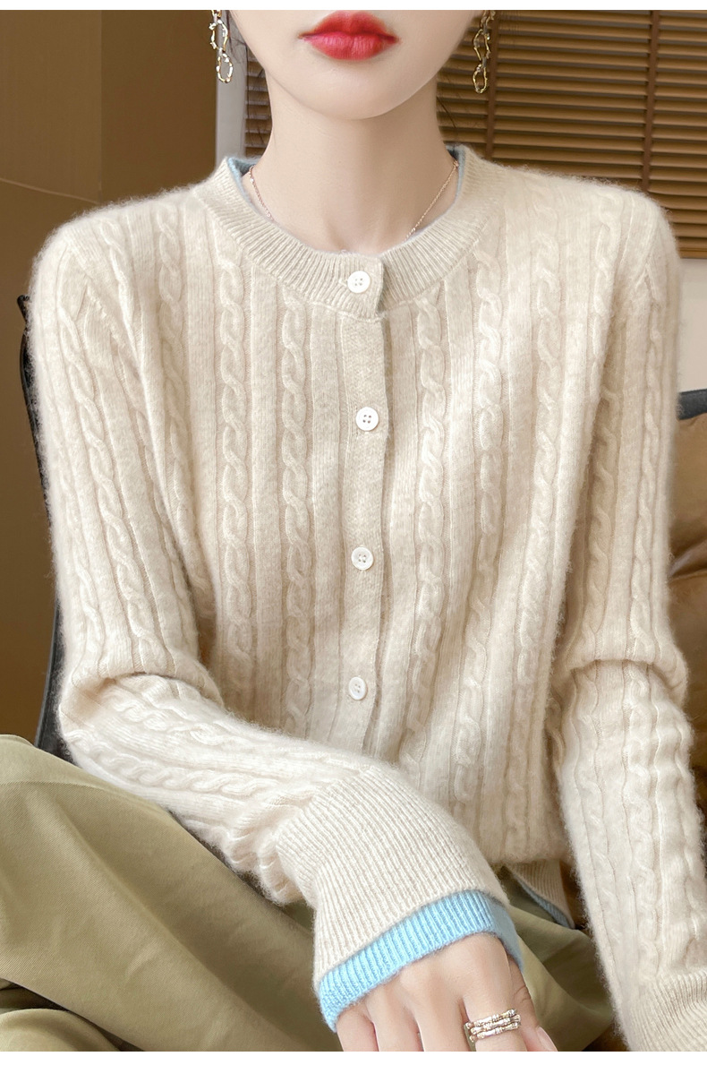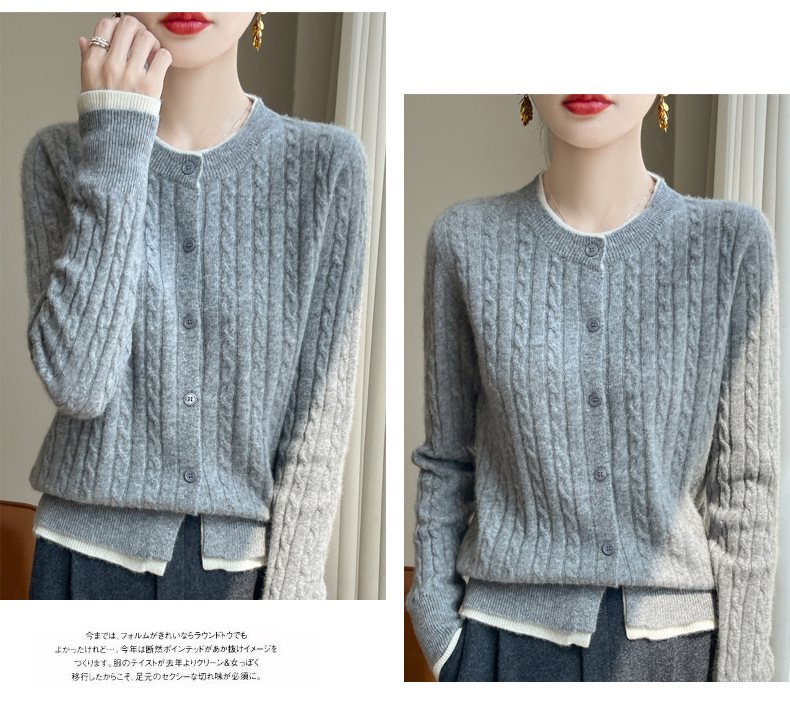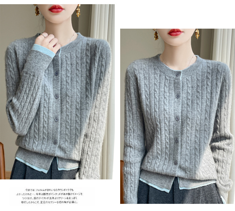 丁摩羊毛混纺秋冬新款女装圆领小麻花拼色时尚保暖短款针织开衫外套5ZF-551