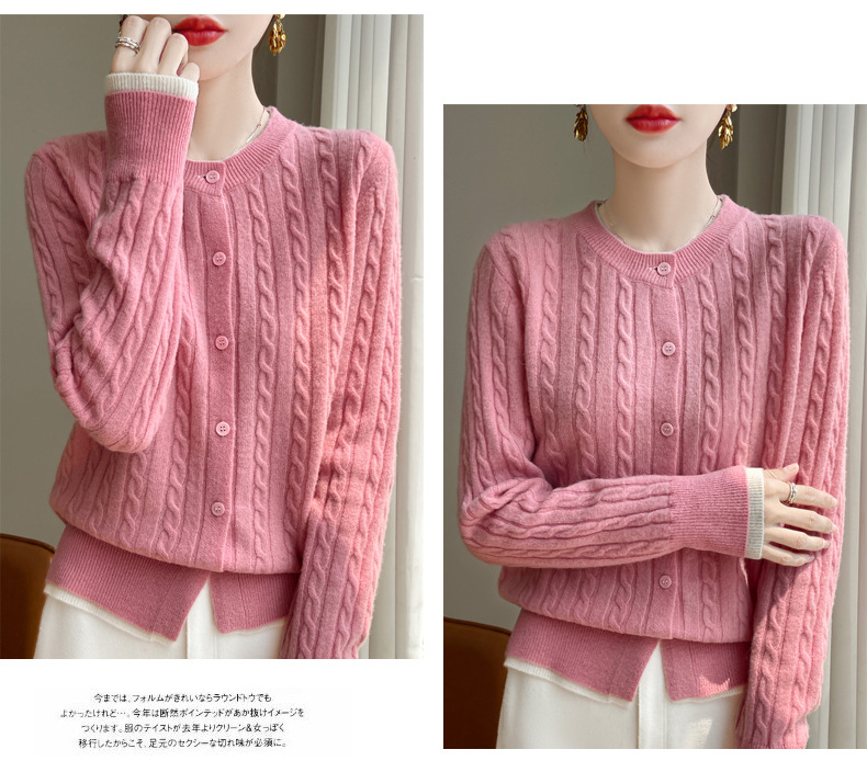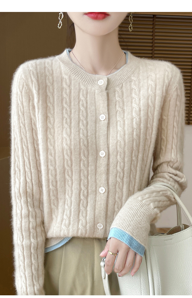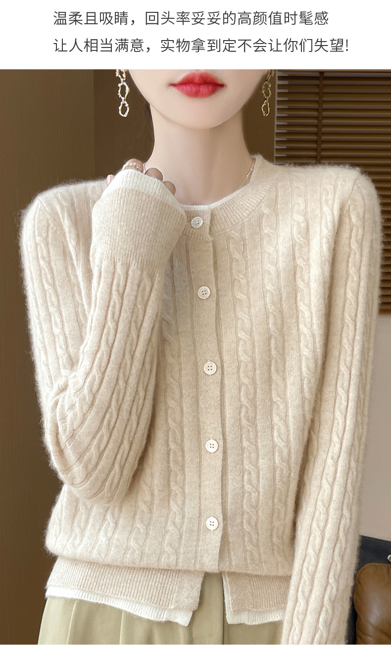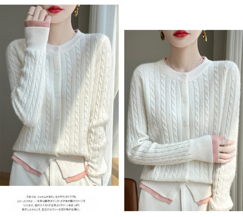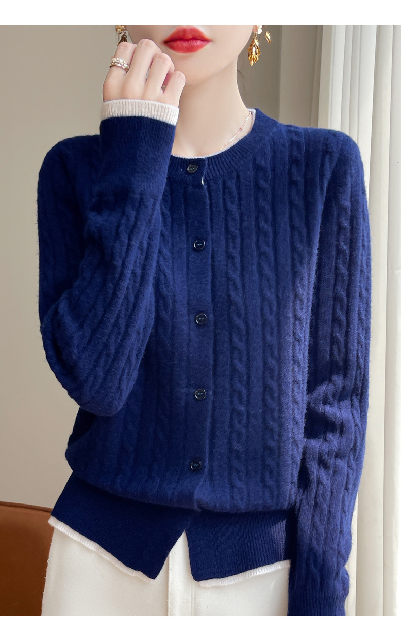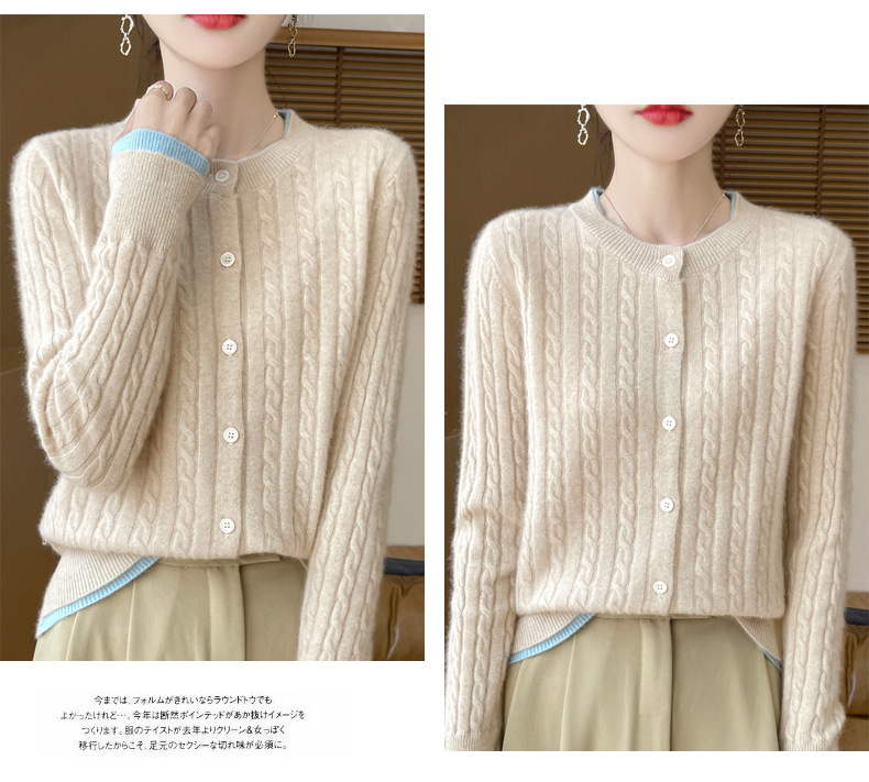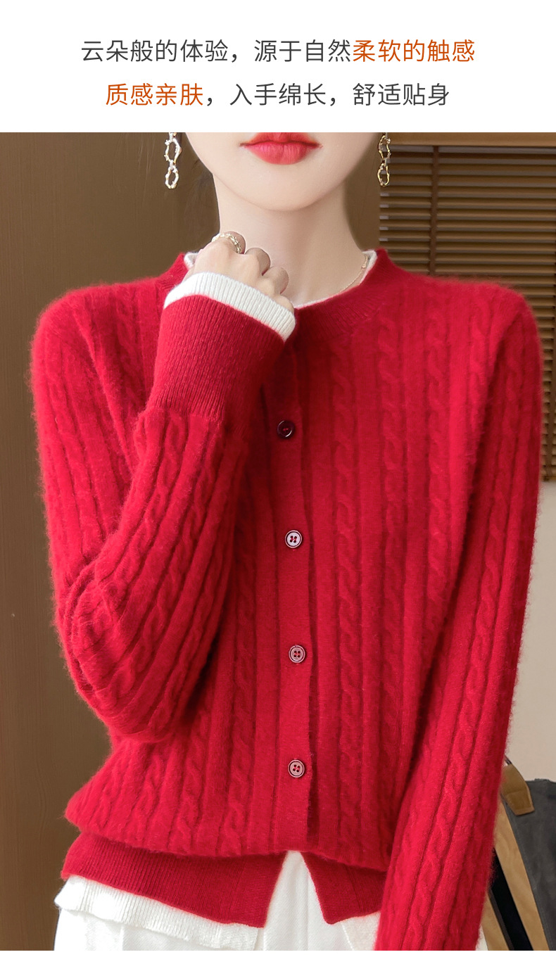 丁摩羊毛混纺秋冬新款女装圆领小麻花拼色时尚保暖短款针织开衫外套5ZF-551