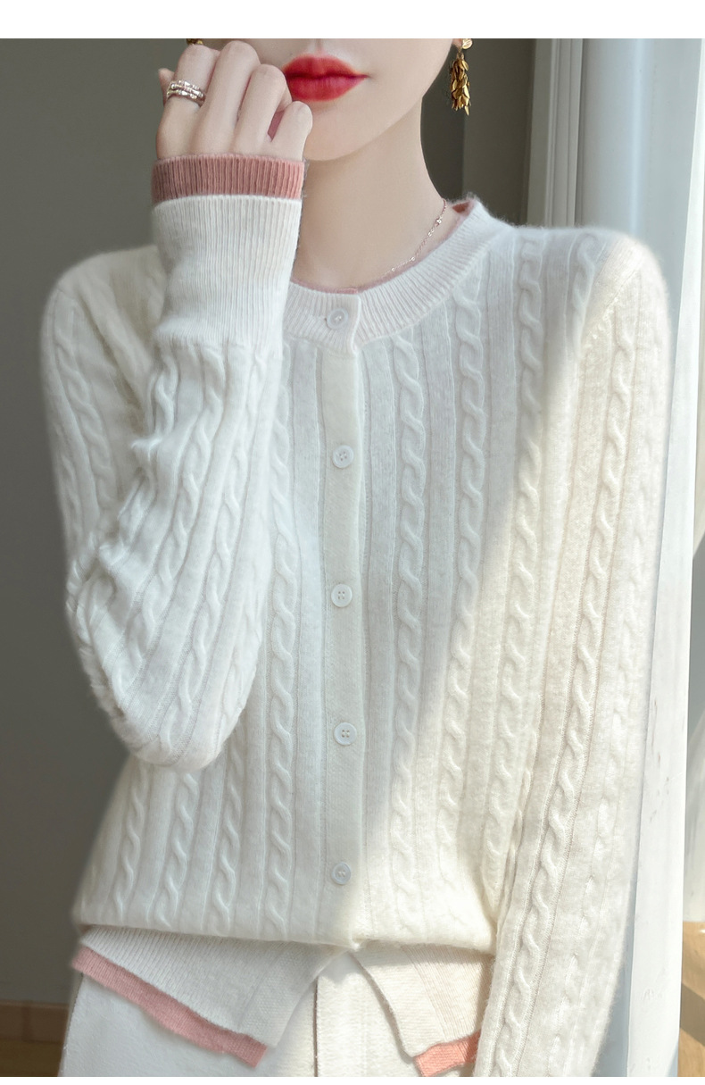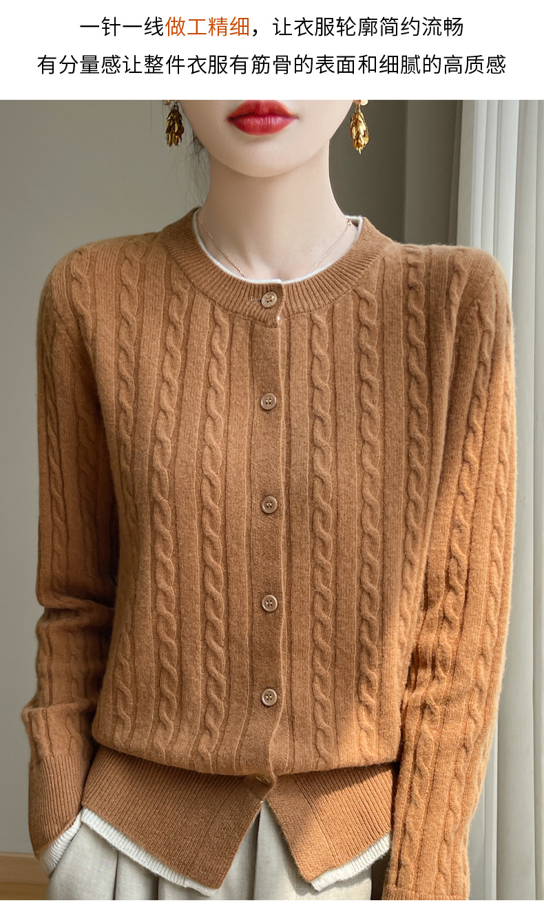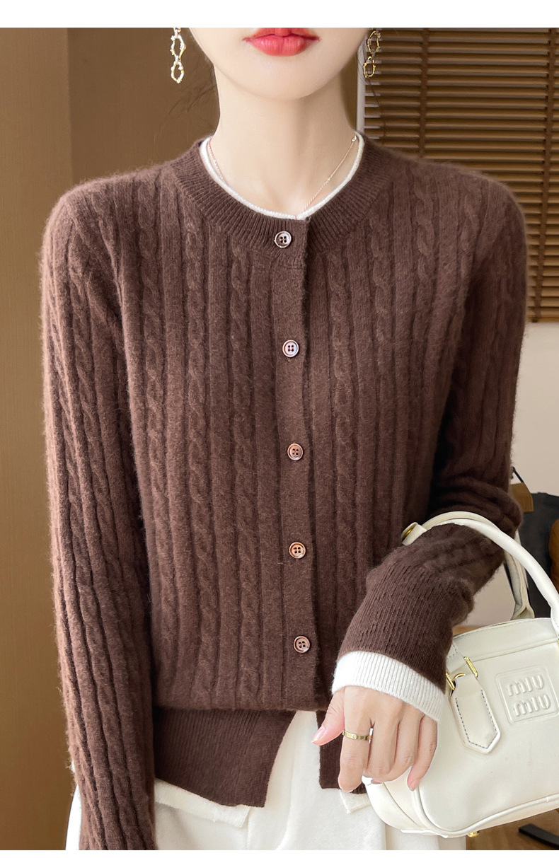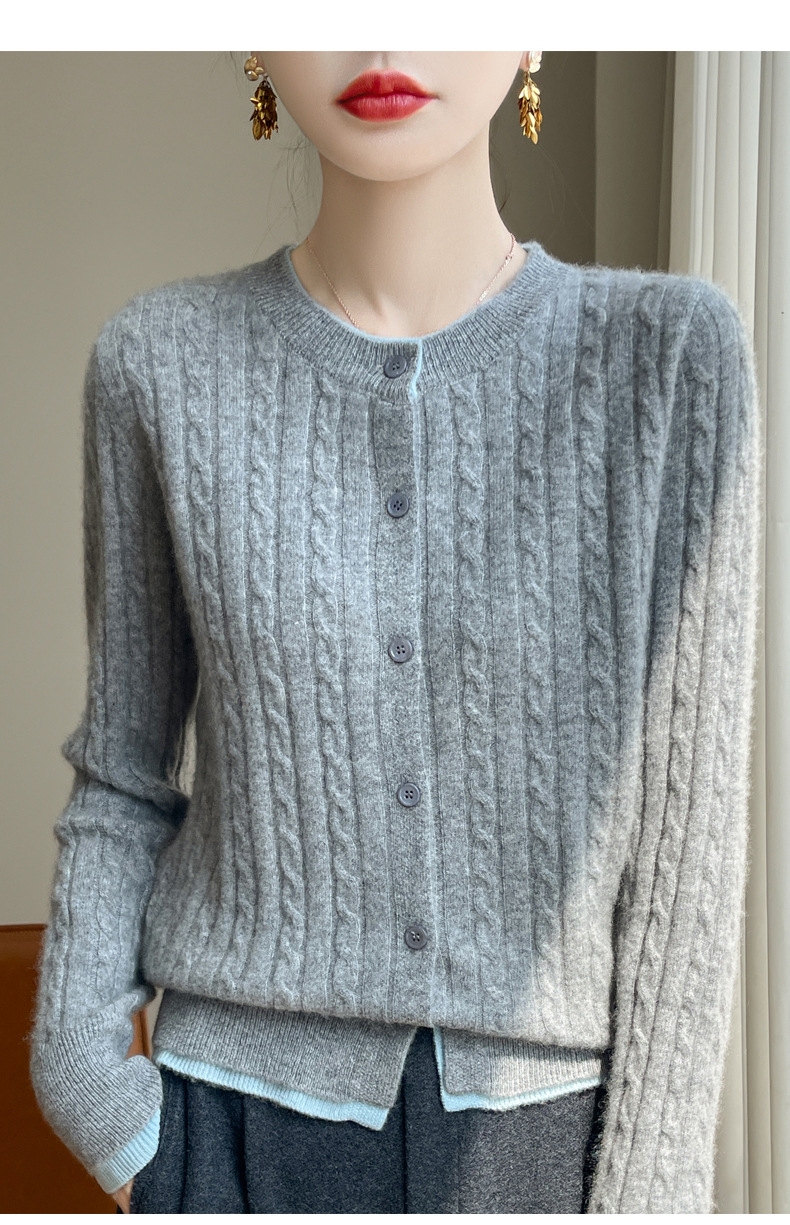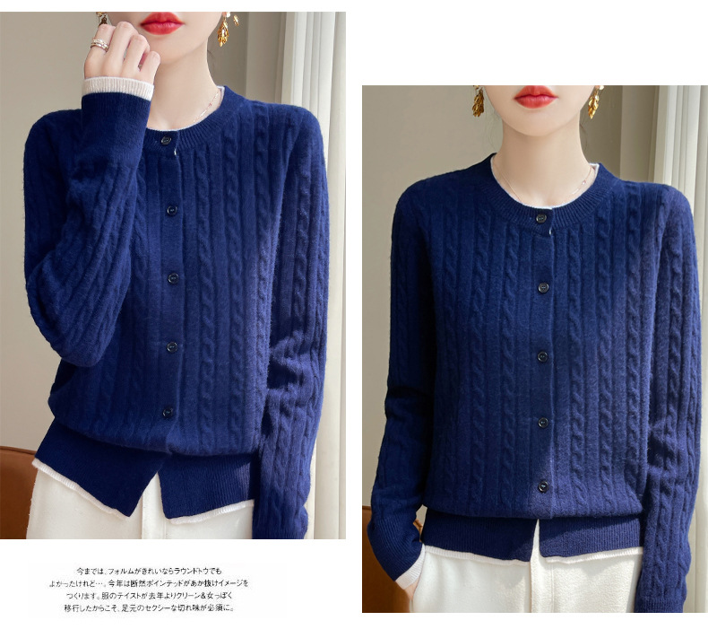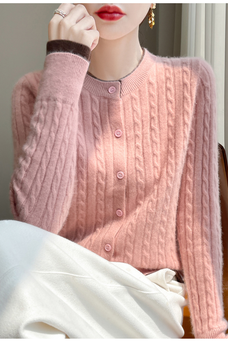丁摩羊毛混纺秋冬新款女装圆领小麻花拼色时尚保暖短款针织开衫外套5ZF-551