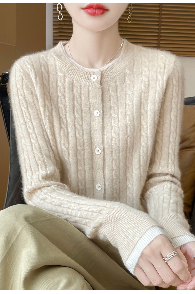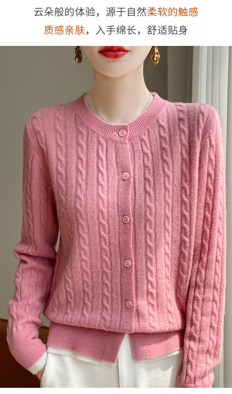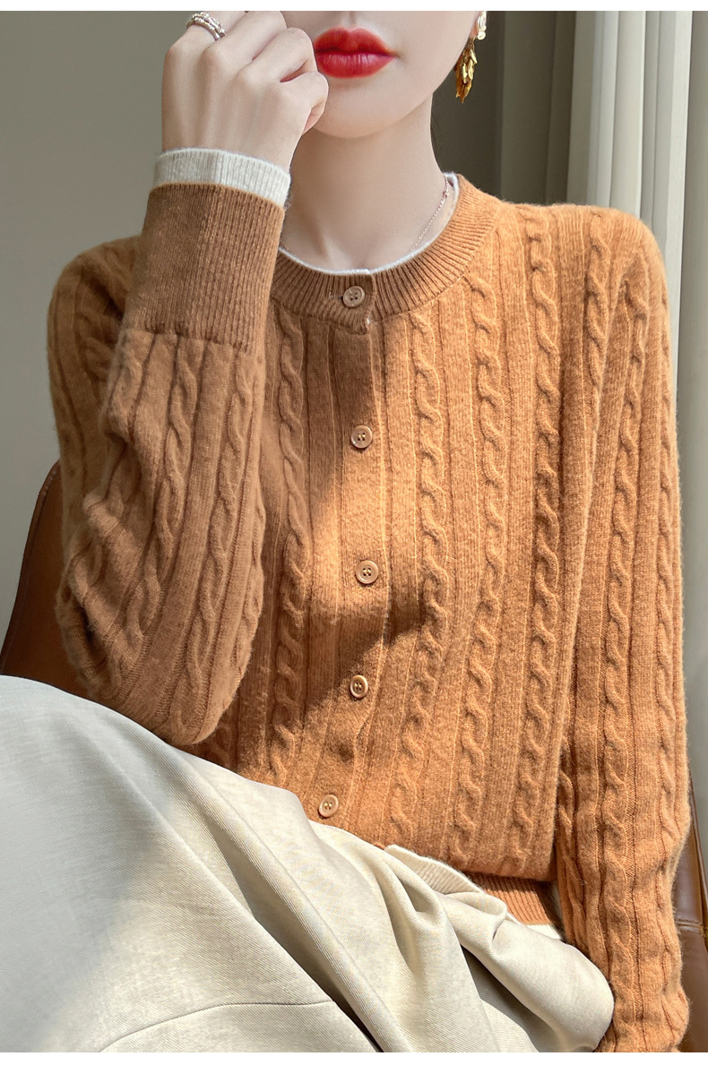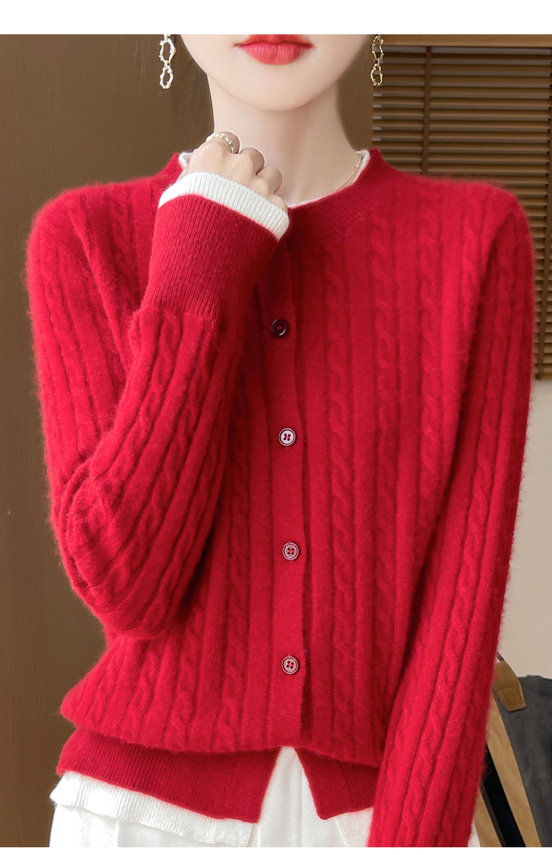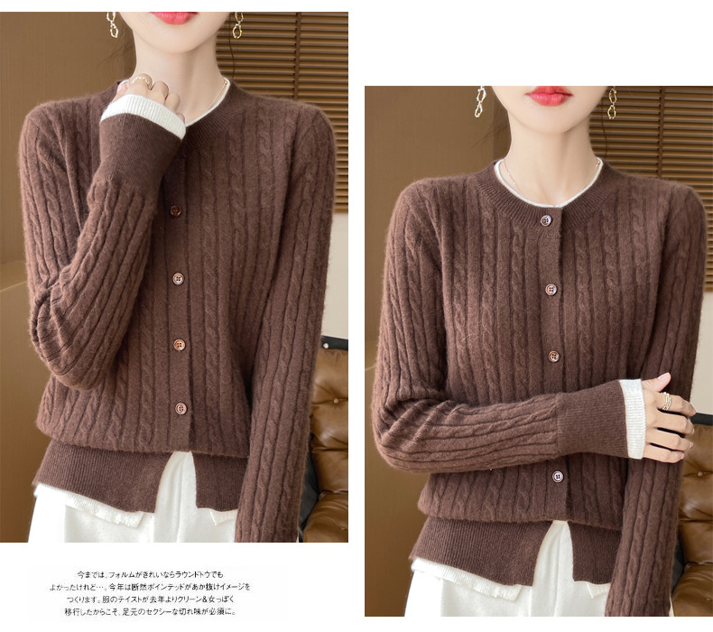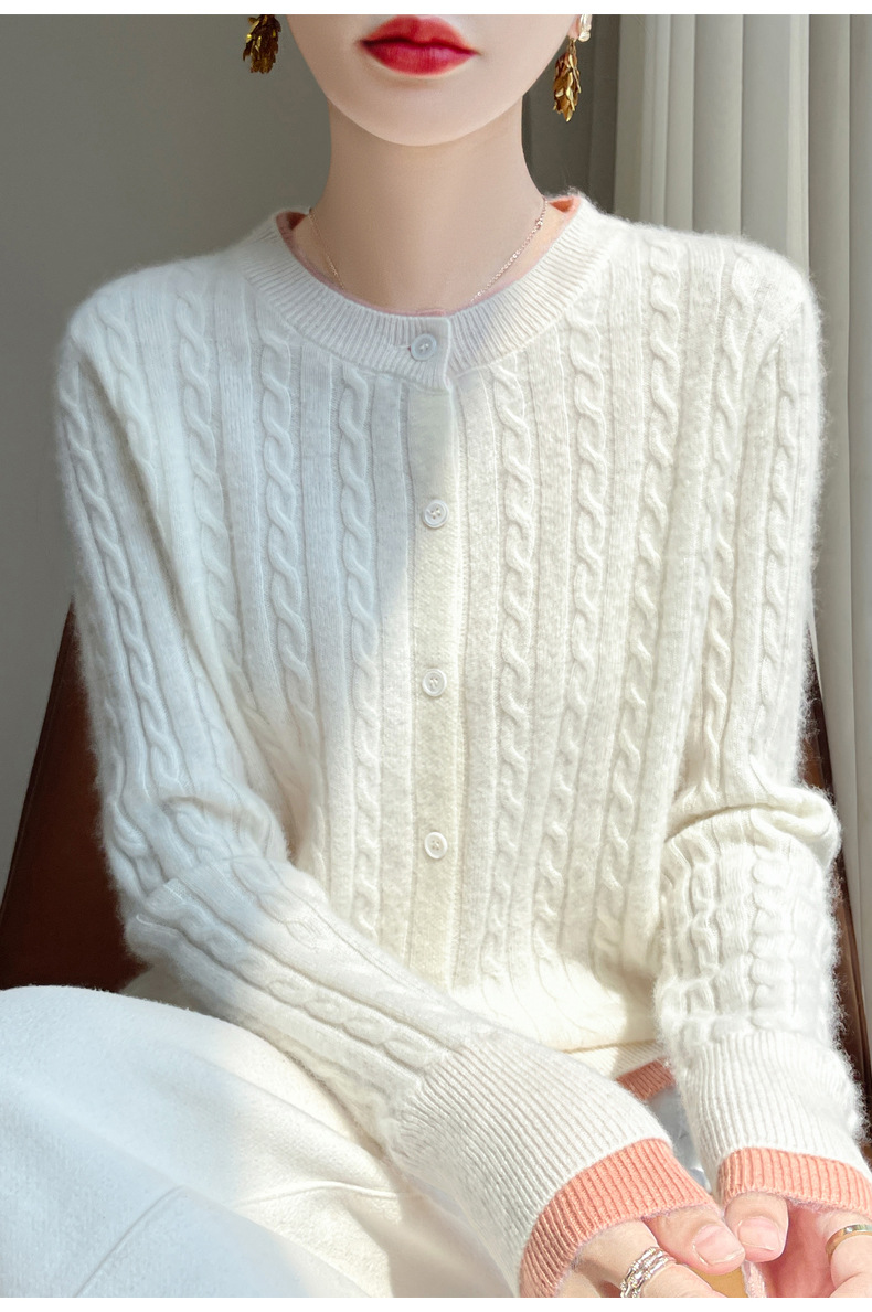 丁摩羊毛混纺秋冬新款女装圆领小麻花拼色时尚保暖短款针织开衫外套5ZF-551