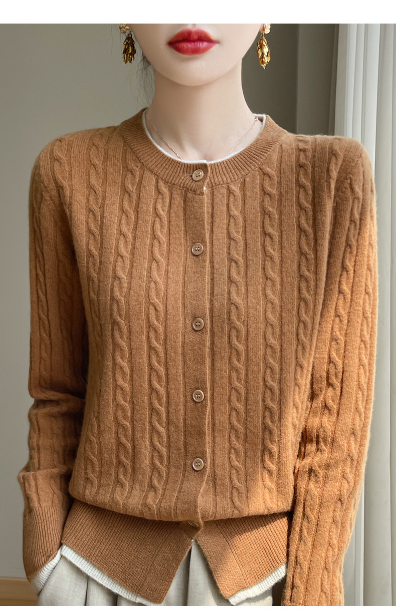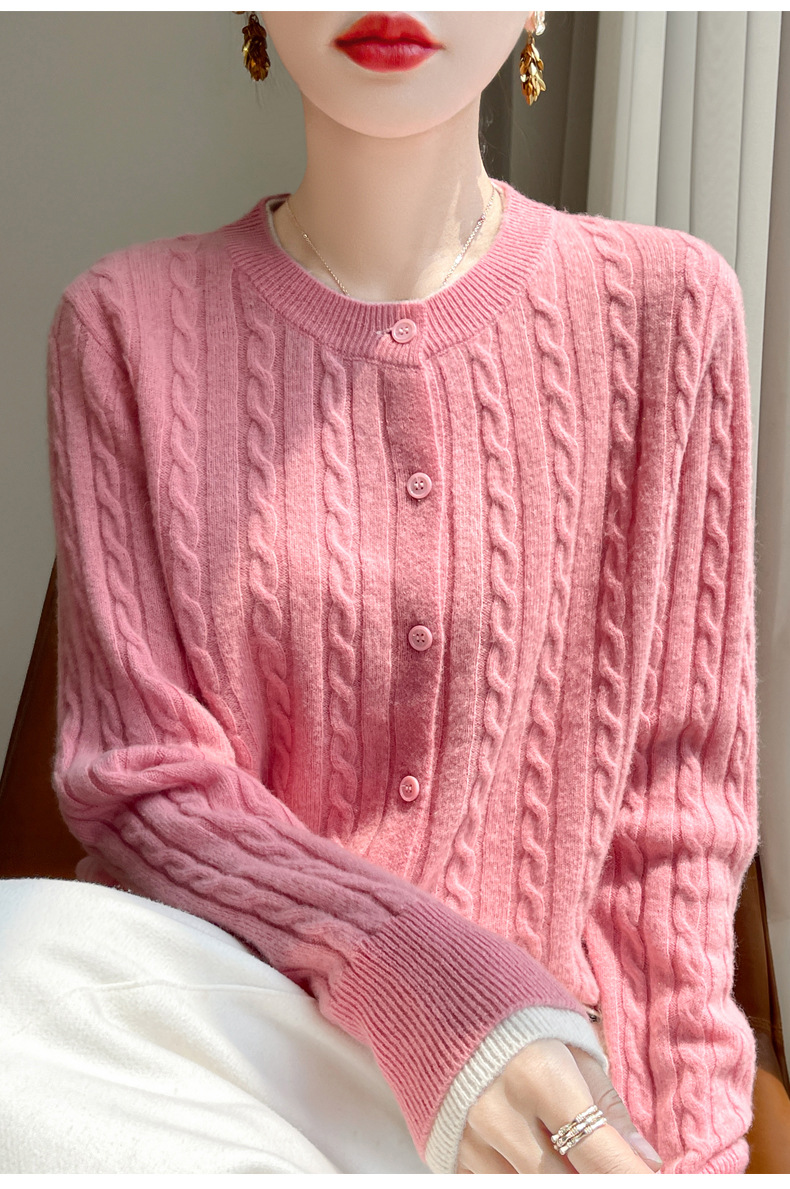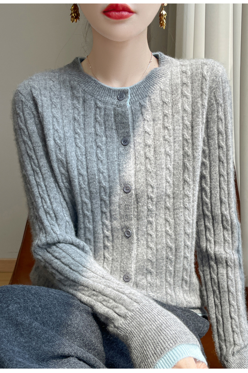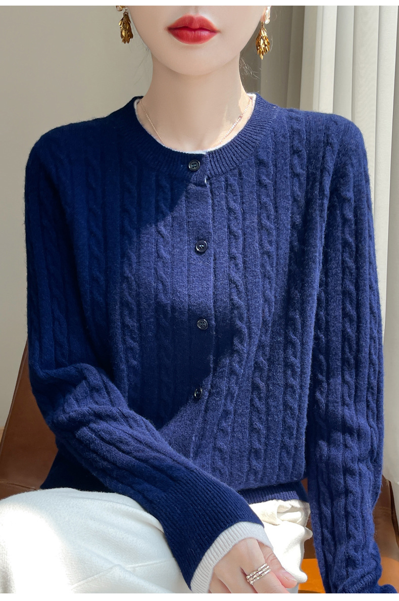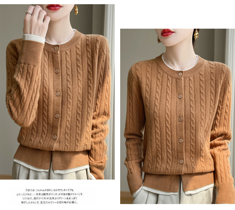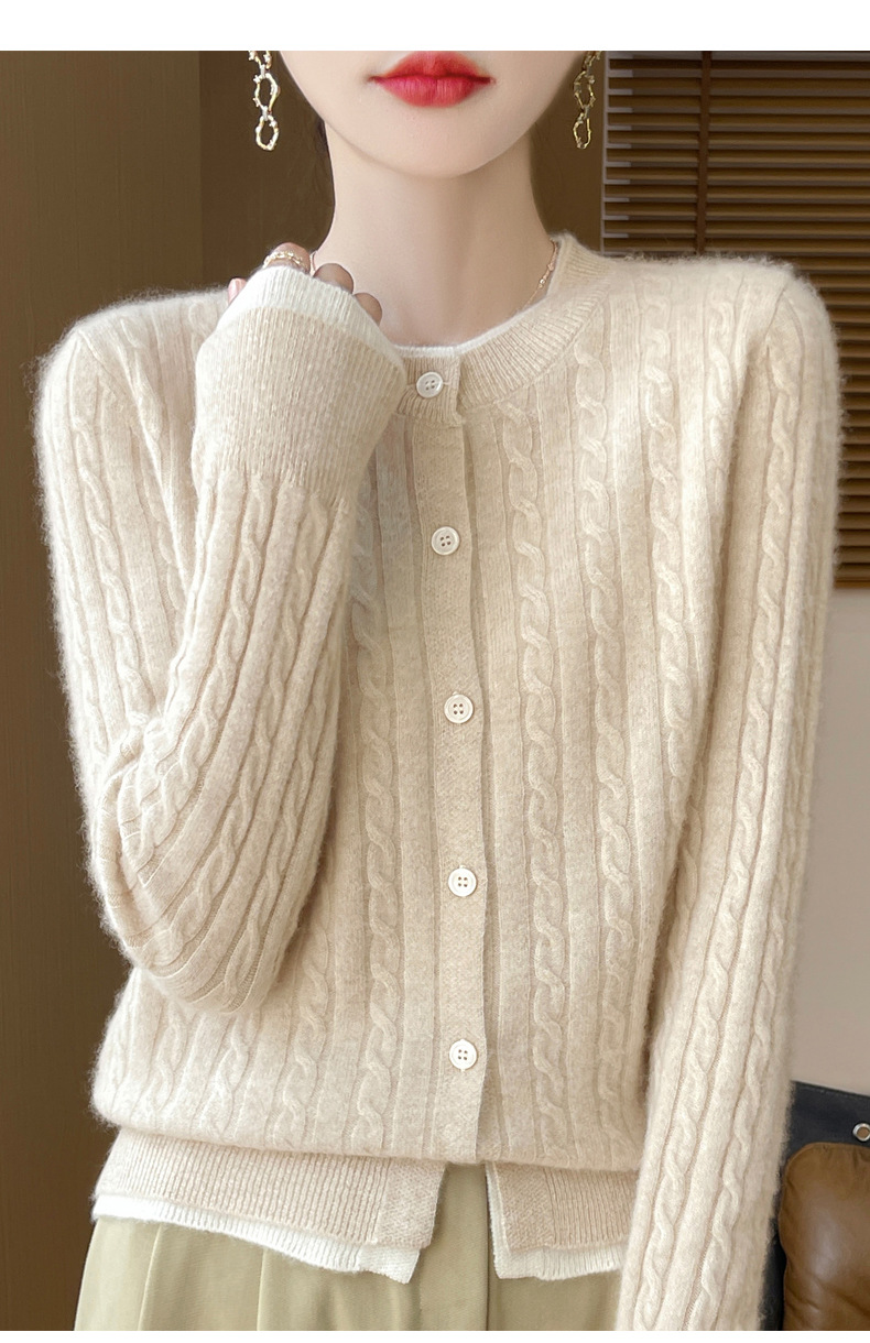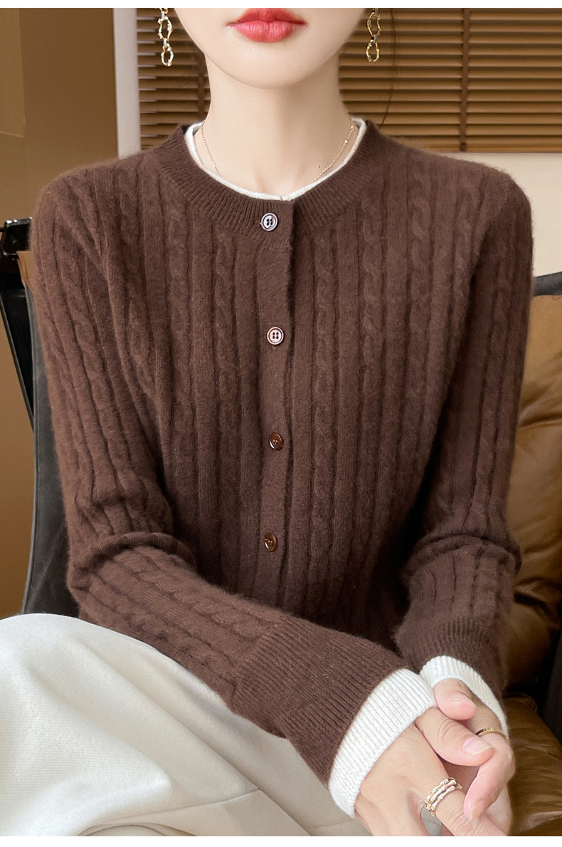 丁摩羊毛混纺秋冬新款女装圆领小麻花拼色时尚保暖短款针织开衫外套5ZF-551