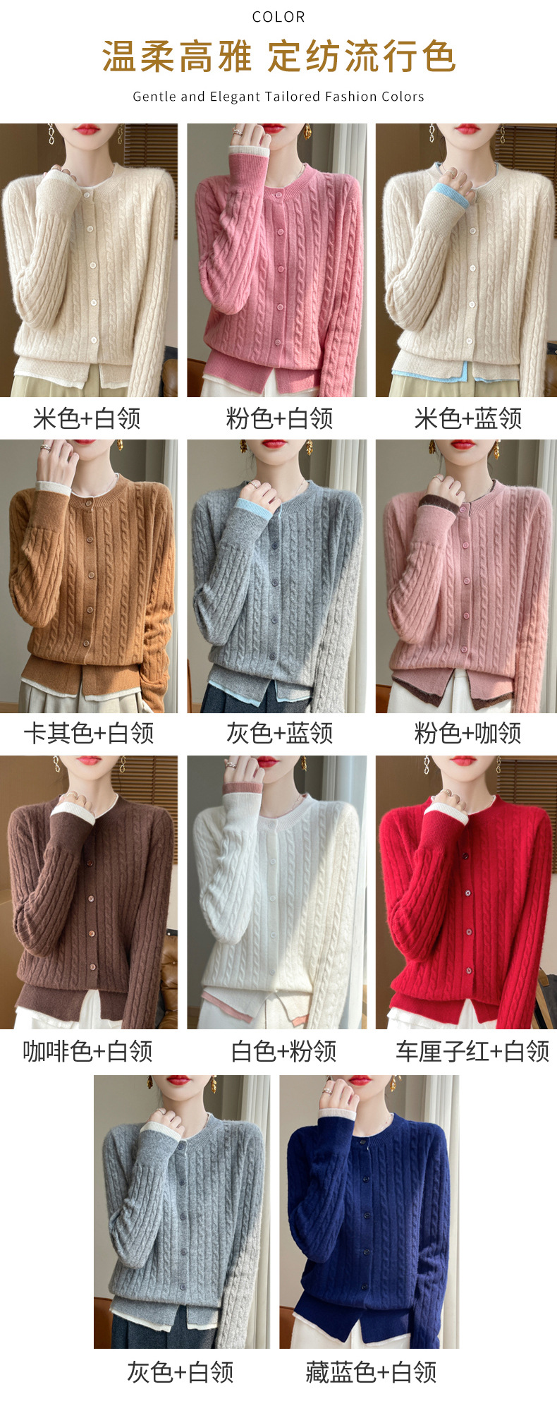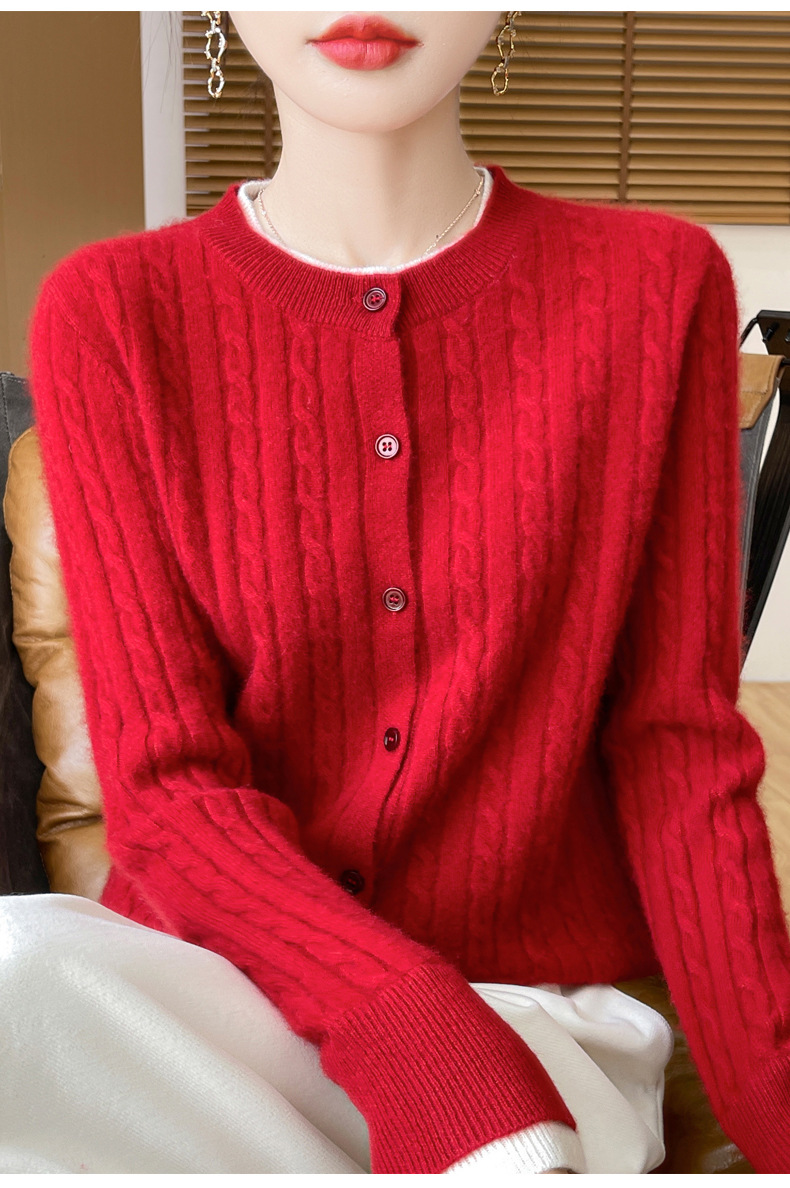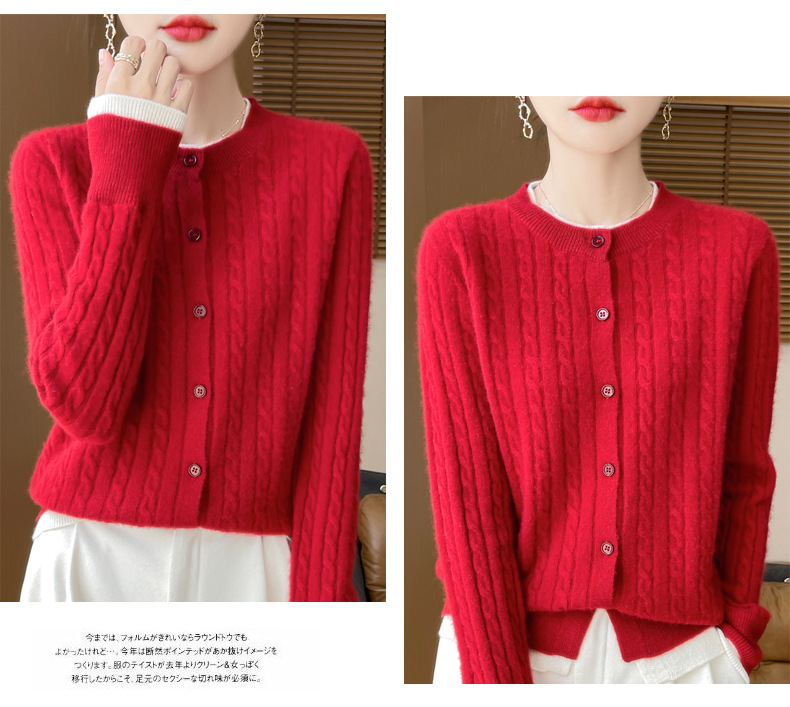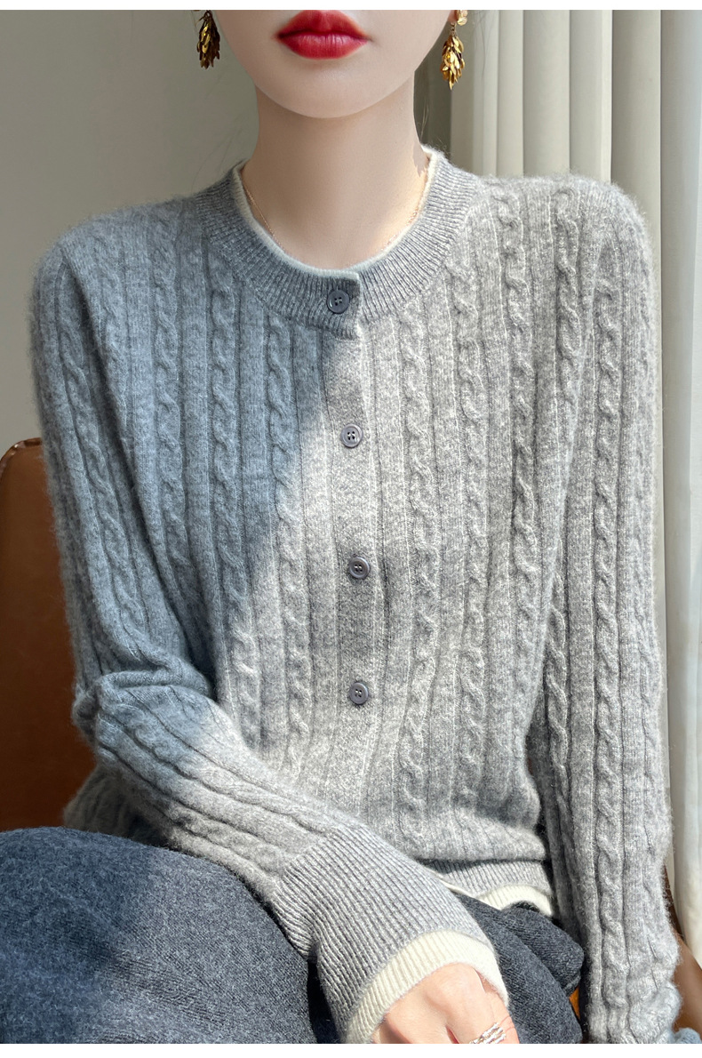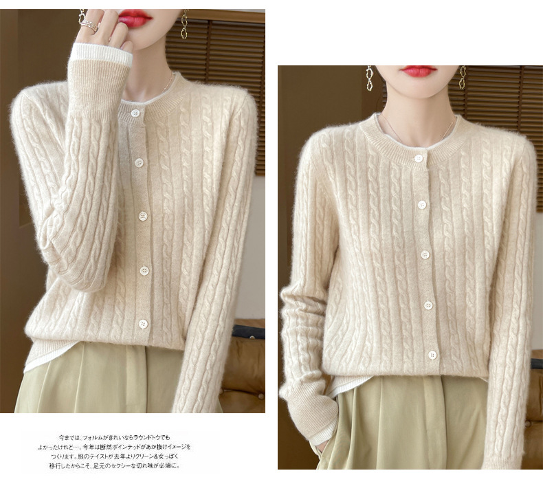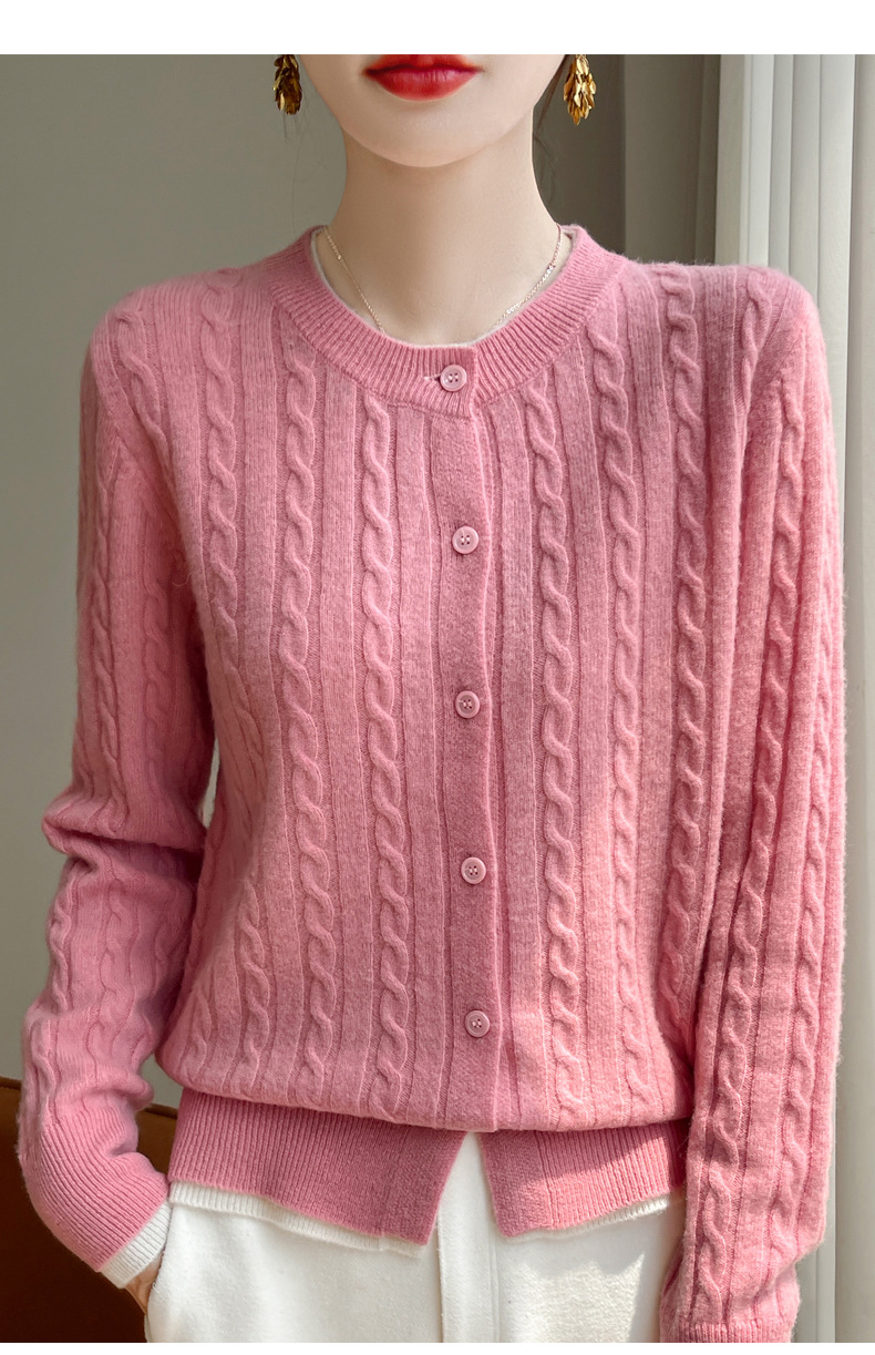 丁摩羊毛混纺秋冬新款女装圆领小麻花拼色时尚保暖短款针织开衫外套5ZF-551