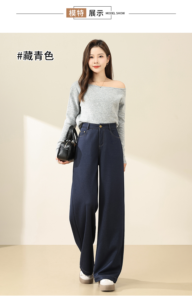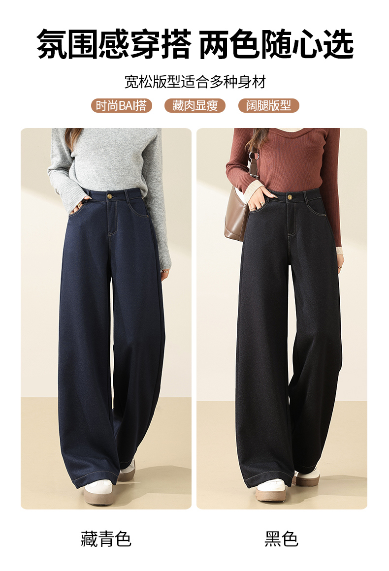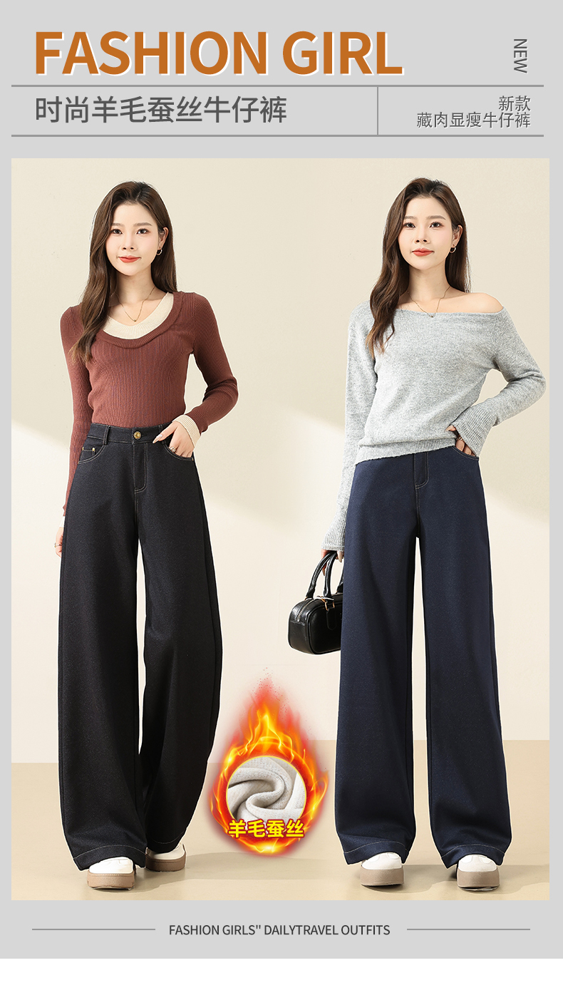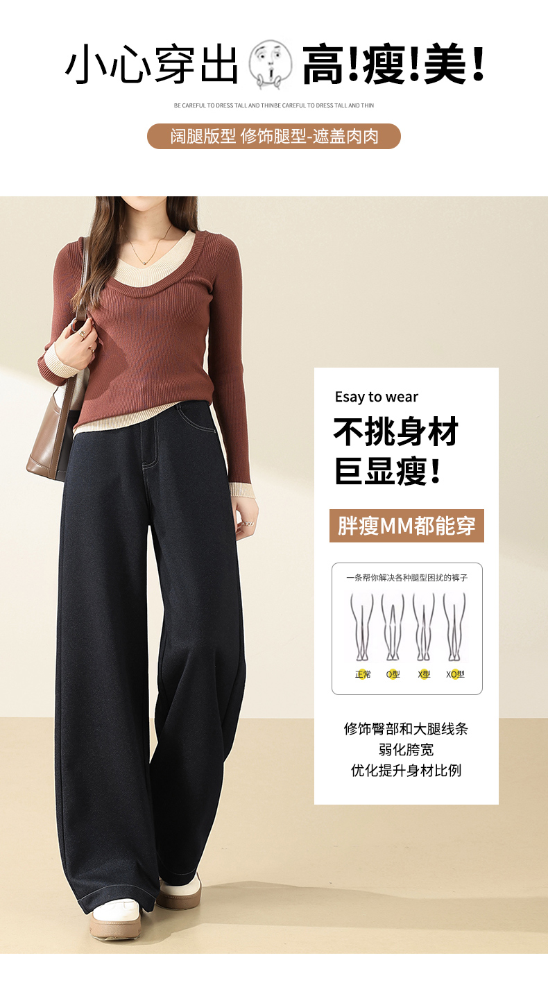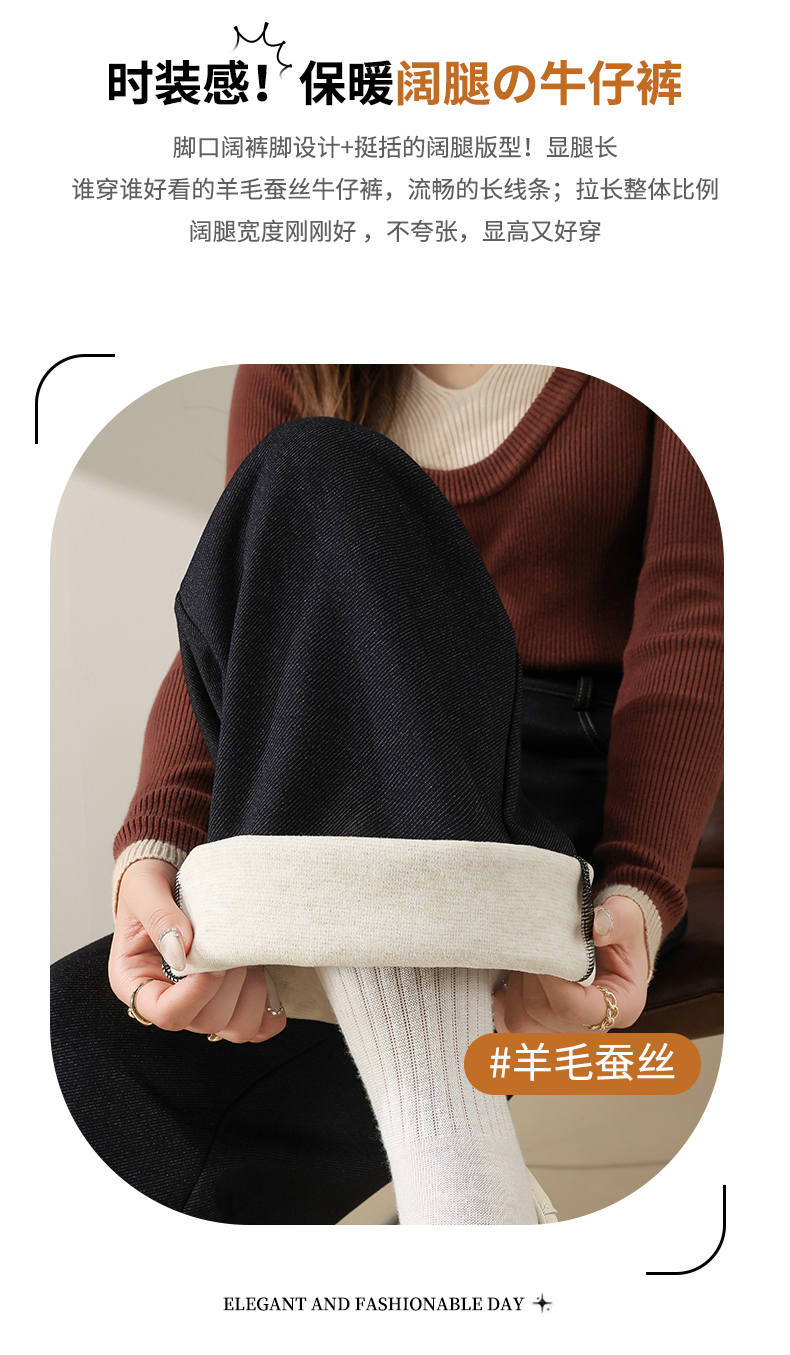 穿出“大长腿”!【亨弥--羊毛蚕丝加绒牛仔裤】舒适高腰超柔面料 羊毛蚕丝加绒内里 宽松直筒阔腿版型 不变形不鼓包不起球 上身效果显瘦遮肉 修饰腿型拉长比例 包容各种身材 时尚圈的扛把子