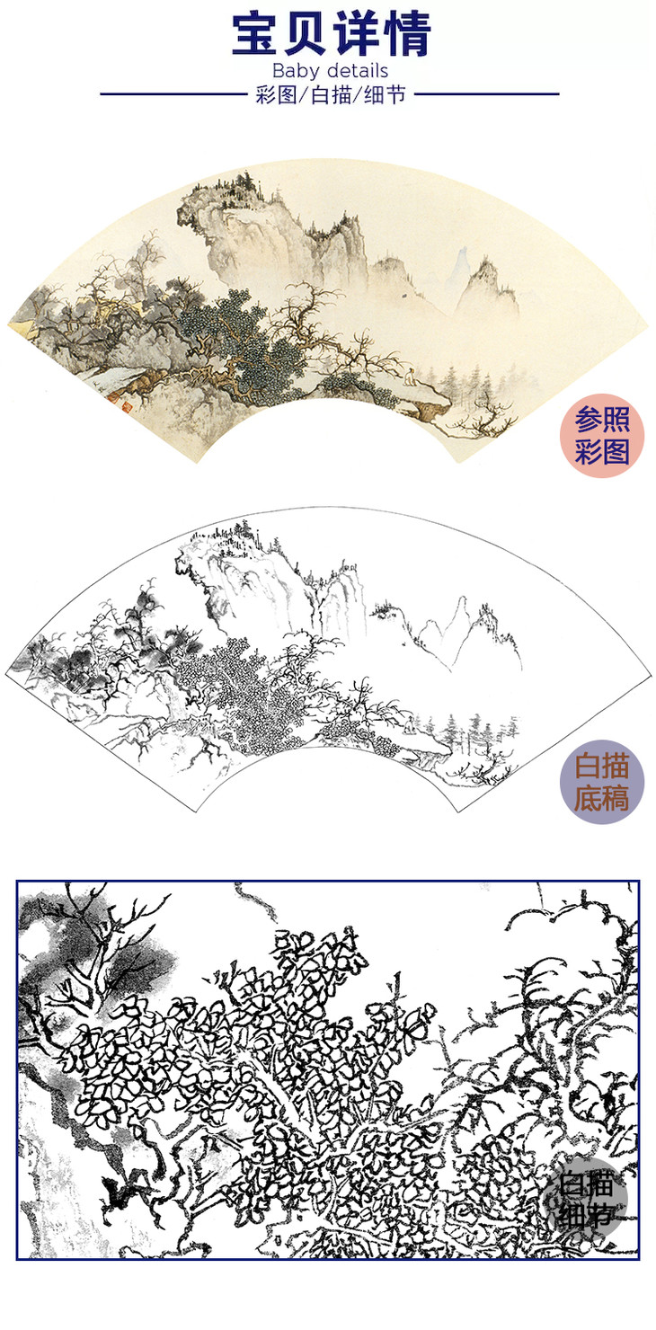 孙天牧工笔山水人物扇面小品白描底稿-《深山远眺》-多种白描尺寸可选-ST25