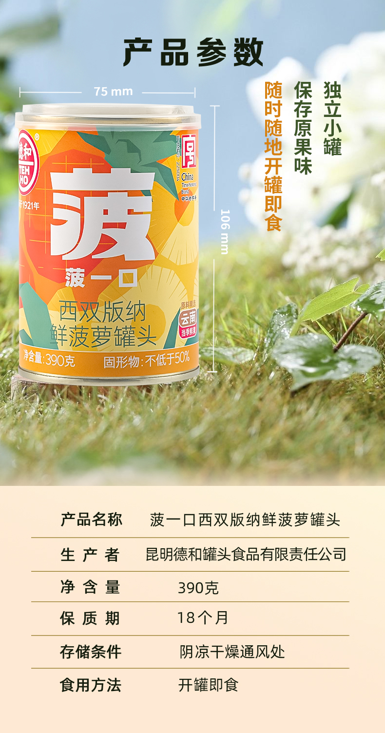 【临期特价,至26年2月】德和 西双版纳 鲜菠萝罐头390g/罐 水果罐头 #润