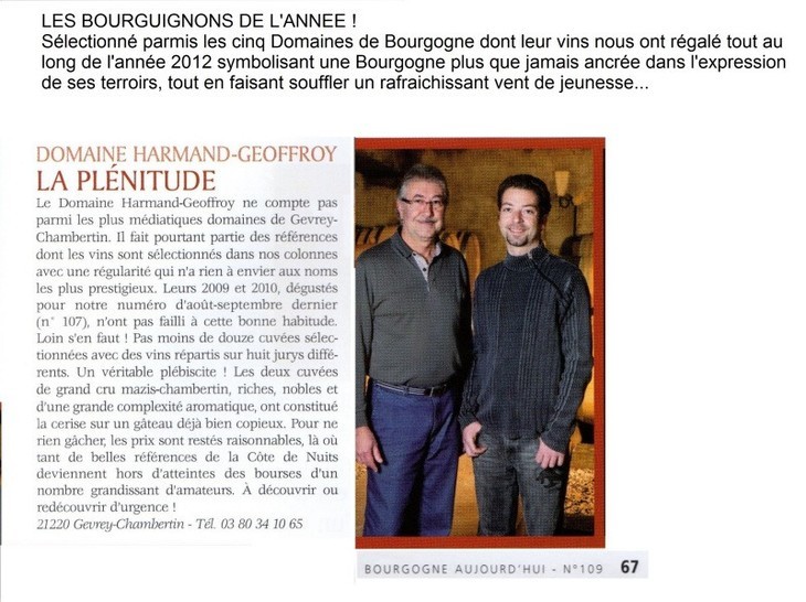 2012年,酒庄被勃艮第最为权威的葡萄酒杂志《今日勃艮第》评为 “年度酒庄”。法国历史悠久的葡萄酒指南之一、“法国葡萄酒业圣经”《桦榭葡萄酒指南》(Guide Hachette des Vins)自1991年起,每年都会高分推荐Harmand-Geoffroy酒庄。