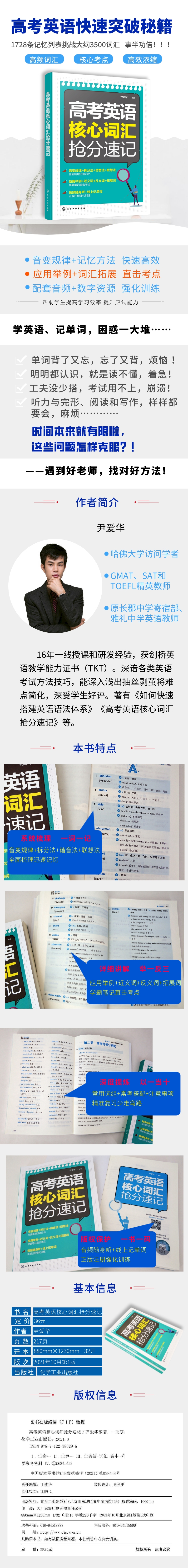 《高考英语核心词汇抢分速记》根据作者多年的教学研究经验编写而成,书中对英文词汇从元音互换、清辅音和浊辅音互换、音的脱落、形近字母的变化、规则变化、字母顺序的改变、合成(缩合)词七个方面的音变规律进行了细致的梳理和总结。本书排名靠前部分为词汇,每一条词汇包括语义、用法及记忆方法(包括词根词缀拆分法、谐音法、联想法等);第二部分对高中必备词组、短语进行了归纳,对其含义进行了精准的讲解,并列有精彩例句。图书配套音频等数字资源,方便考生随时练习。