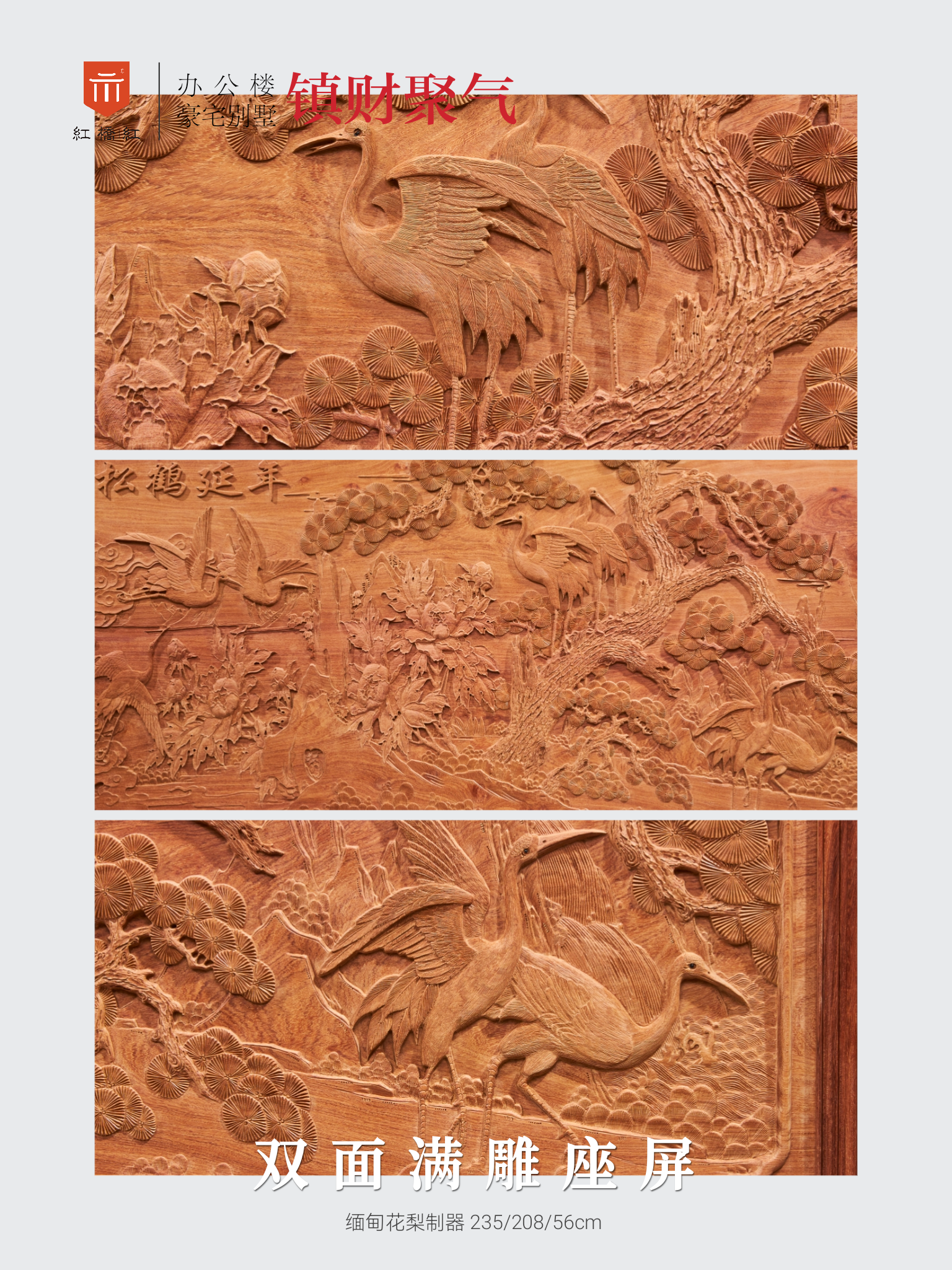 屏风由插屏和底座两部分组成,插屏可装可卸。四周攒边框,中间加屏芯,两面深雕,纯手工制作,屏芯正面雕松鹤延年,有吉祥长寿,志洁高尚之意。四周雕福字及缠枝连理纹。屏芯反面满雕花开富贵,表达我们对幸福美满生活的期待和向往。底座其立柱限紧插屏,站牙稳定立柱,横座档承受插屏,起稳定作用,底部满雕吉祥纹饰,与上部插屏相呼应。