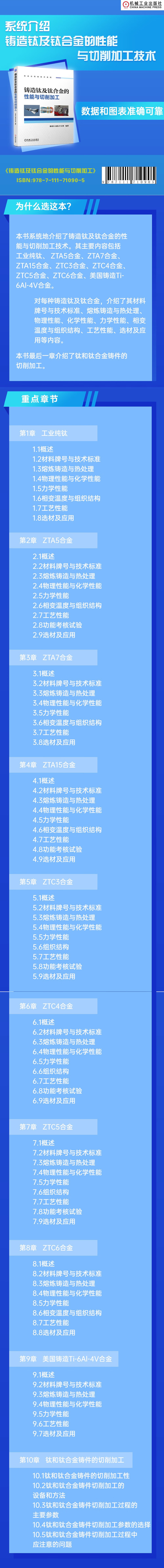 为满足铸件生产应用的需要和方便铸造钛及钛合金研究,作者对国内已有的8种铸造钛及钛合金的性能进行了汇总,并对美国铸造Ti-6Al-4V合金的性能进行了全面介绍。本书最.后一章介绍了钛和钛合金铸件的切削加工。