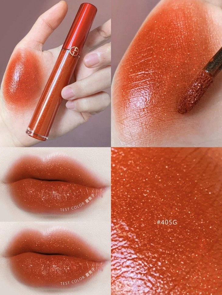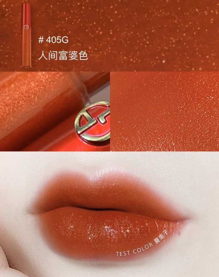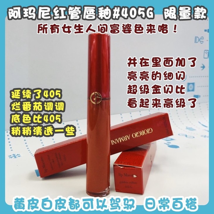 阿玛尼红管唇釉#405G 限量款👍所有女生,人间富婆色👄来咯!!405G延续了405的烂番茄调调🍅,底色比405稍稍清透一些,并在里面加了亮亮的细闪✨。超级金闪,比大片闪片看起来高级了hin多喲😎~上嘴就是blingbling的感觉❤,涂上有钱小姐姐就是你啦👛,黄皮白皮都可以驾驭,日常百搭✔。这支必须给我安排上!!