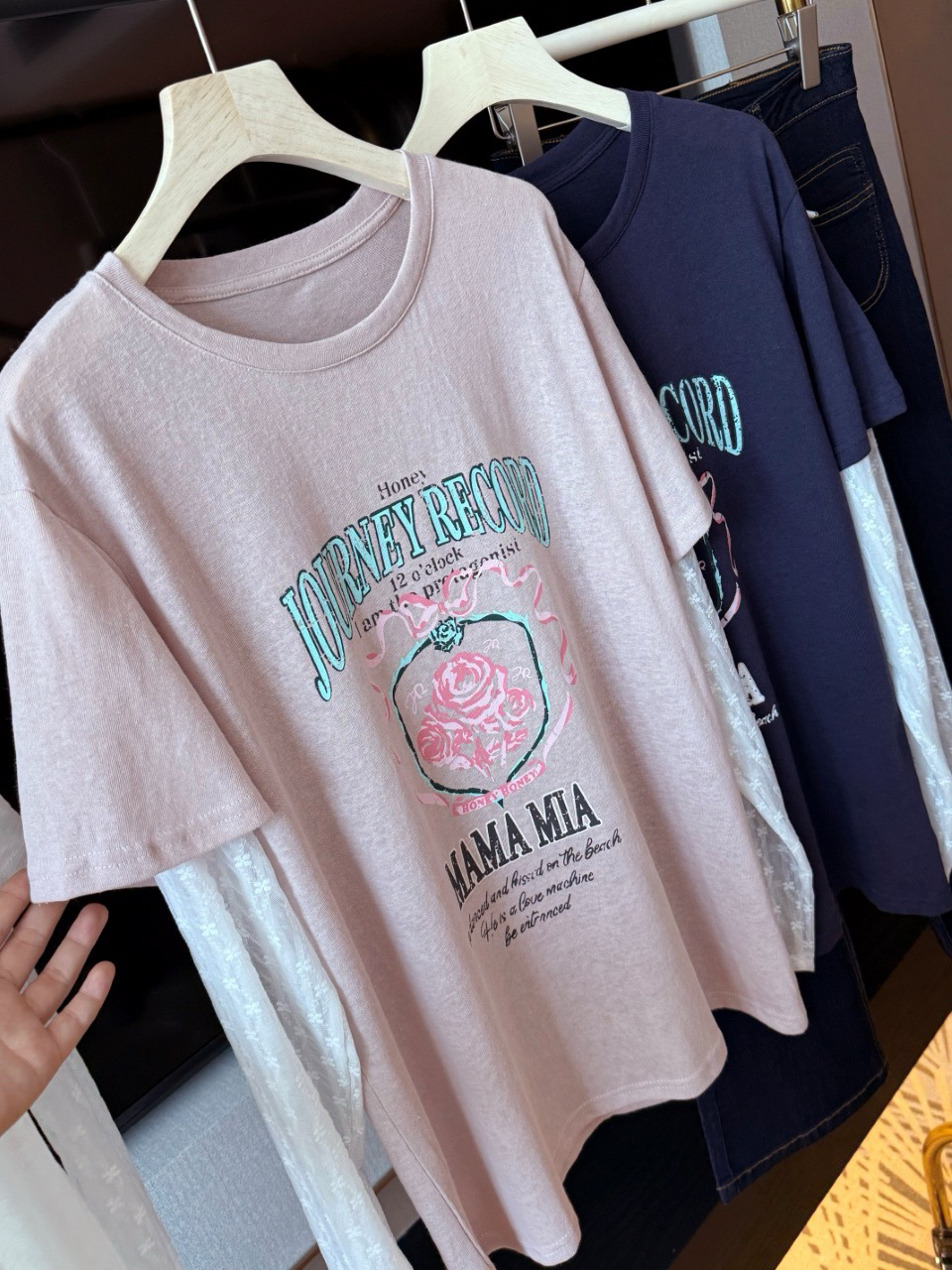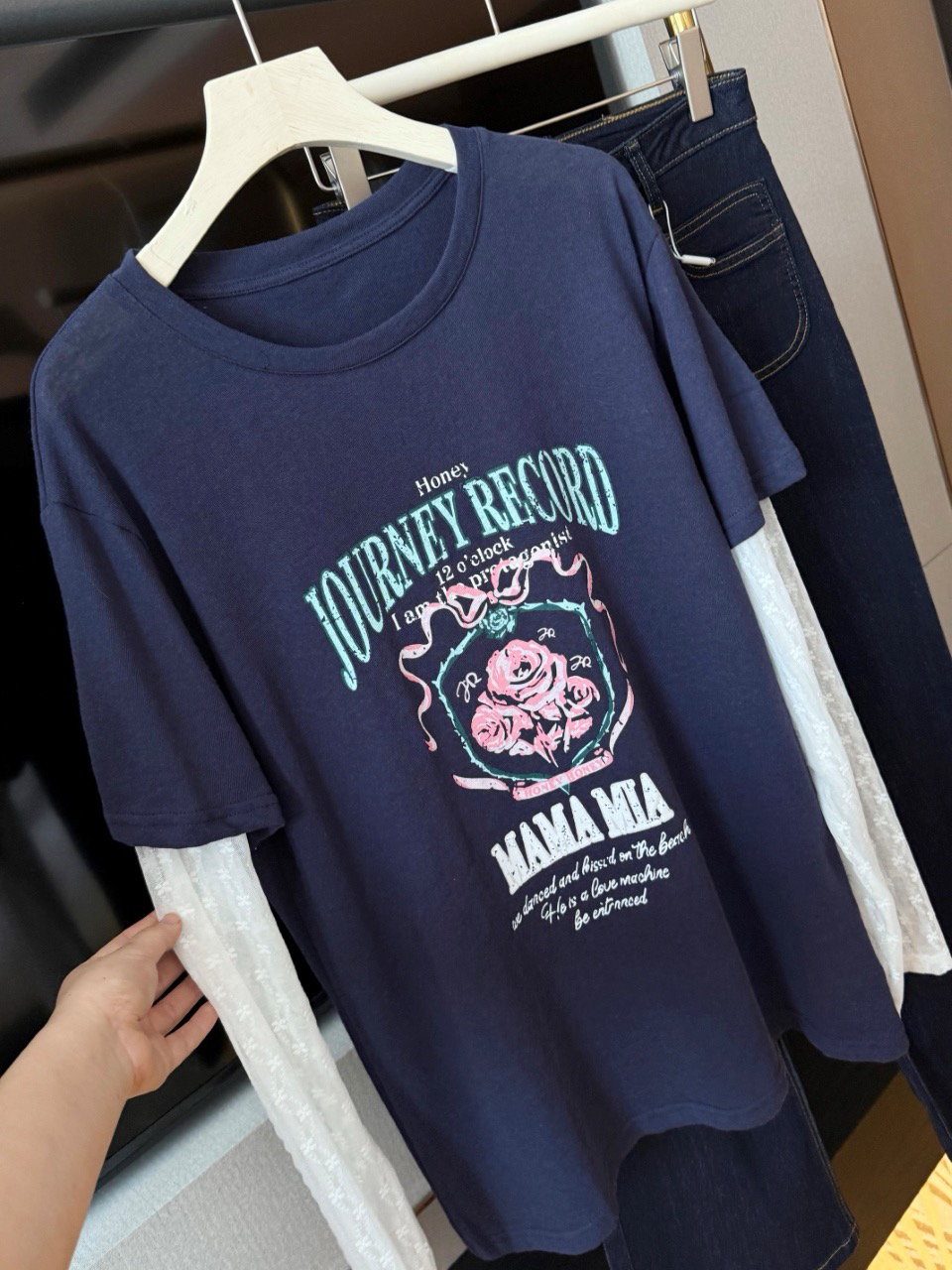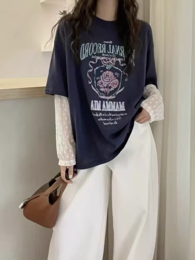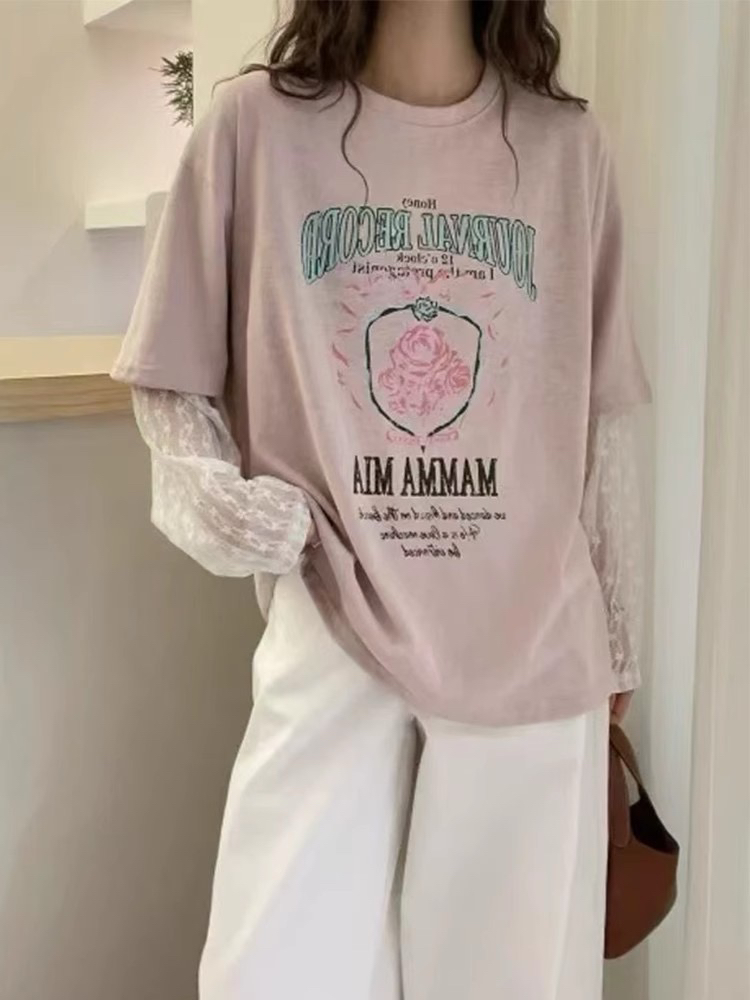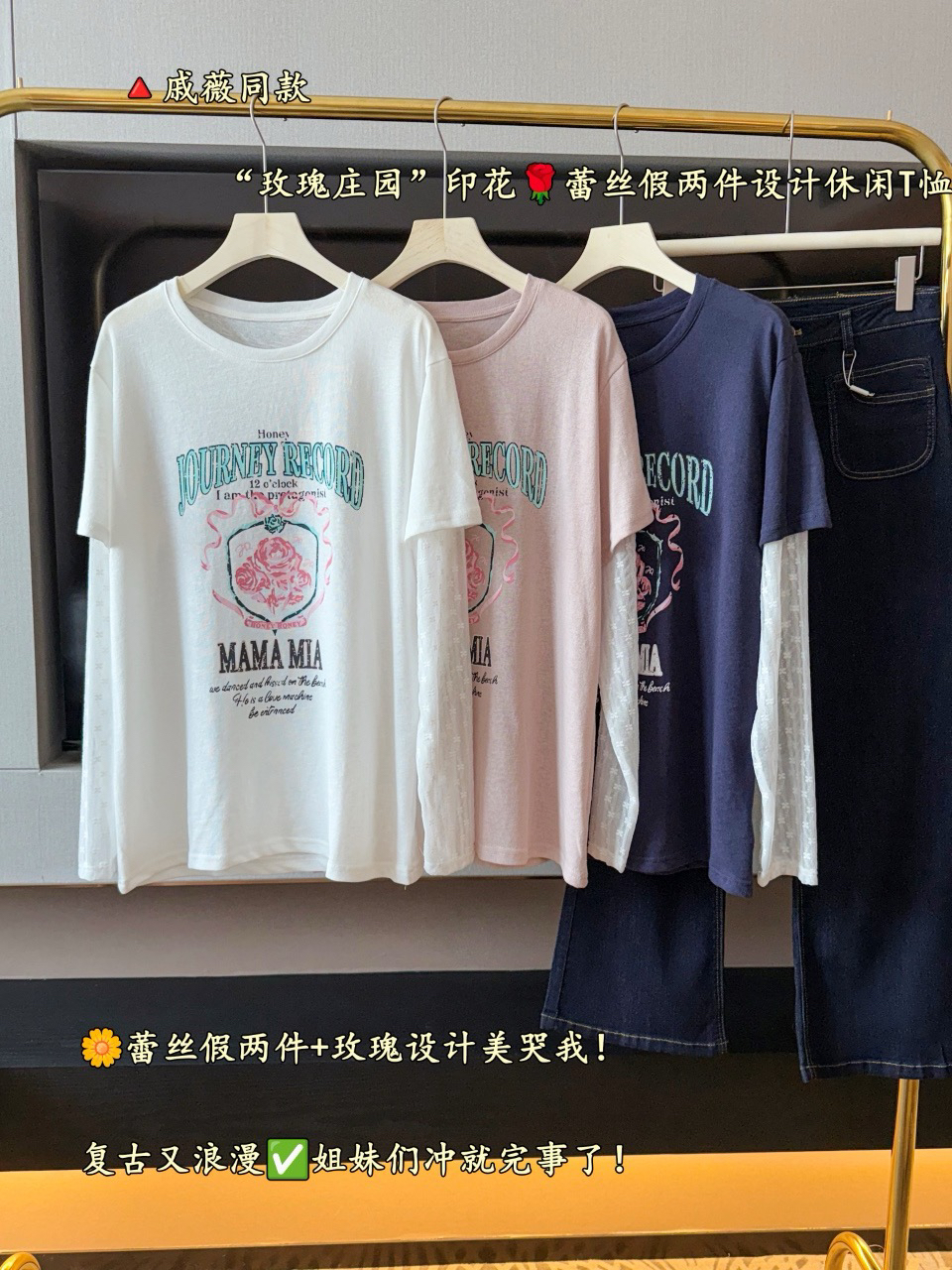 戚薇同款“玫瑰庄园”印花蕾丝假两件设计休闲T恤!也太绝了吧!