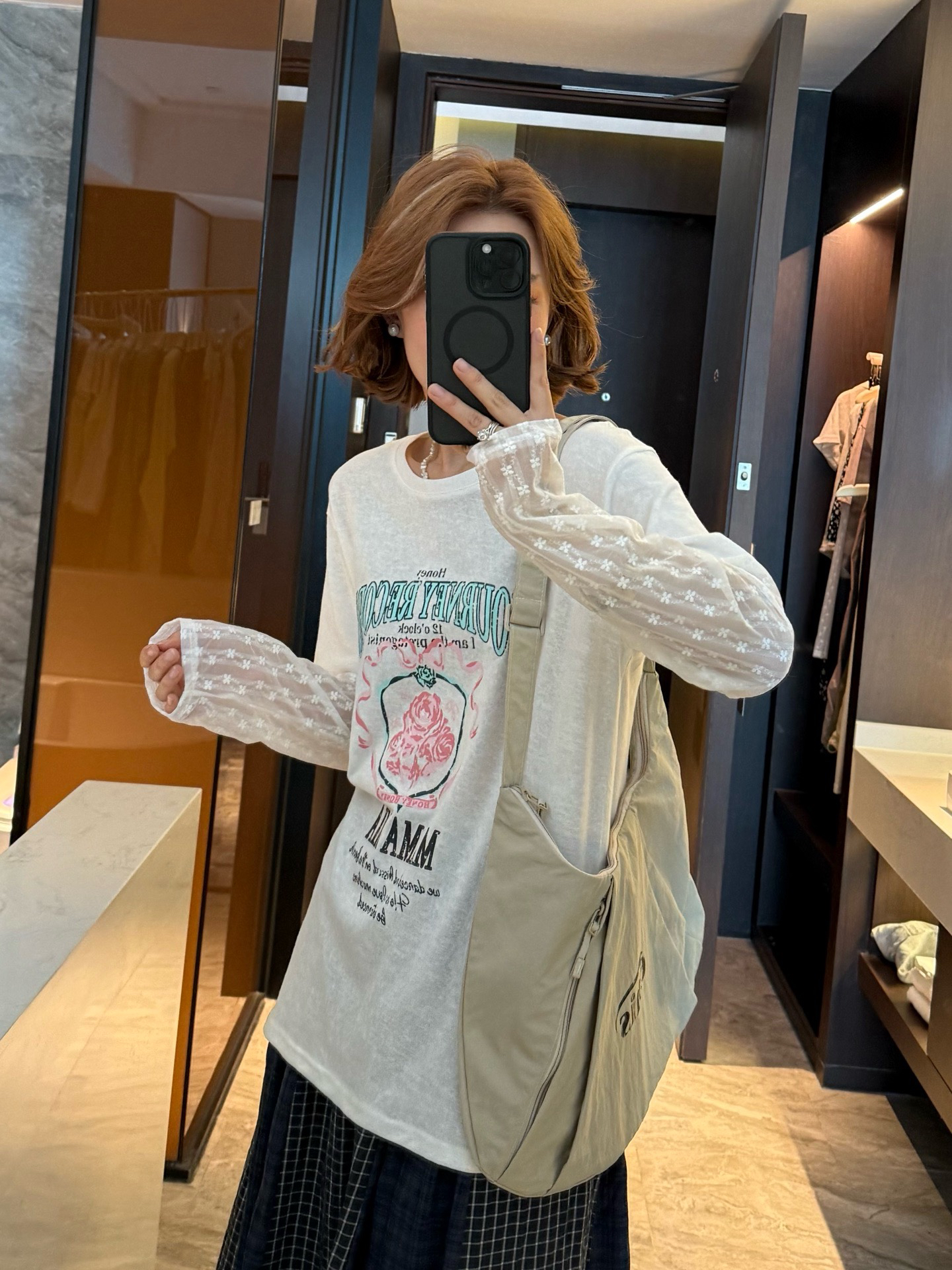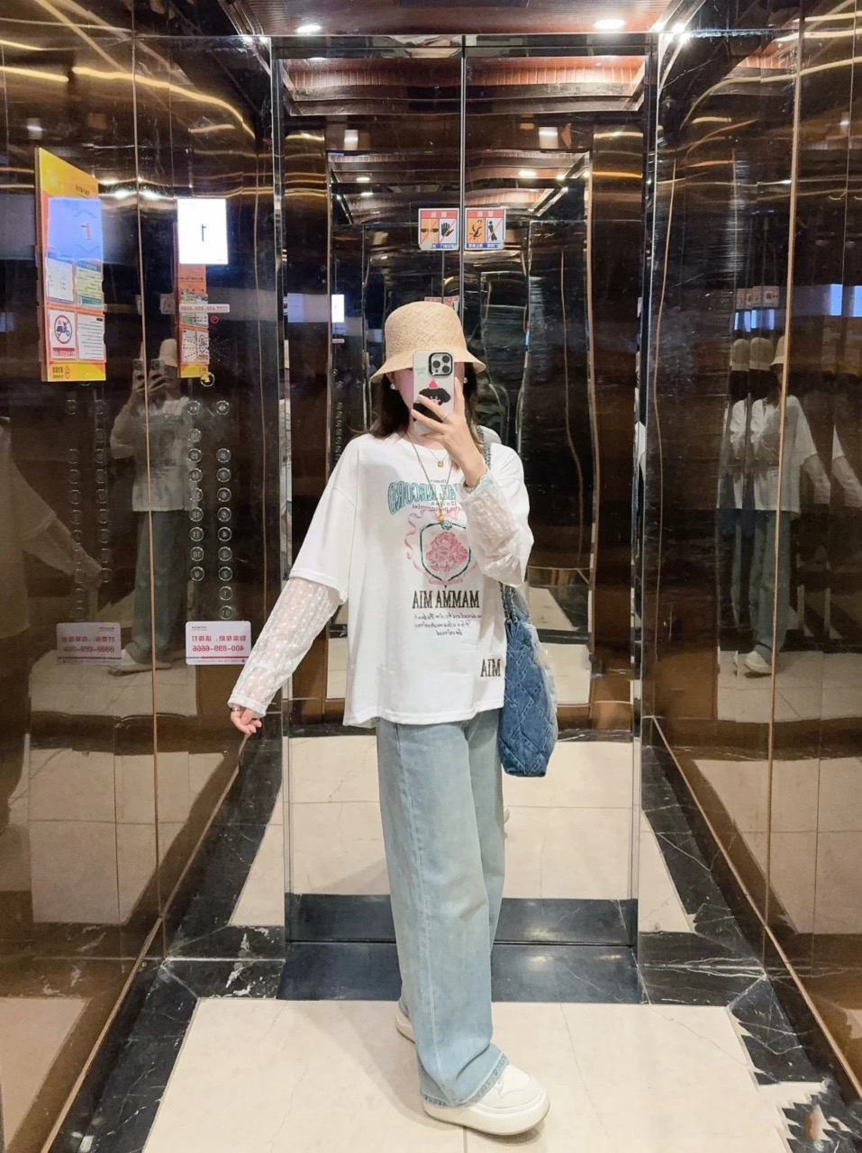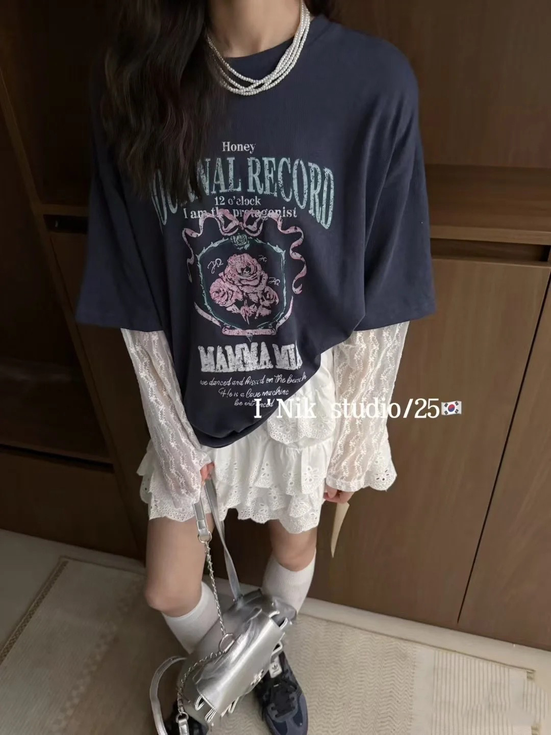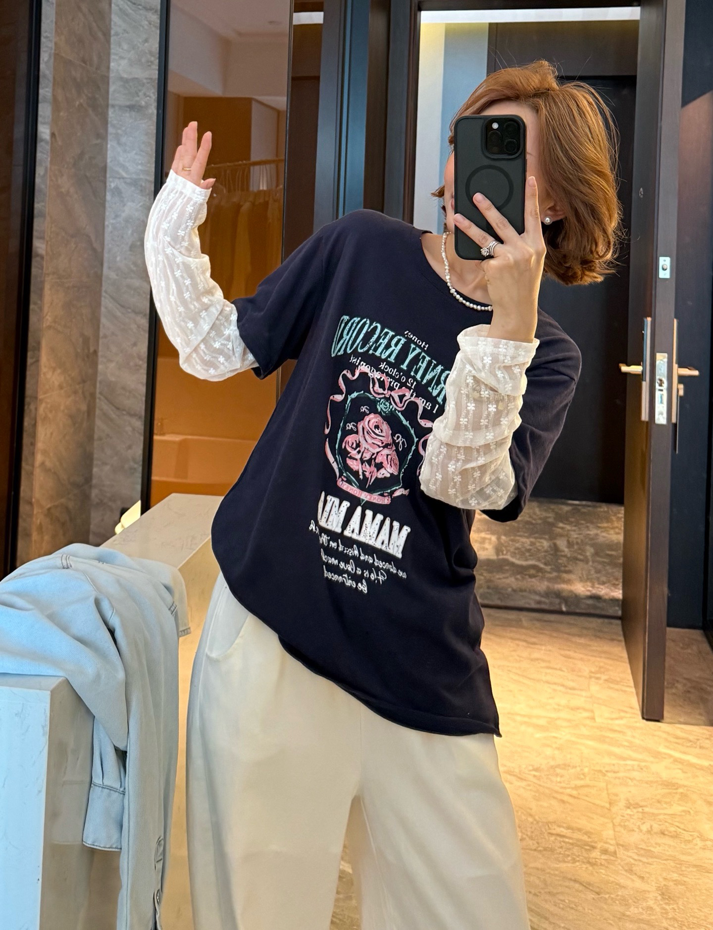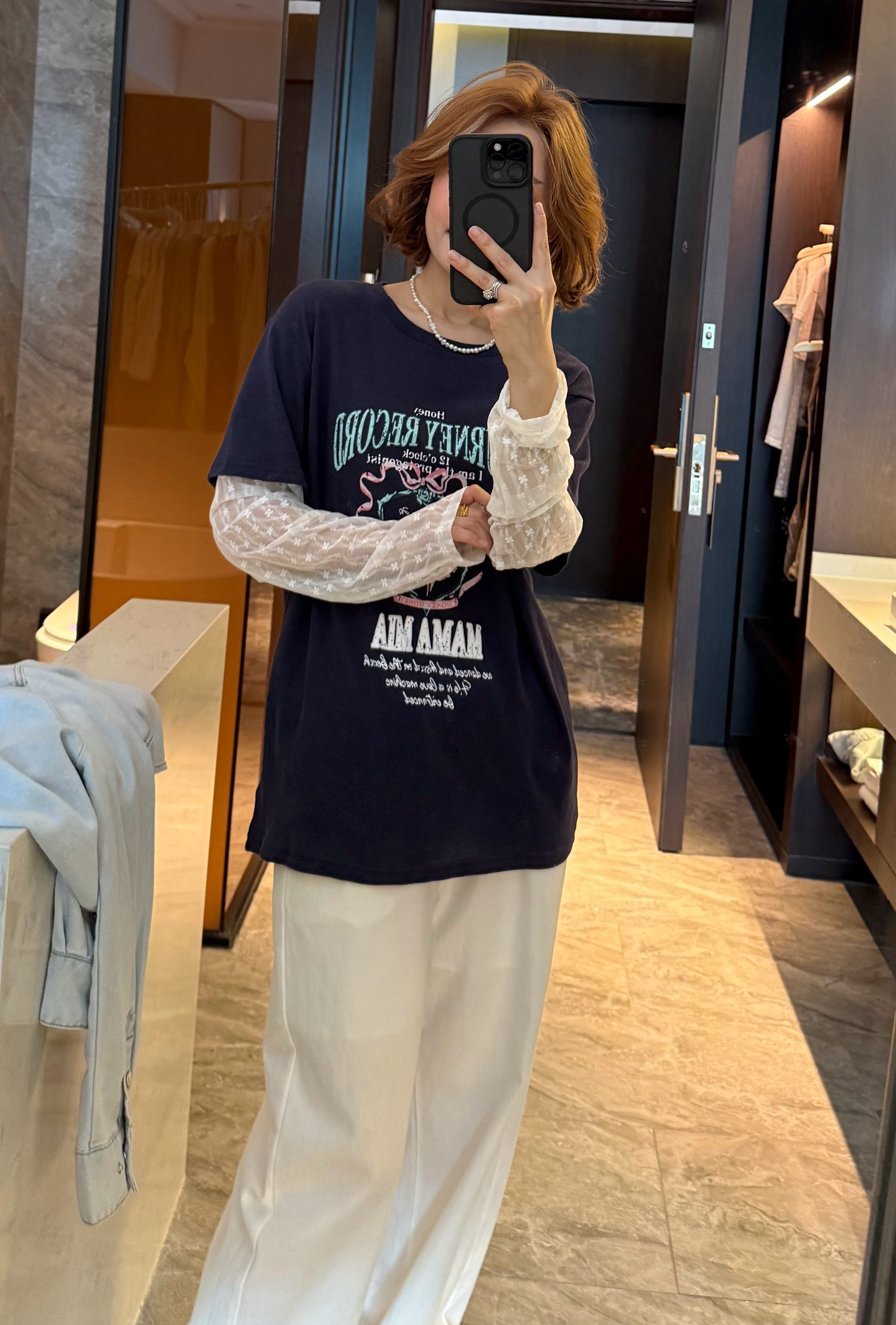 戚薇同款“玫瑰庄园”印花蕾丝假两件设计休闲T恤!也太绝了吧!