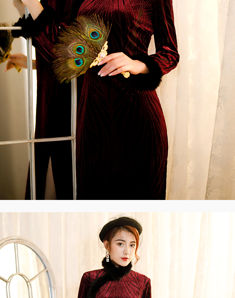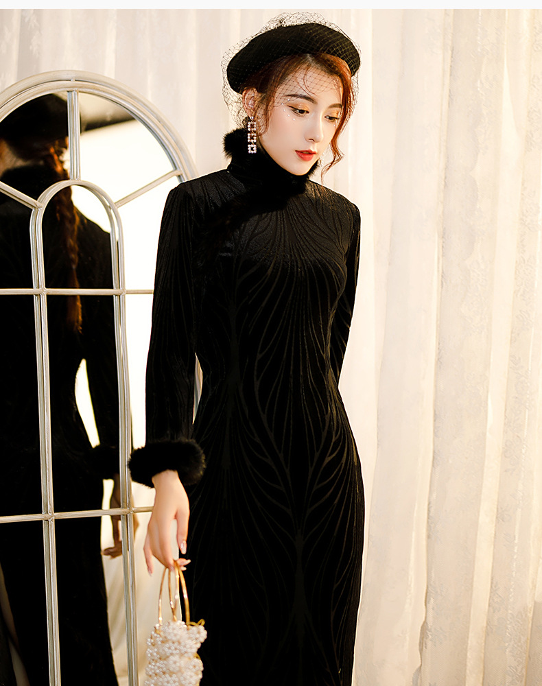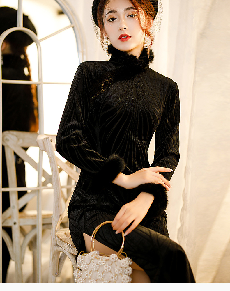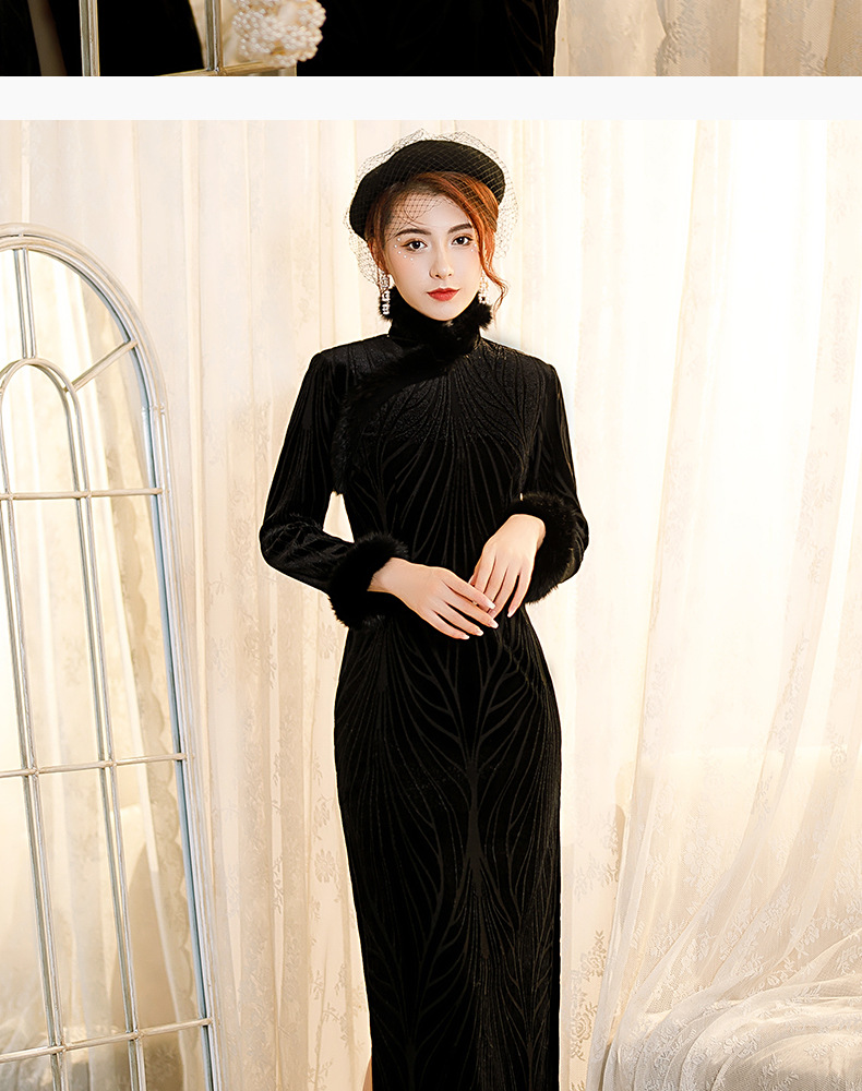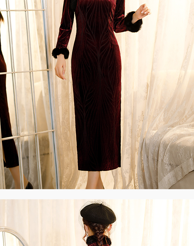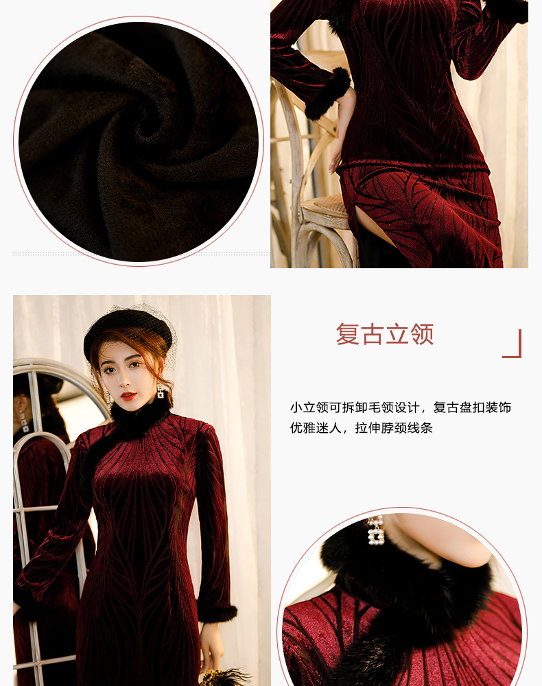 HQ-JYC-056加绒加厚绣花毛领优雅气质改良旗袍复古中国风连衣裙