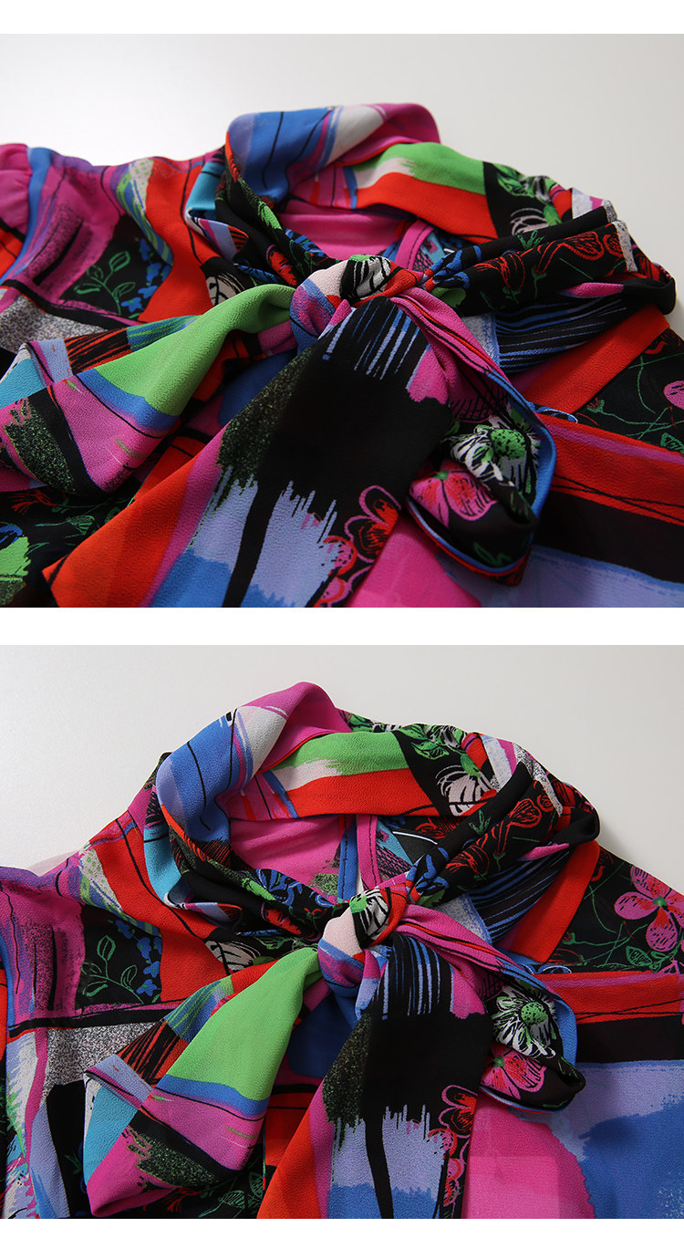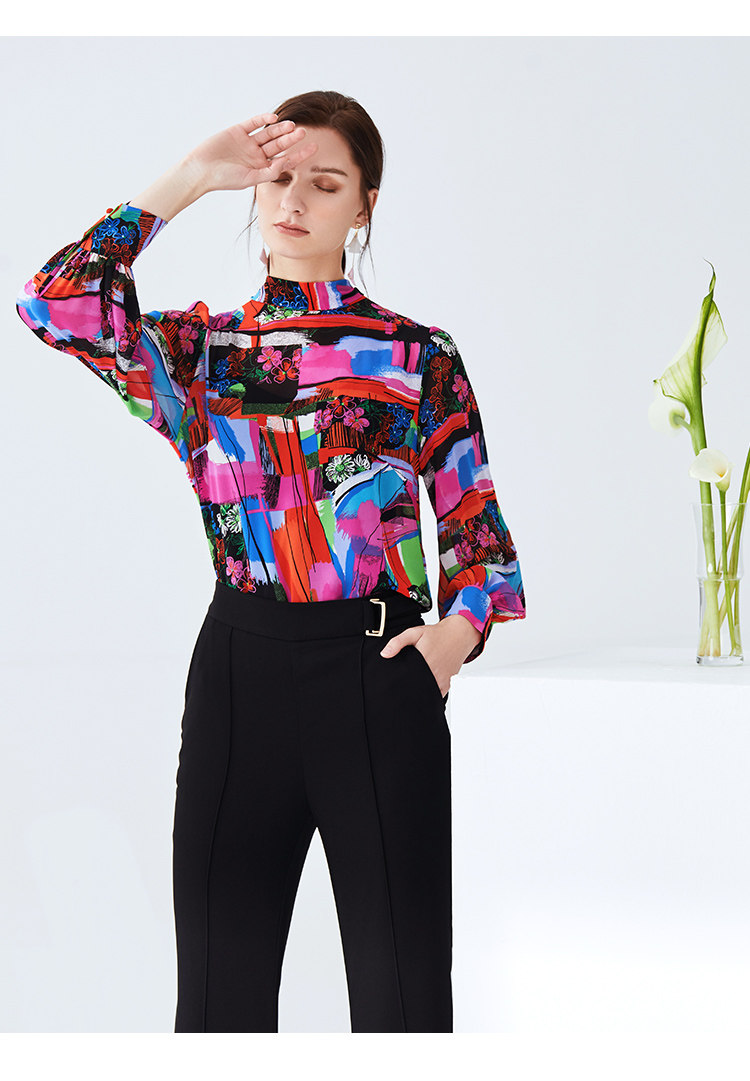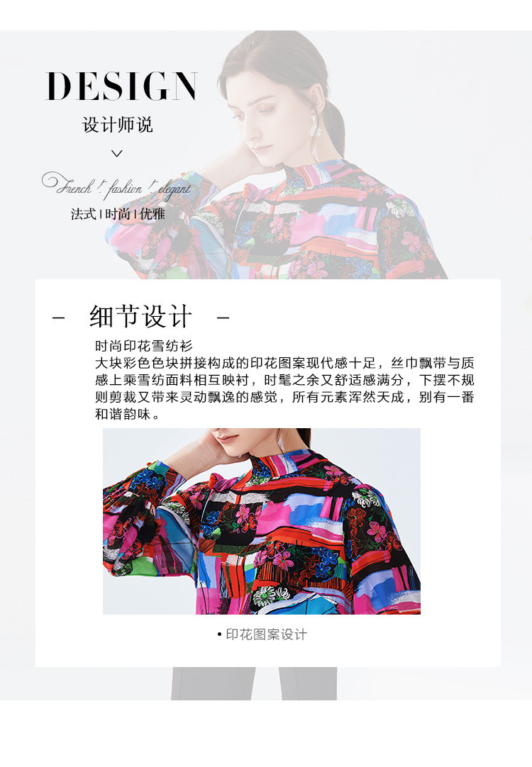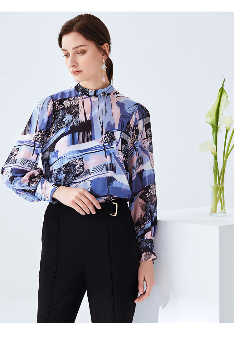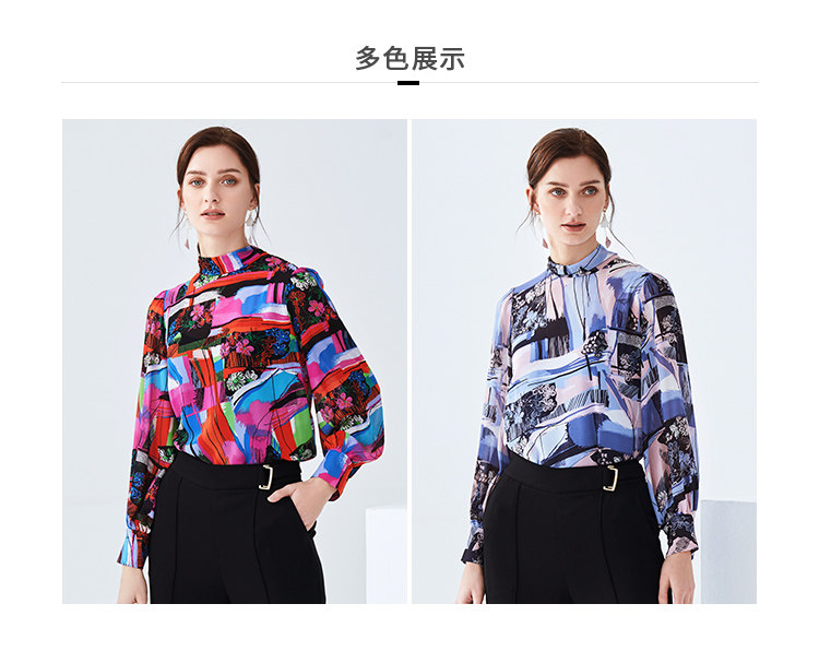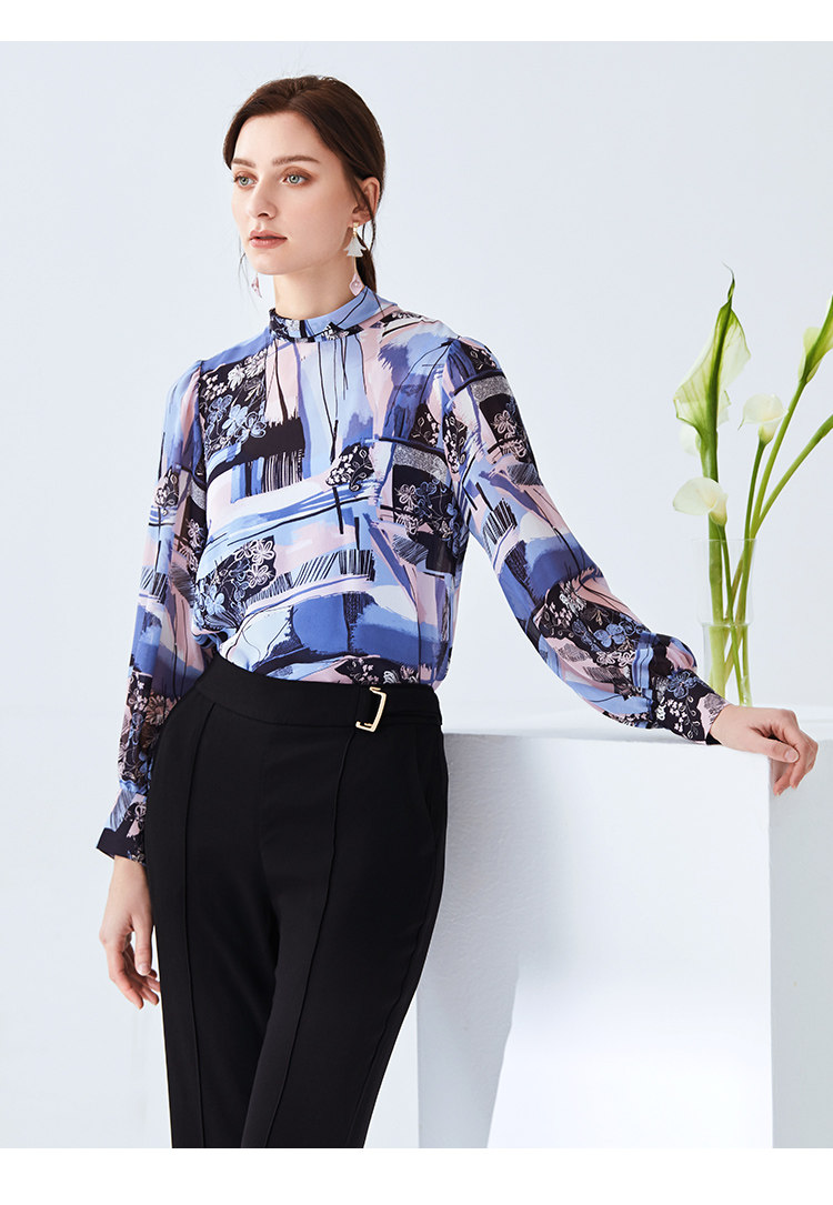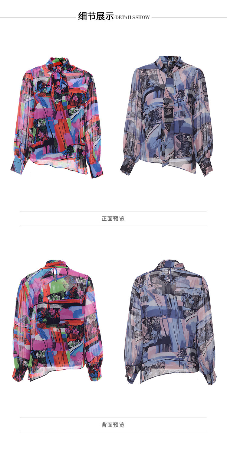EITIE爱特爱夏季新款时尚通勤撞色印花立领飘带衬衫女上衣5913608