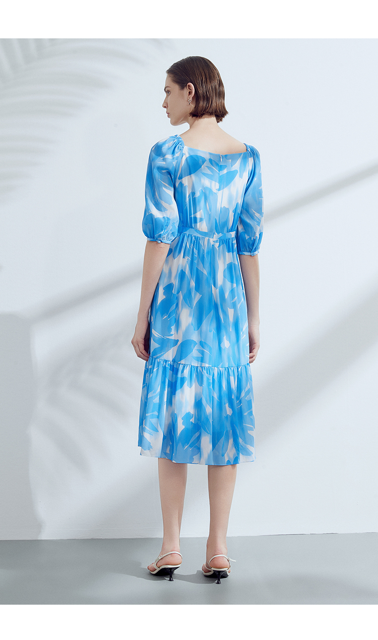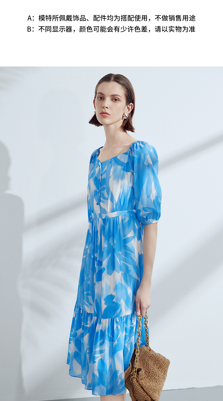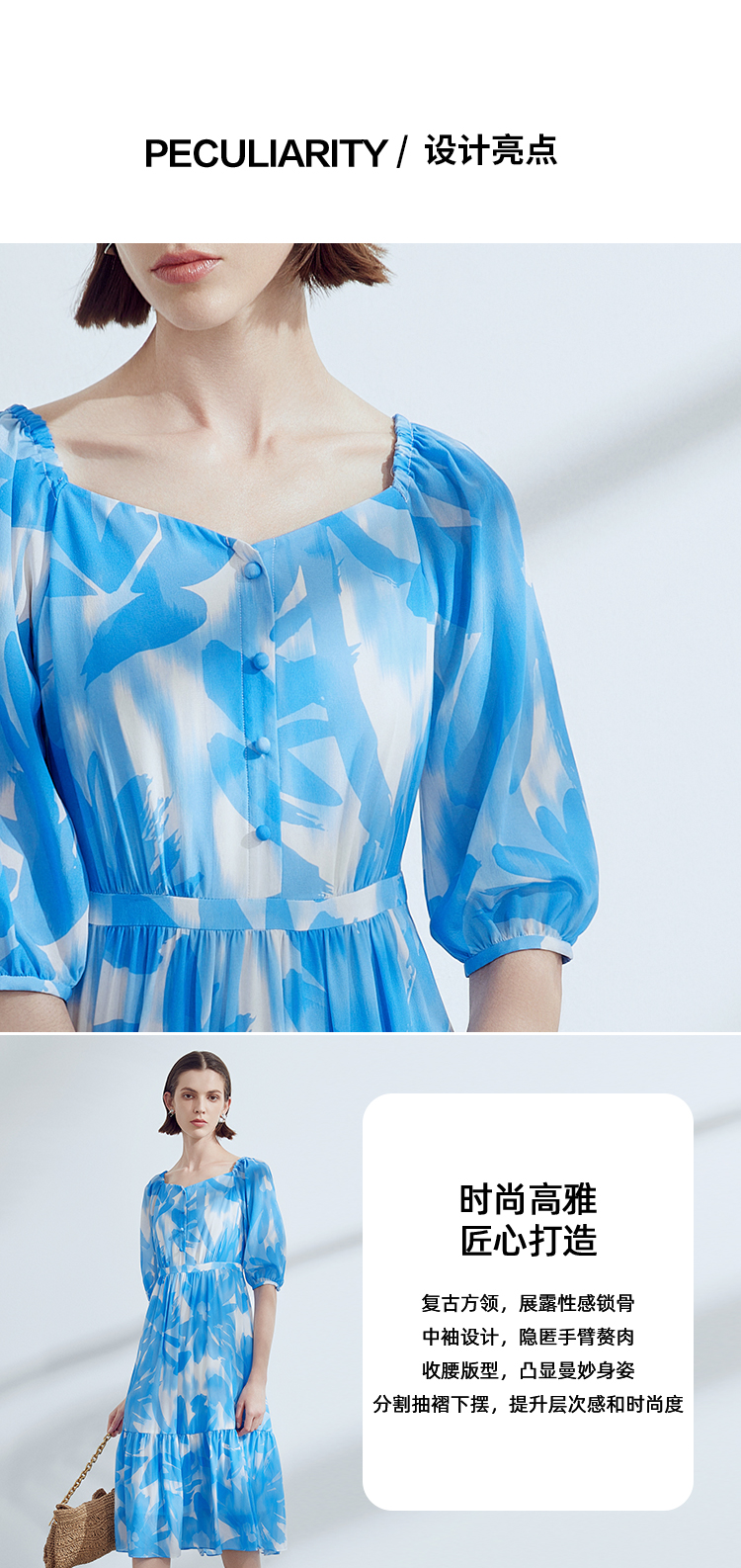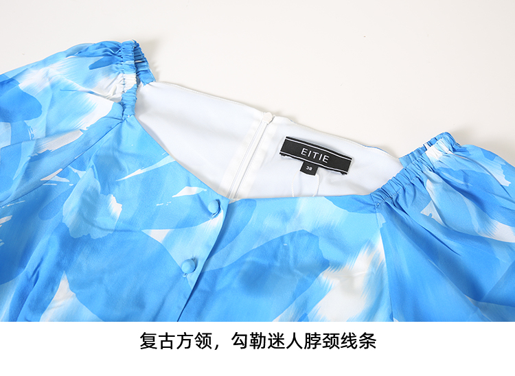 EITIE爱特爱夏季新款显瘦高腰洋气桃心领五分袖印花连衣裙7807566