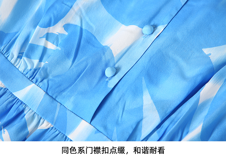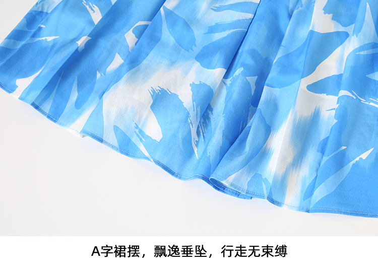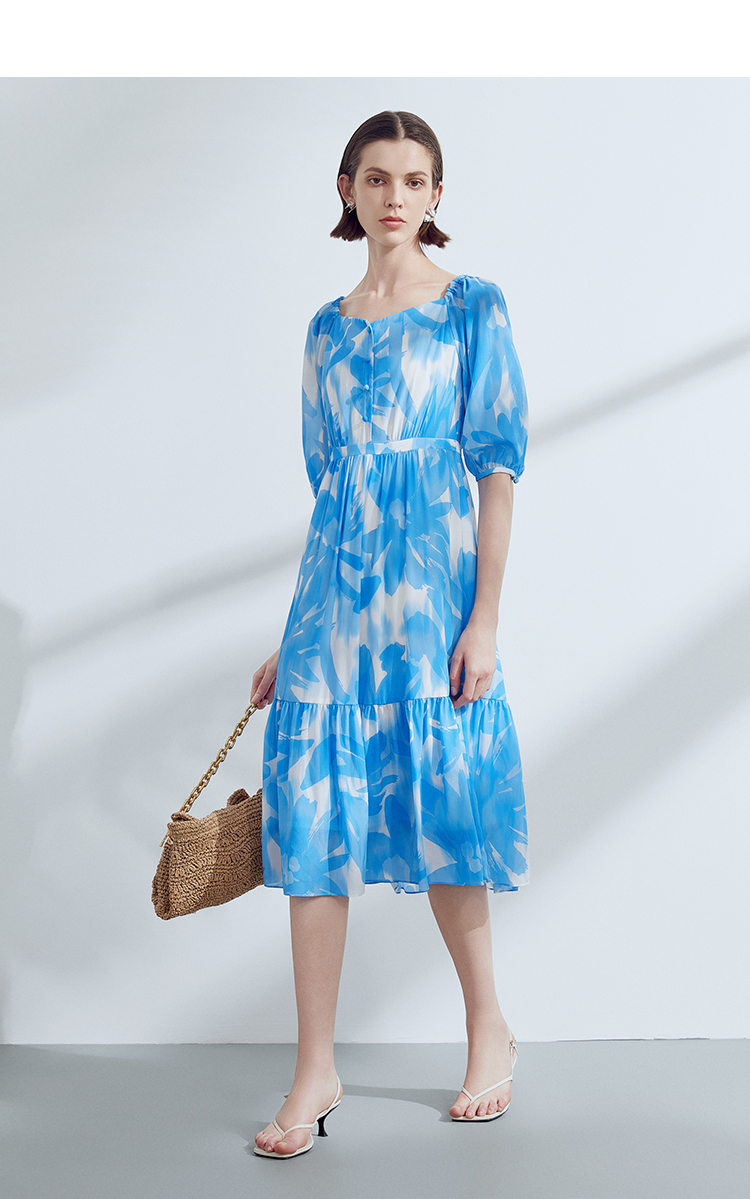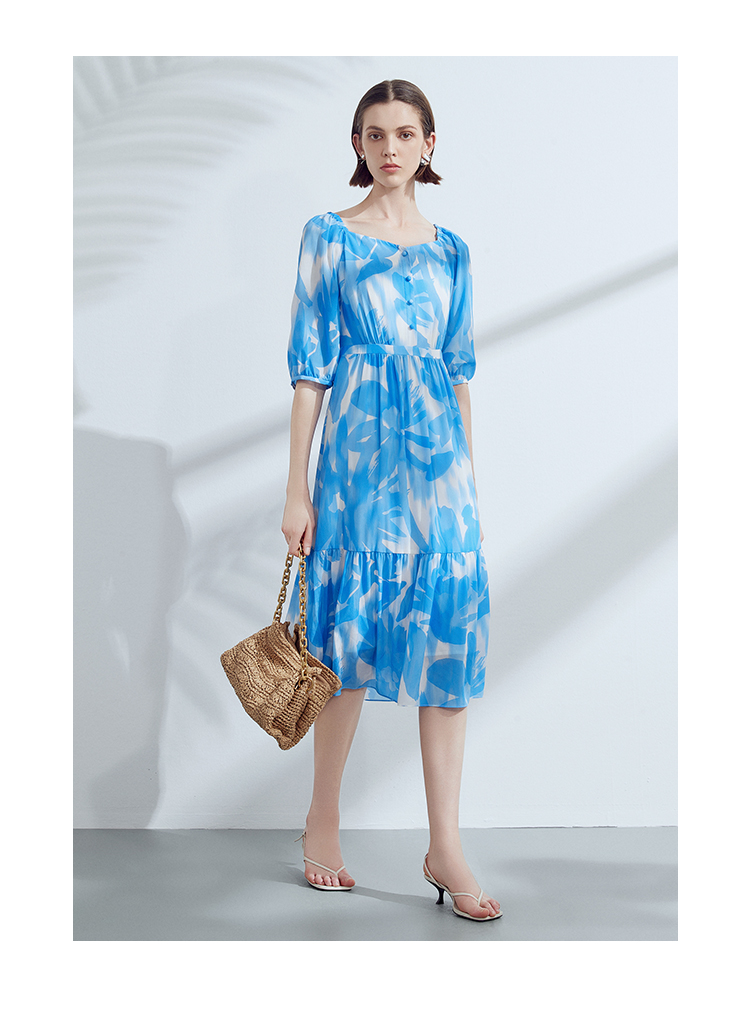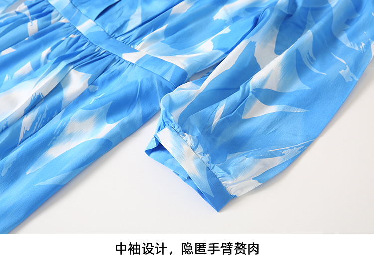 EITIE爱特爱夏季新款显瘦高腰洋气桃心领五分袖印花连衣裙7807566