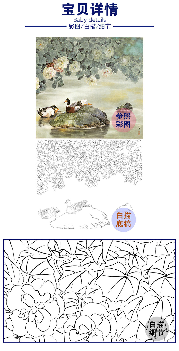 工笔花鸟动物白描底稿-邹传安-黑头鸭-芙蓉花鸭子-斗方小品册页-A293