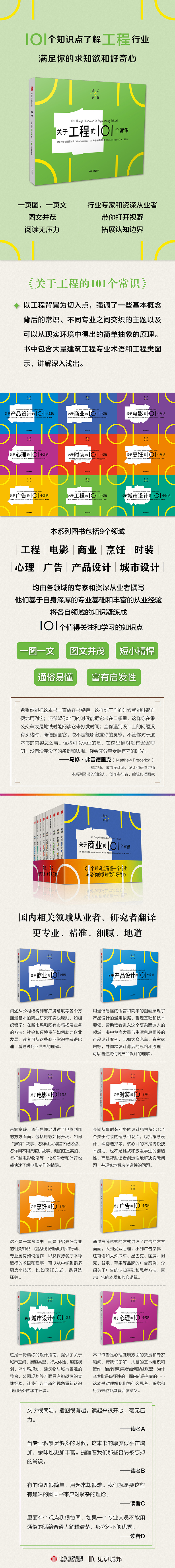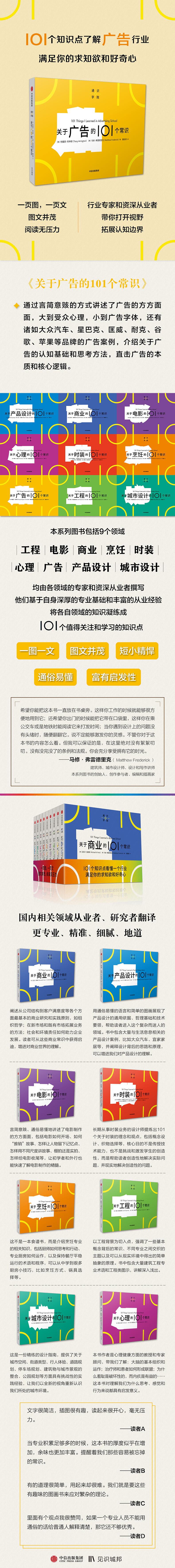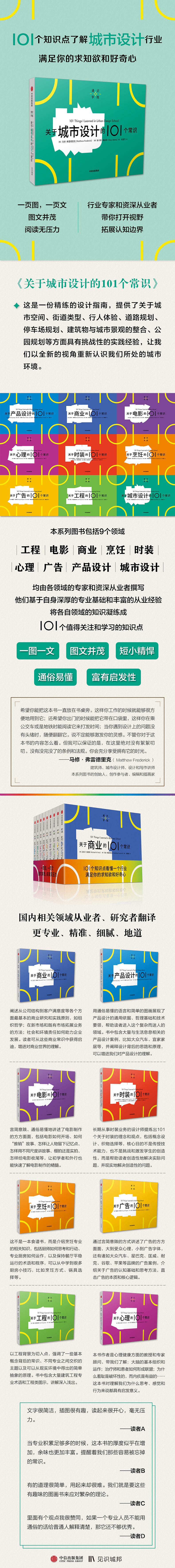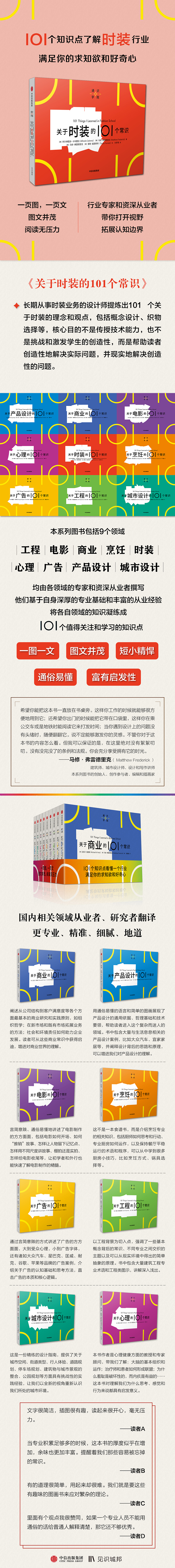 通识学院系列包括工程、电影、商业、烹饪、时装、心理、广告、产品设计、城市设计9个领域,由各领域的专家和资深从业者撰写。他们基于自身深厚的专业基础和丰富的从业经验,将各自领域的知识凝练成101个值得关注和学习的知识点。每个知识点以一页图一页文的形式呈现,图文并茂、短小精悍、通俗易懂,富有启发性。