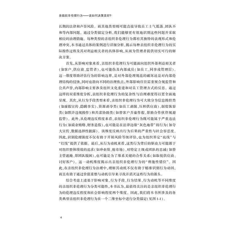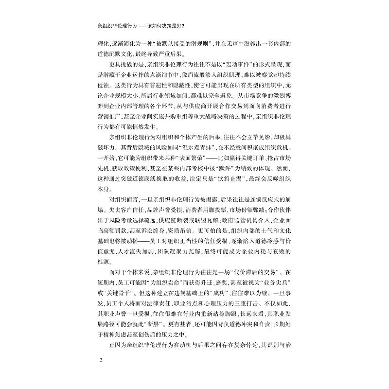 本书为国家自然科学基金面上项目(71772158)“服务型组织中授权型领导对亲组织非伦理行为的影响”课题研究成果。本书聚焦工作场所中存在着的大量亲组织非伦理行为,特别是数字经济背景下出现的许多为了组织快速发展而产生的非伦理决策和行动,针对这些行为给出表现描述、成因分析、潜在问题、应对策略等具体分析,旨在引发读者们对出现在身边却常常被忽视的非伦理决策和行为的高度重视,促动读者们尝试思考自己应该如何回应这些伦理困境或挑战,鼓励读者们在未来工作和生活实践中,积极开展有益的伦理反思,践行伦理决策,彰显伦理领导力。
