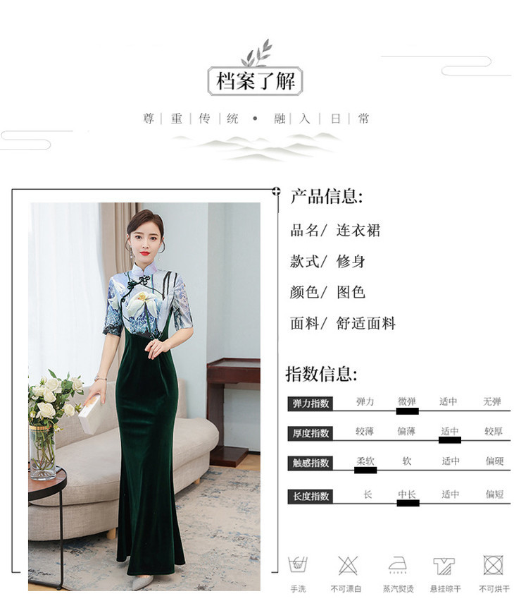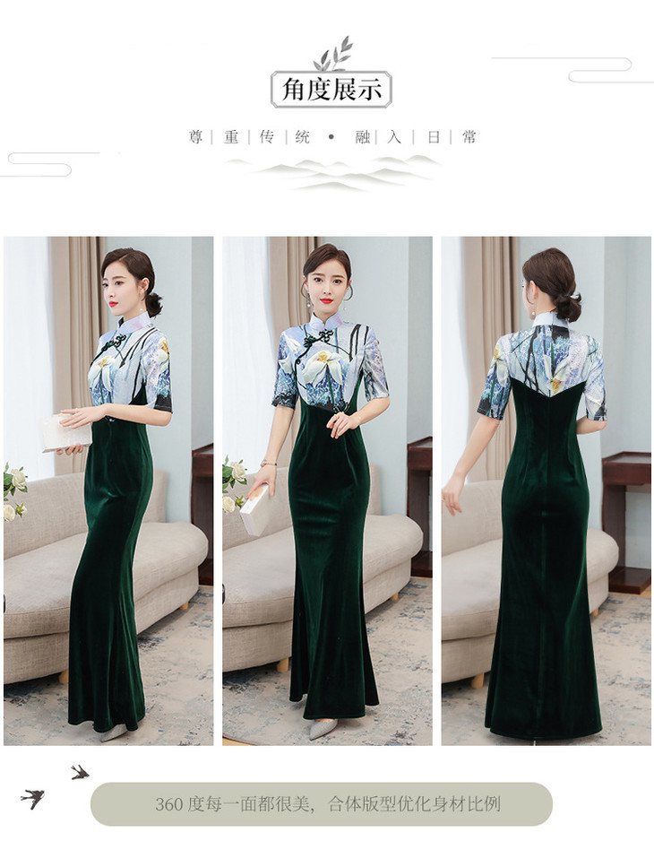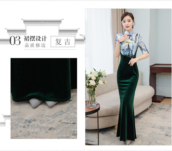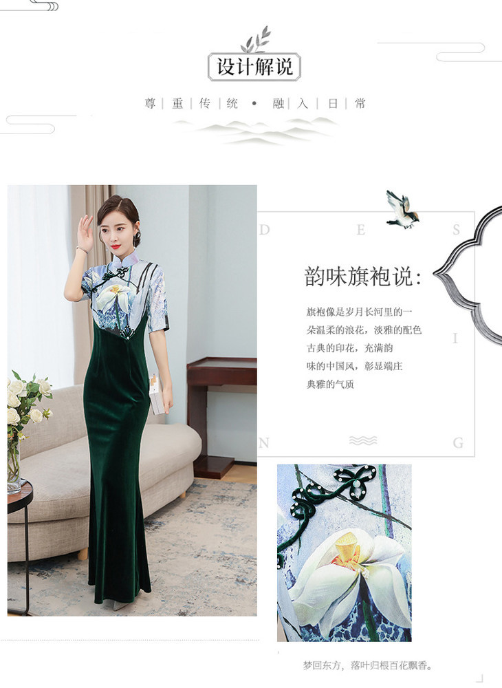 HT-N-A50-5313春装新款时尚修身七分袖丝绒鱼尾旗袍裙