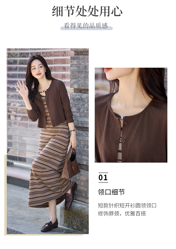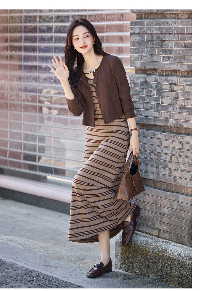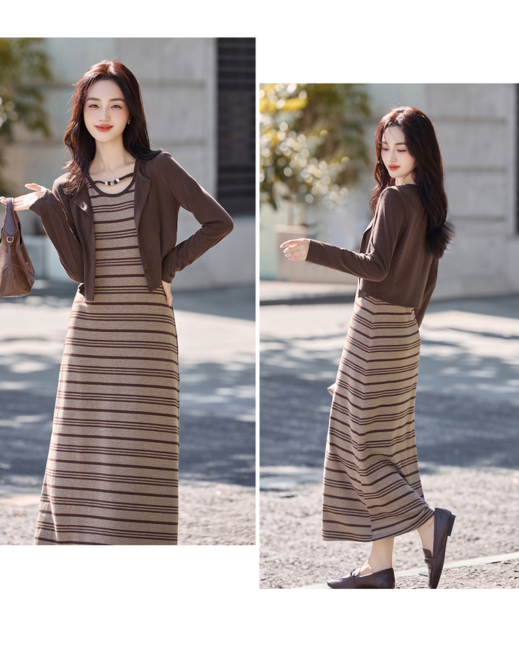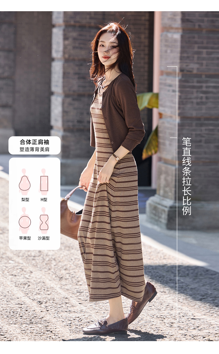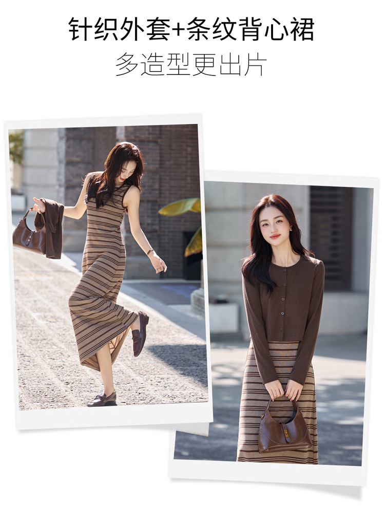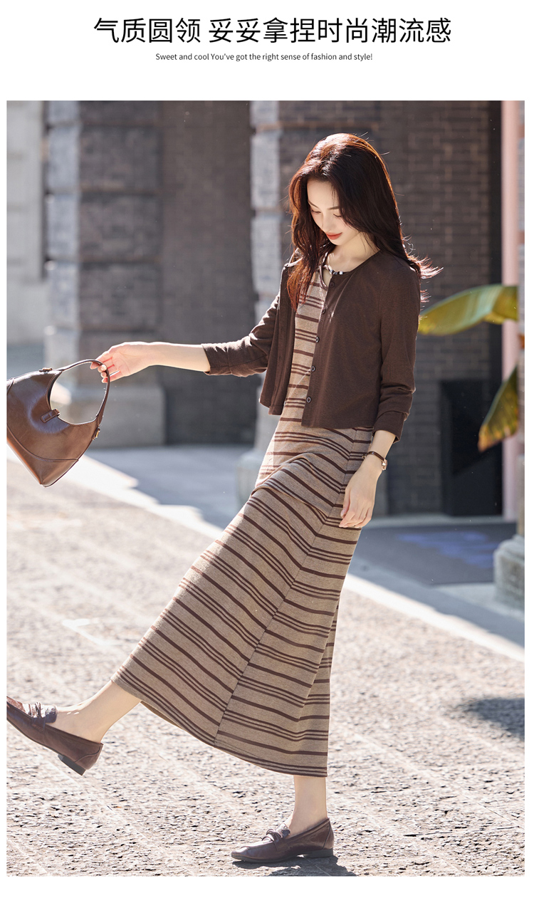 韩系气质条纹连衣裙套装,洋气减龄显瘦开衫背心裙两件套HR-HHYS8677