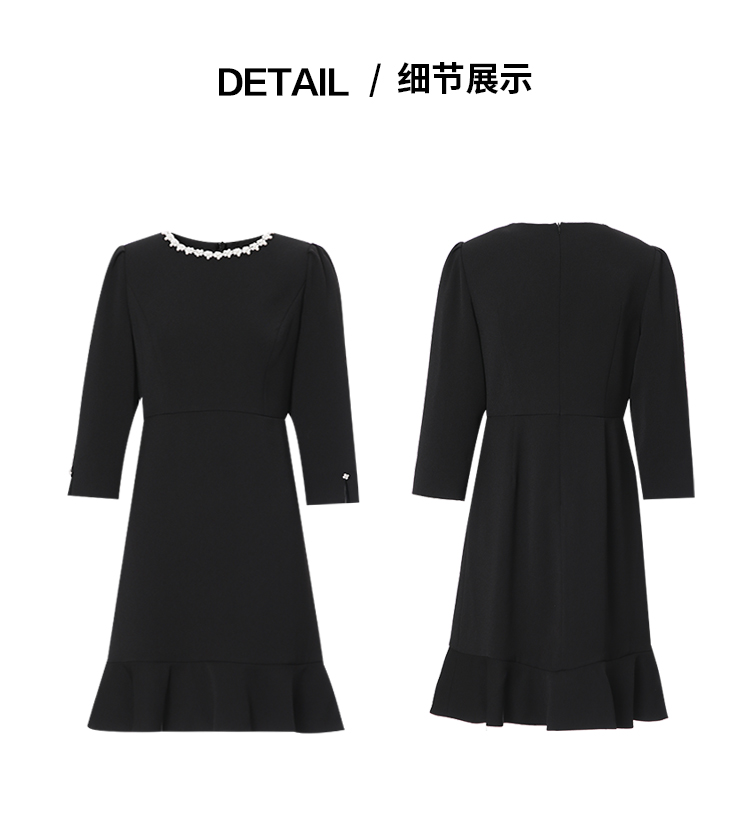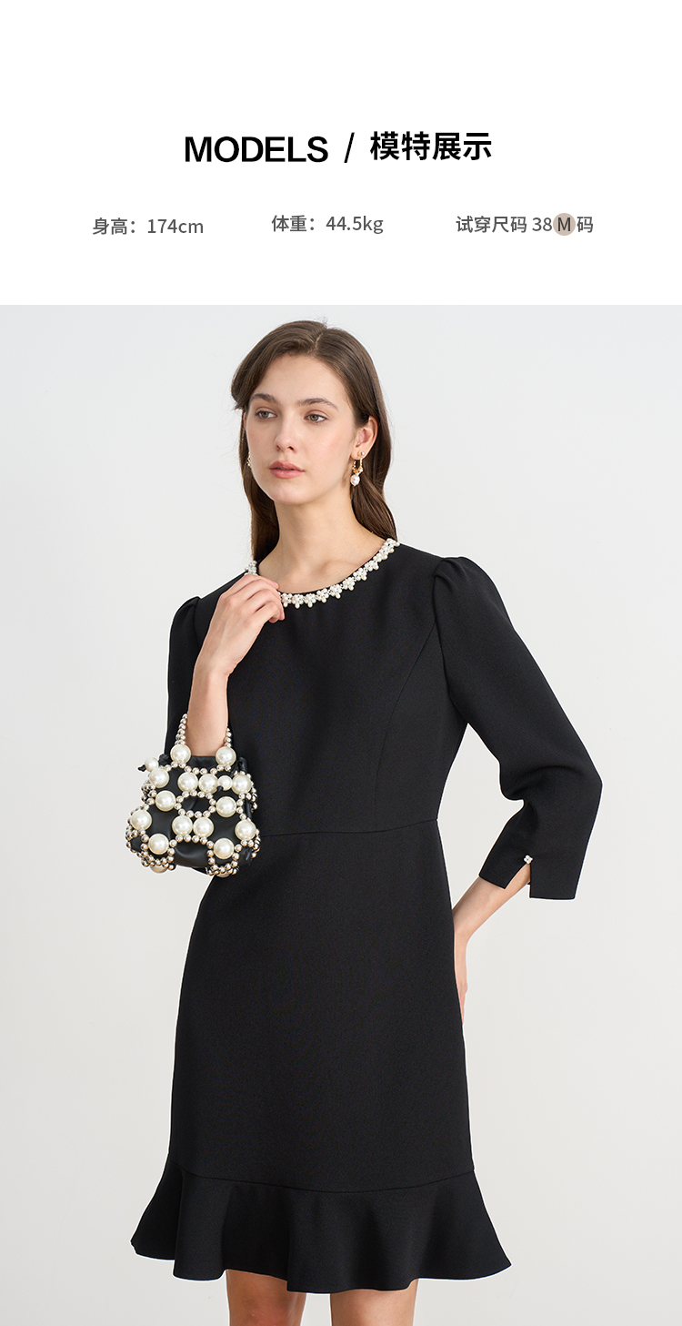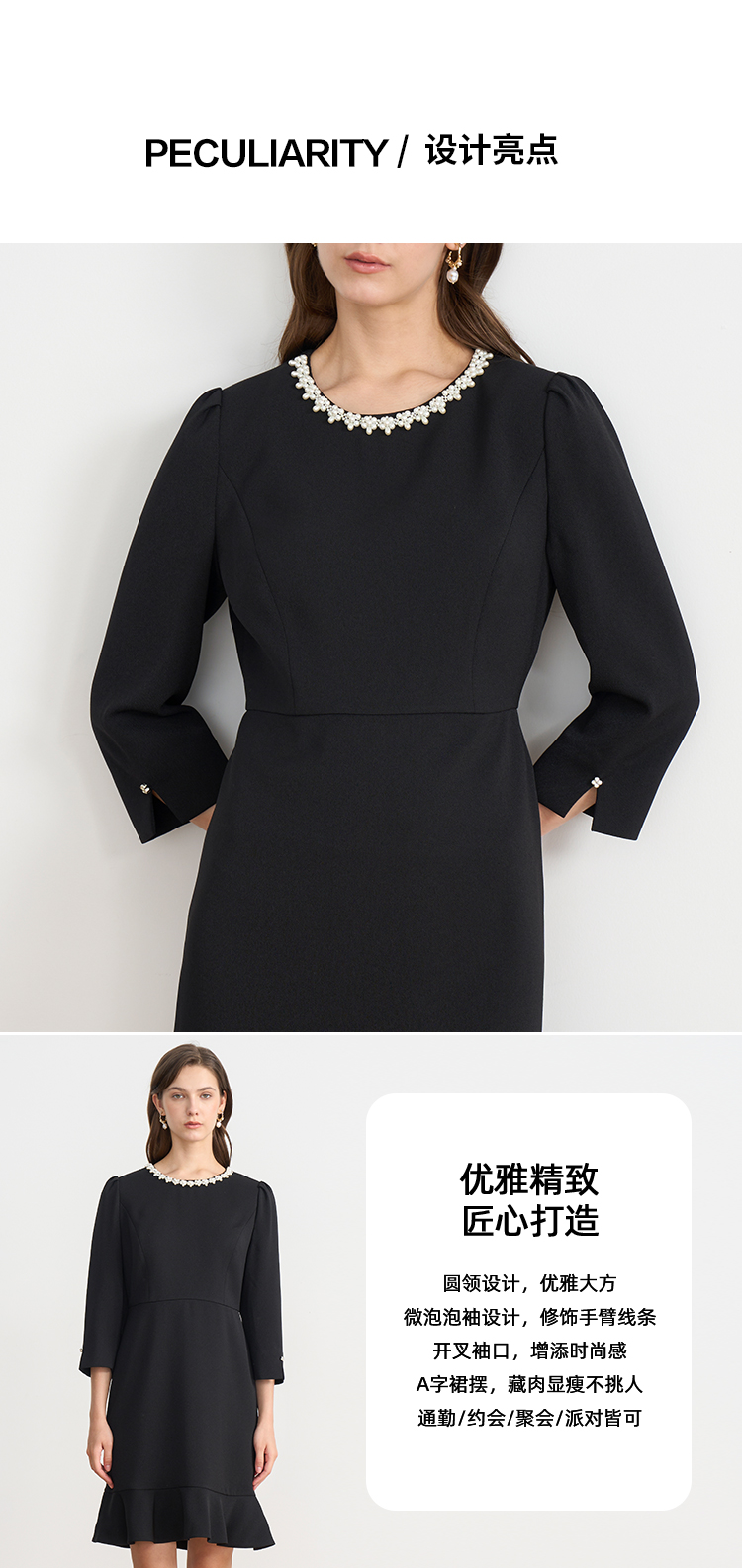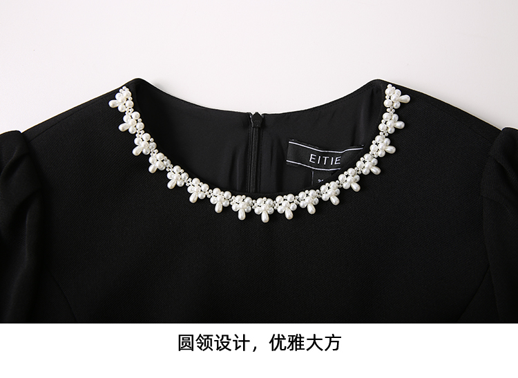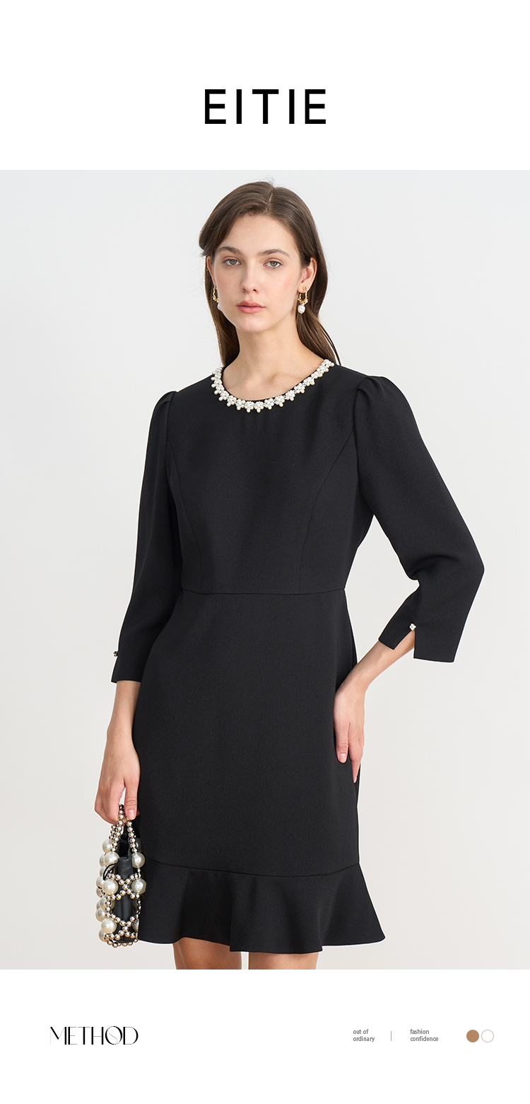 EITIE爱特爱千金气质钉珠圆领小香风鱼尾黑色2025秋季新款连衣裙C2507826
