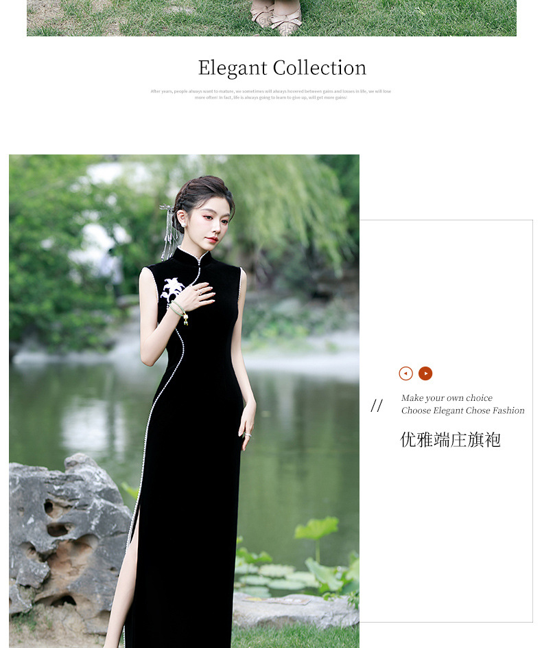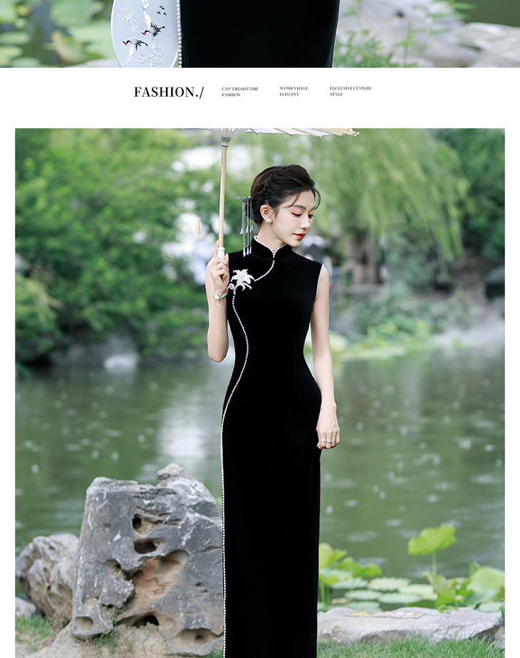 修身形体礼仪珍珠丝绒复古修身演出走秀旗袍YD4502