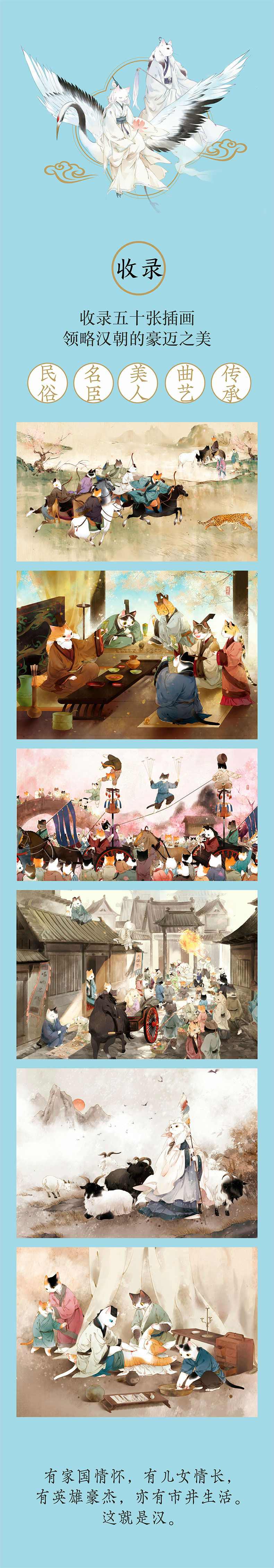 本画集以猫拟人,用千姿百态的猫咪演绎汉朝的民风民俗、名臣将士、绝代佳人、一代曲艺、文化传承以及等内容,分为【民俗】【名臣】【美人】【曲艺】【传承】五大部分,展现独特的汉朝风貌。插画吸取古代工笔和水墨画的特点,借用知名的古画作场景构图,展现汉朝的强悍与柔情。特邀众多作者为插画撰写小短文,佐以《史记》《汉书》《后汉书》《西京杂记》等古籍中的相关记载,详尽地解说了插画所描绘的典故,画集既有独特的画面感,又充满了知识的趣味性。