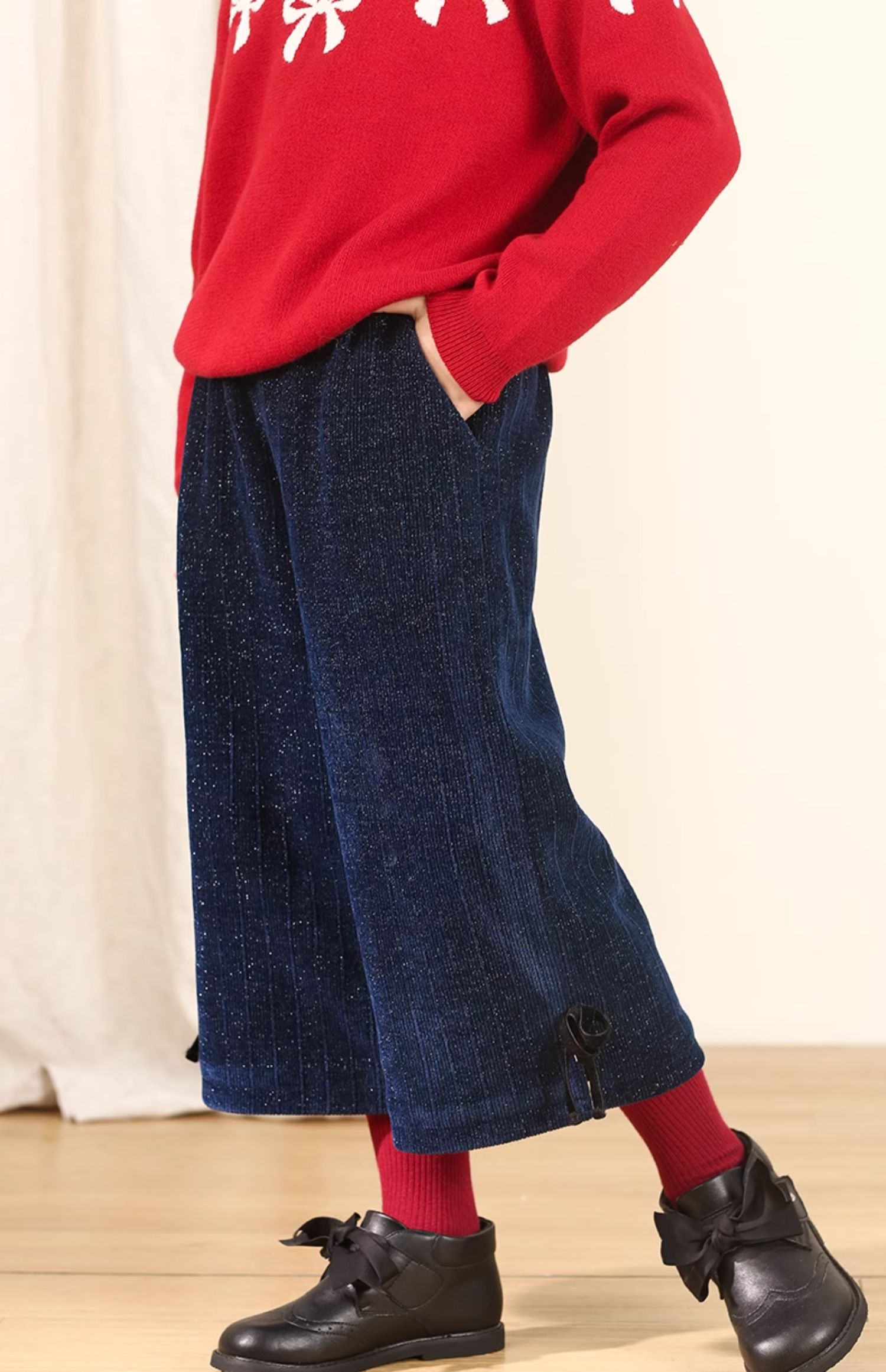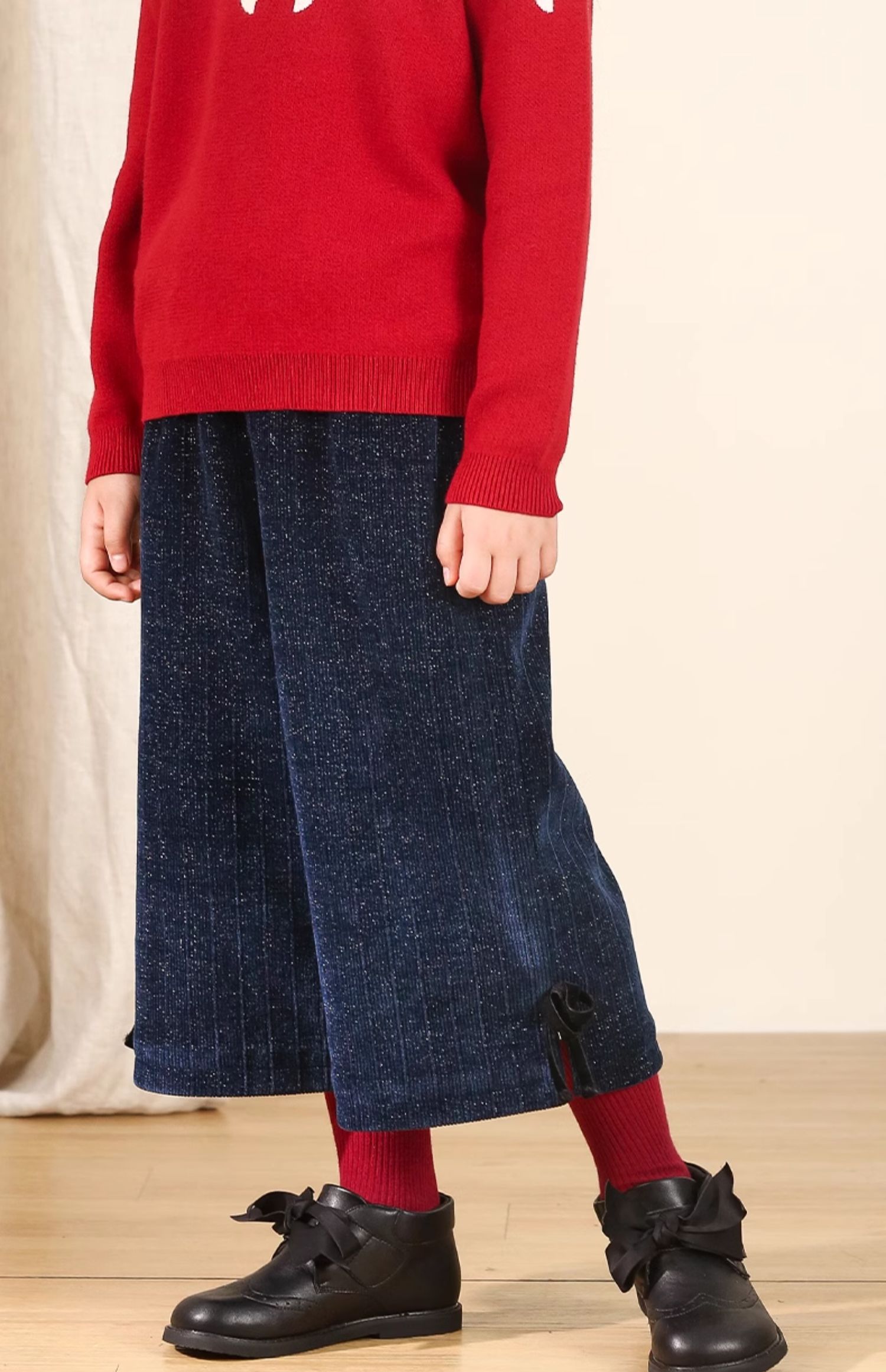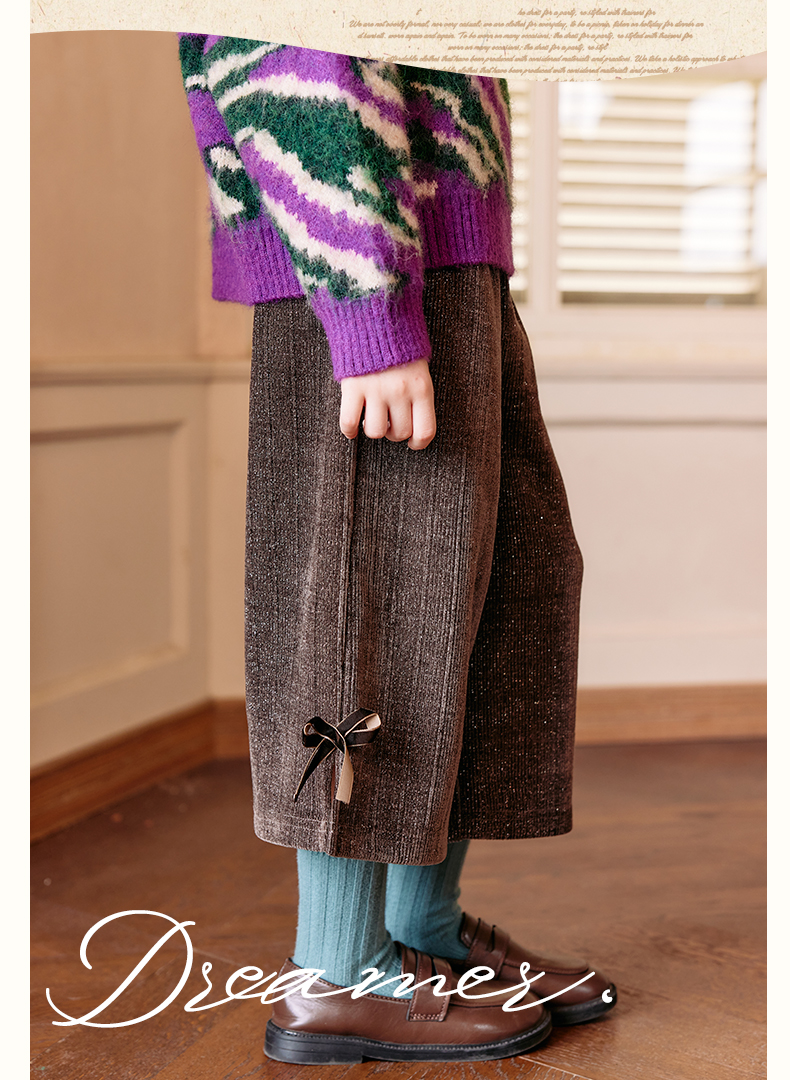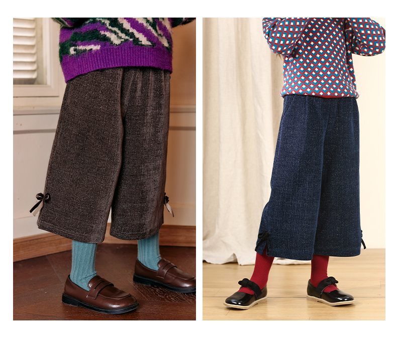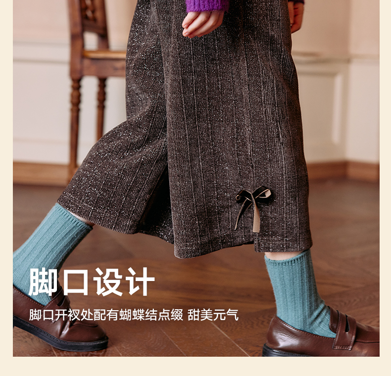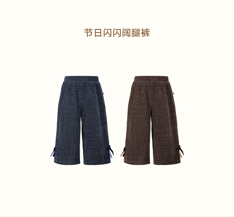LittleNaive秋冬款女童阔腿裤宽松蝴蝶结七分裤子亮丝儿童休闲裤